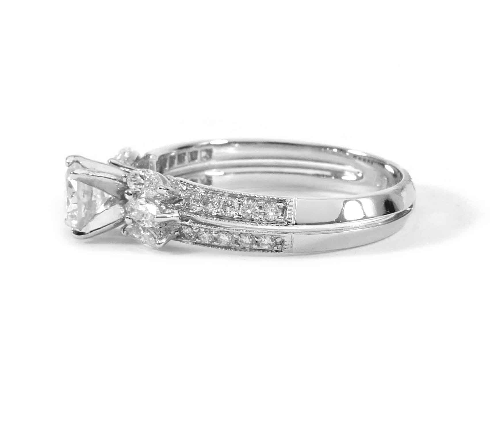 this beautiful engagement ring set holds 1.03 carats of diamonds total, set into solid 18k white gold. The center stone is .38ct, with the remaining surrounding stones being .68 carats total. On each side of the center stone, there are three marquise cut diamonds accentuating the main diamond on the ring.