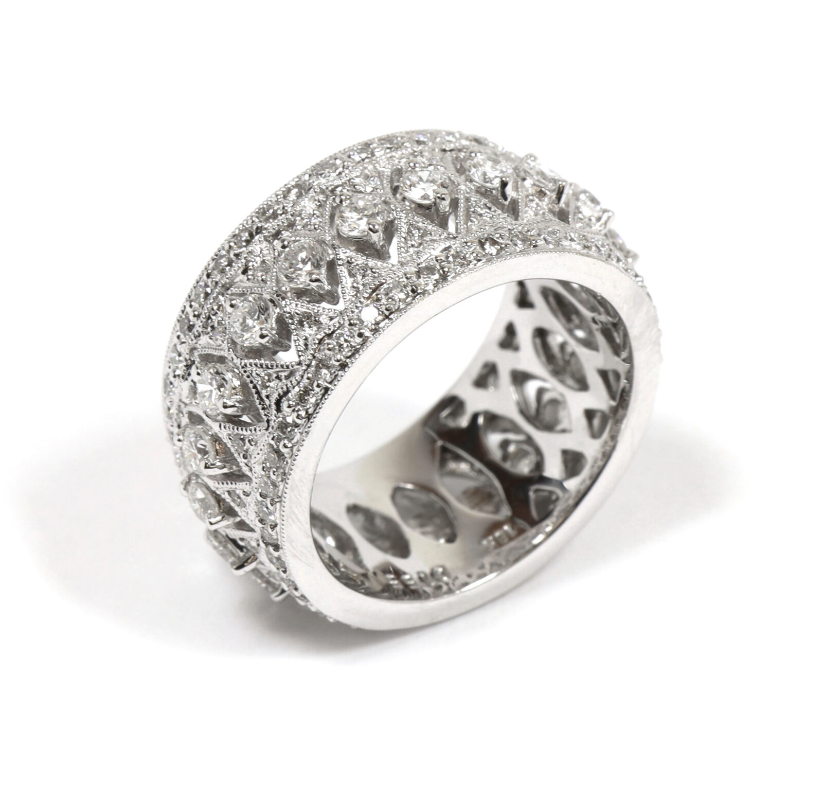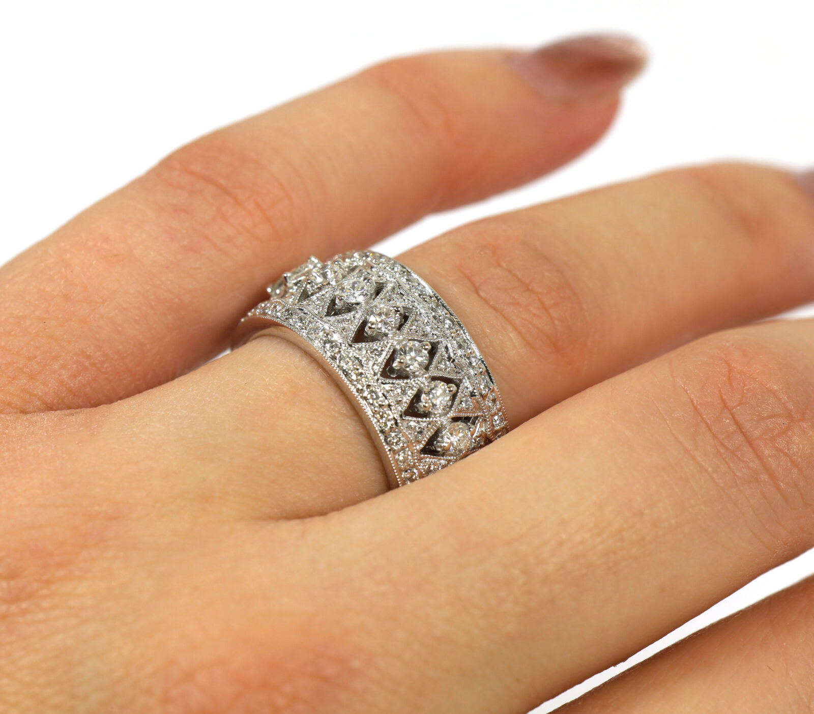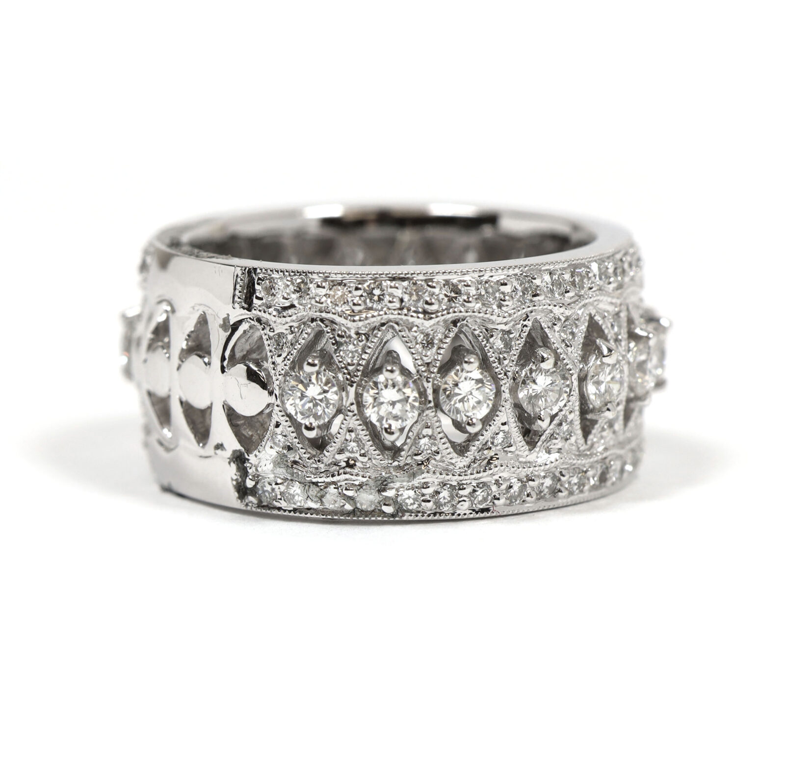Read Moremetal: 18k white gold ring size: 6.5 width: 10.4mm gemstone: diamond carat weight total: 1.50 carat cut: round clarity: vvs2/vs1 color: e/f buy with confidence from tns diamonds, a trusted and established jeweler with a brick-and-mortar storefront and over 40 years of combined experience in the ethical watch and jewelry trade. At tns diamonds, we are proud to have trusted gia graduate gemologists on staff, ensuring that every piece of jewelry meets the highest standards of quality and craftsmanship. With our expertise and commitment to ethical practices, you can shop with peace of mind knowing you’re receiving a genuine product. If you have any questions or need further assistance, please don’t hesitate to reach out!