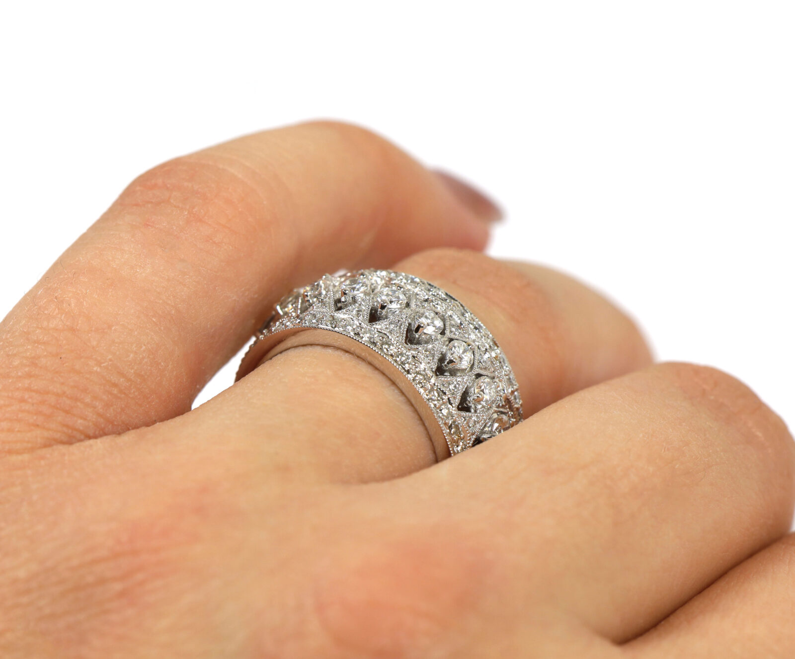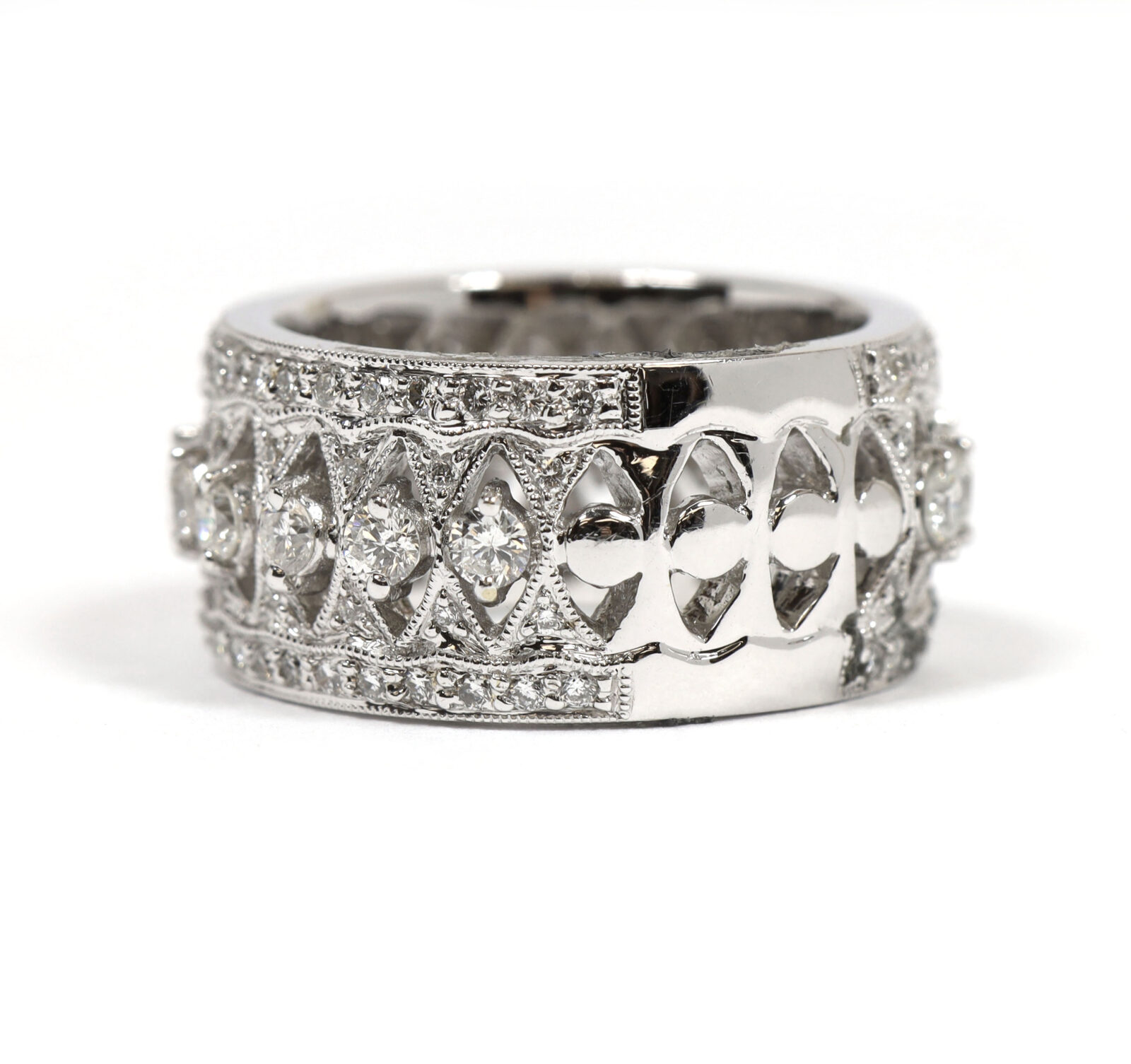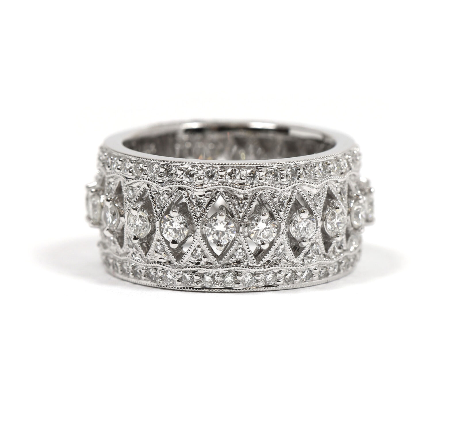 Read Moremetal: 18k white gold ring size: 6.5 width: 10.4mm gemstone: diamond carat weight total: 1.50 carat cut: round clarity: vvs2/vs1 color: e/f buy with confidence from tns diamonds, a trusted and established jeweler with a brick-and-mortar storefront and over 40 years of combined experience in the ethical watch and jewelry trade. At tns diamonds, we are proud to have trusted gia graduate gemologists on staff, ensuring that every piece of jewelry meets the highest standards of quality and craftsmanship. With our expertise and commitment to ethical practices, you can shop with peace of mind knowing you’re receiving a genuine product. If you have any questions or need further assistance, please don’t hesitate to reach out!