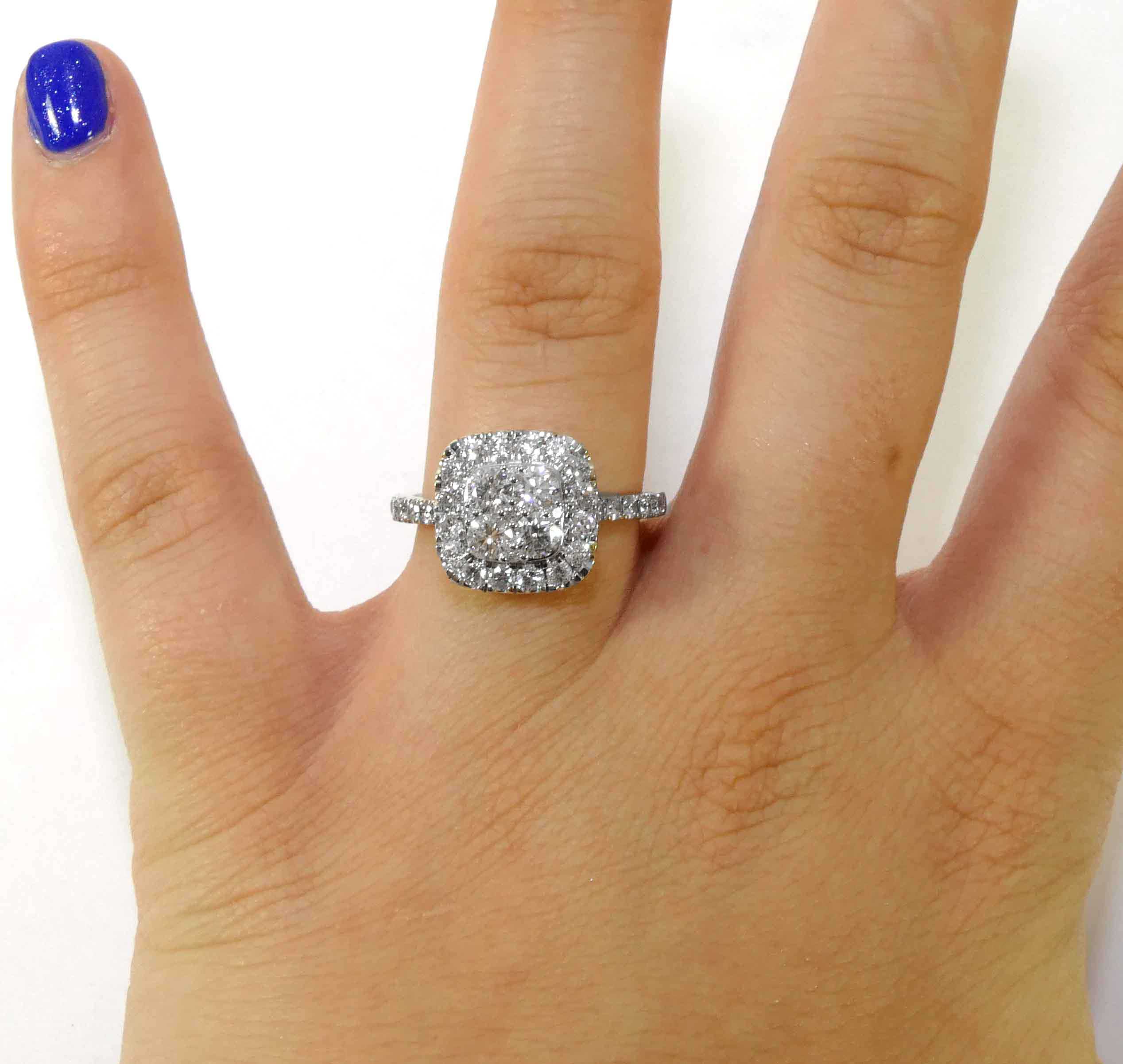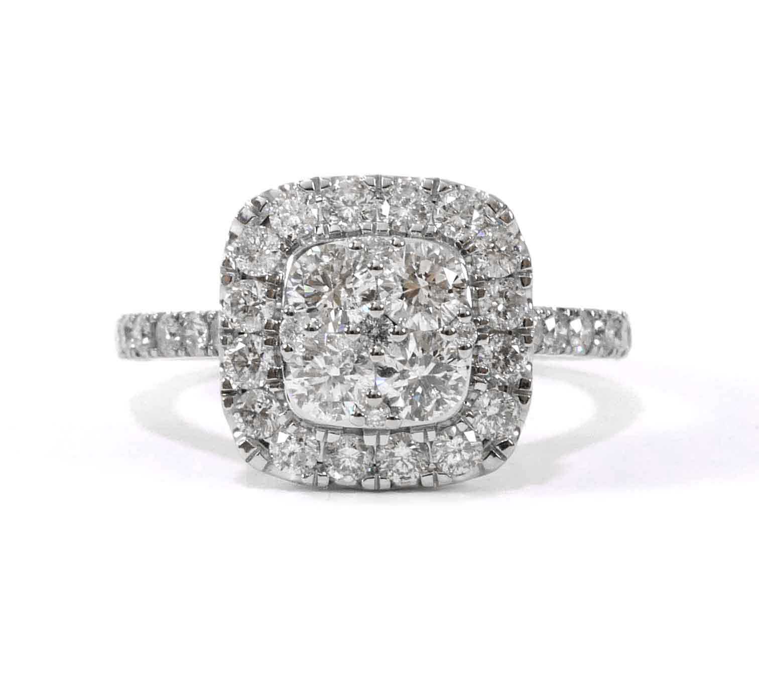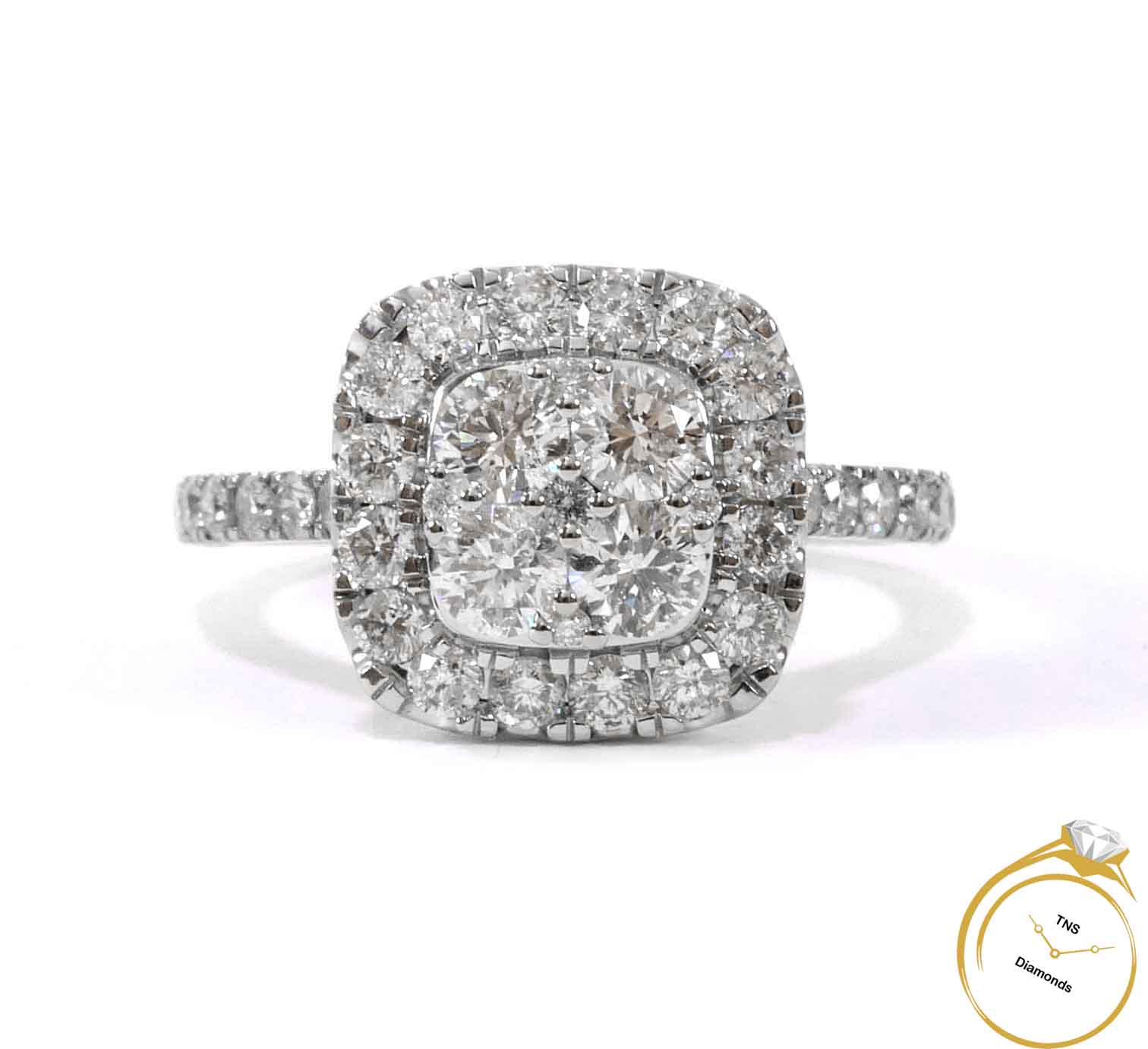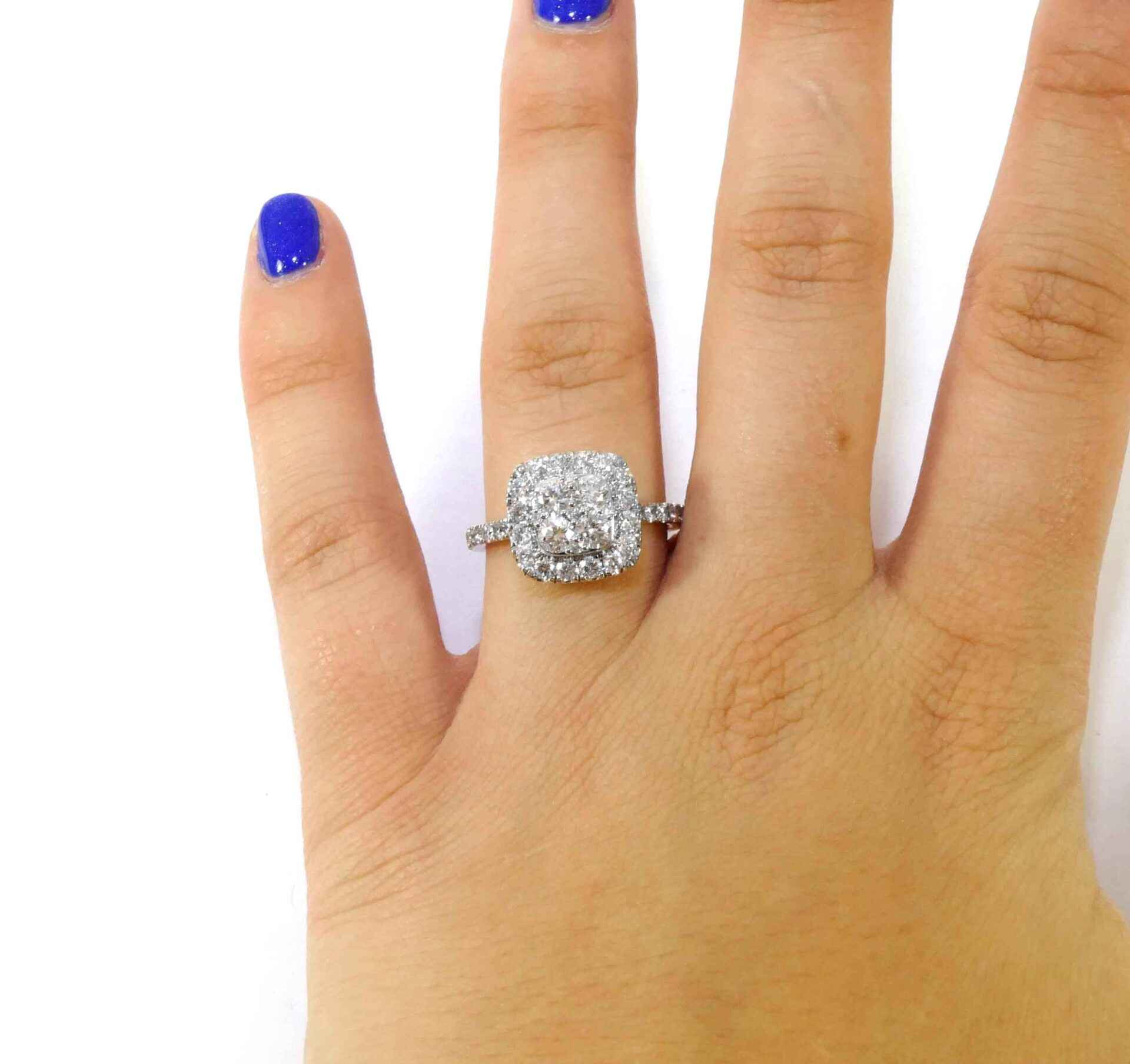 this beautiful engagement ring set holds a cluster of 1.50 carats of diamonds total, set into solid 14k white gold. There are 1.50 carats total of si1/g quality diamonds, with a cushion style halo setting for them to sit securely in.