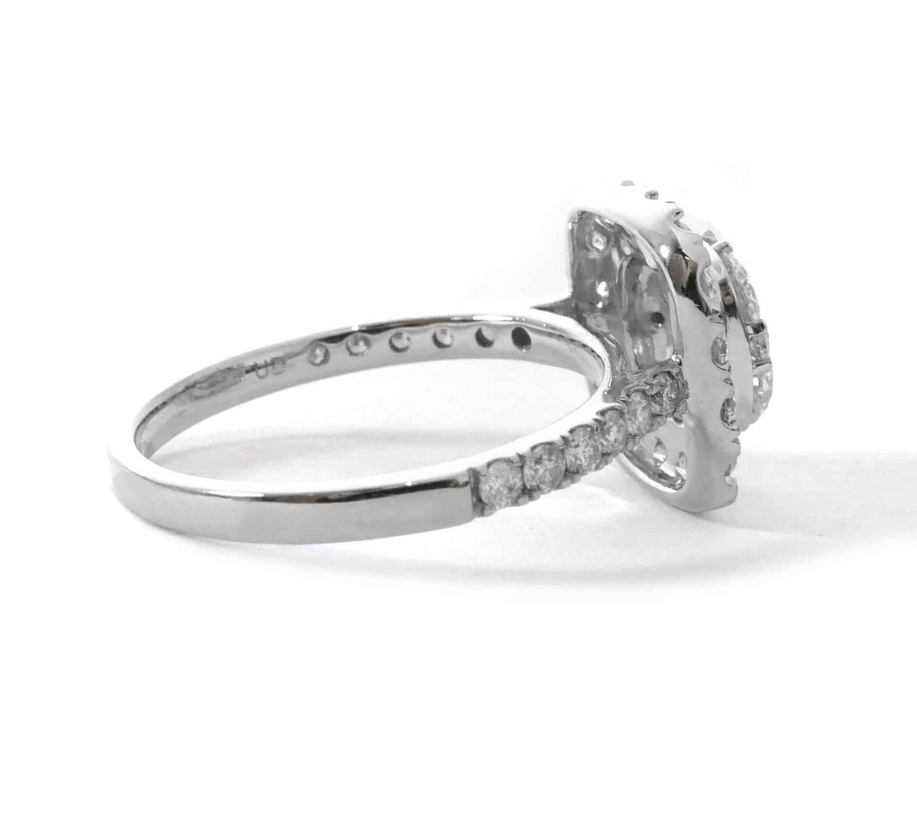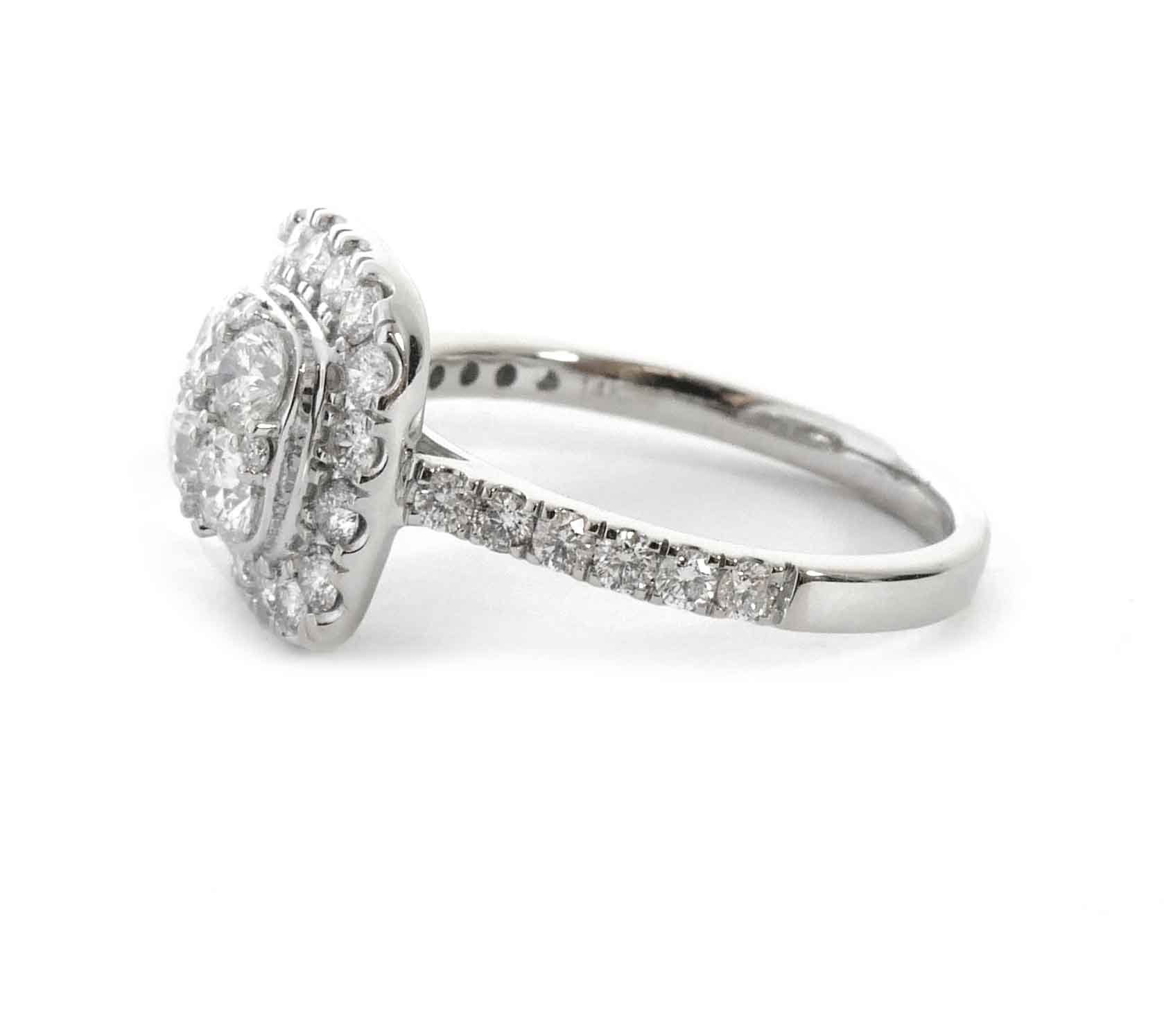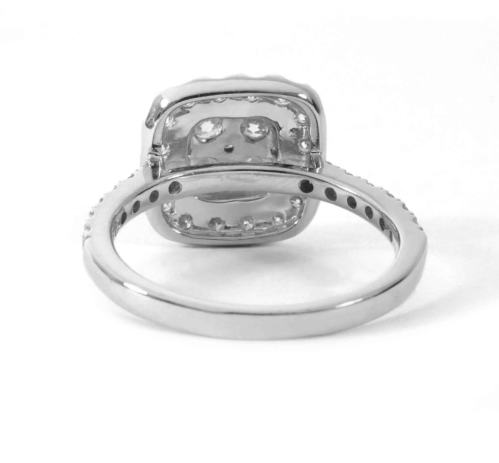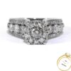 this beautiful engagement ring set holds a cluster of 1.50 carats of diamonds total, set into solid 14k white gold. There are 1.50 carats total of si1/g quality diamonds, with a cushion style halo setting for them to sit securely in.