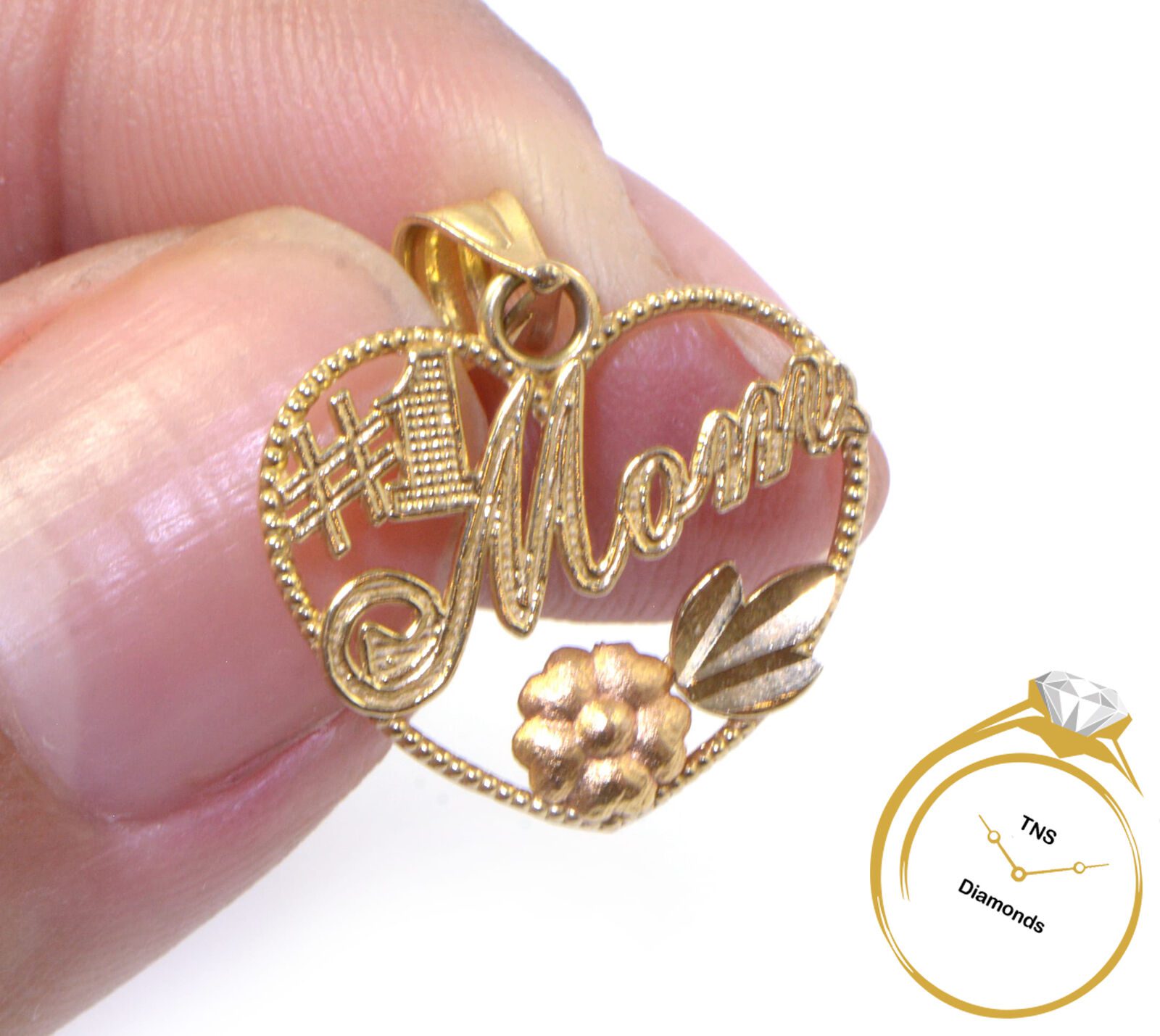 Product Description: This creative #1 Mom Necklace Charm is crafted in 14k Yellow Gold. It weighs 1.18 grams.The widest part is 0.7 of an inch, and from top to bottom is 0.6 of an inch. This pendant makes a classic gift. The chain is not inc...