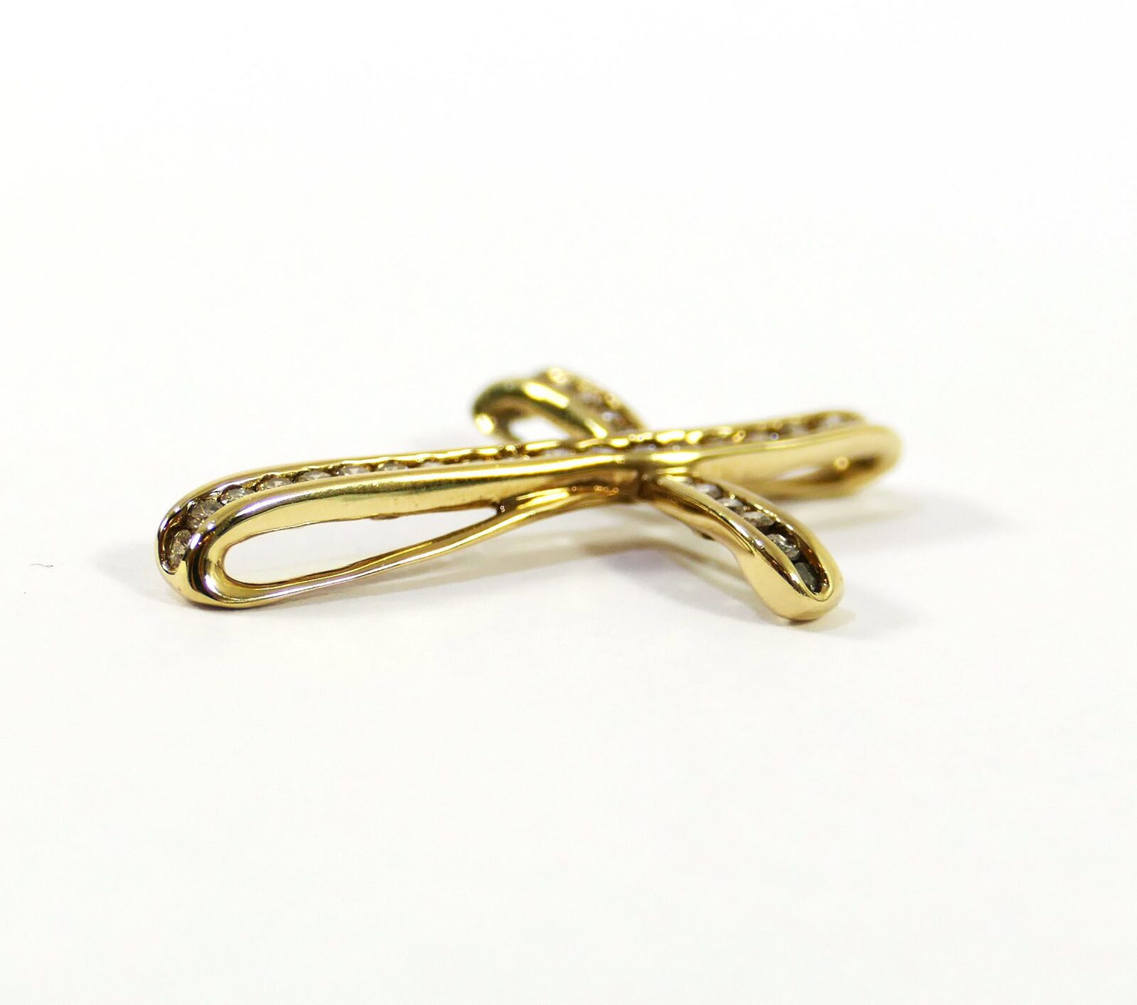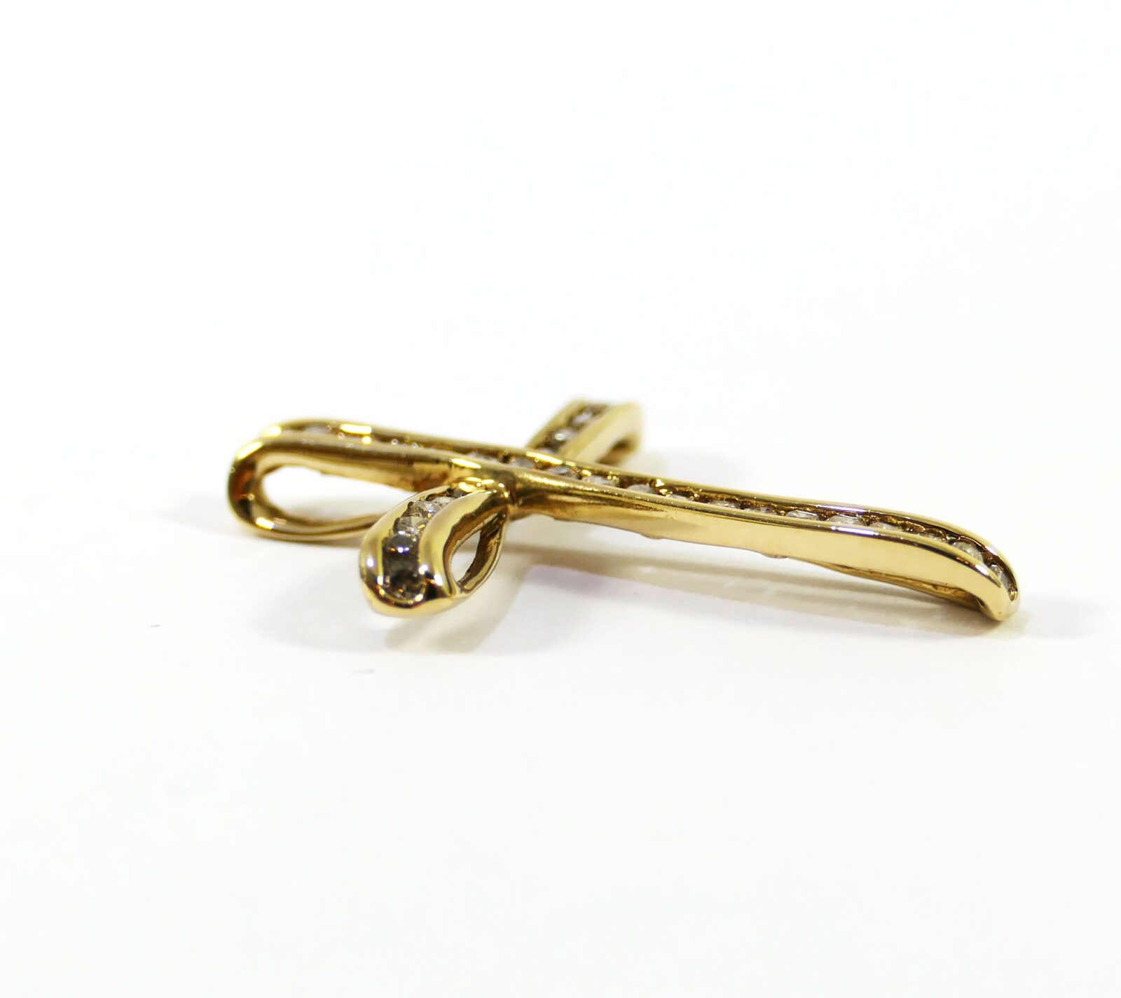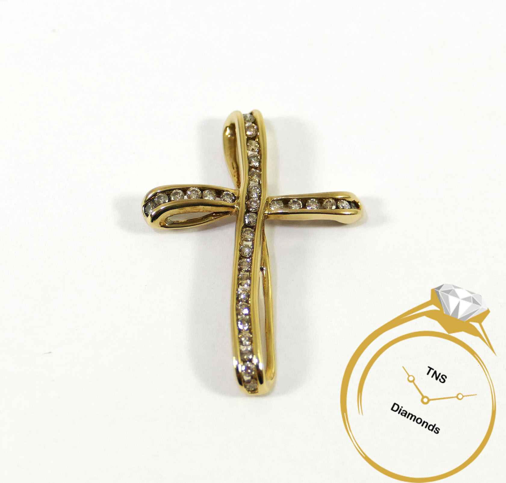 this pendant is crafted in 10k yellow gold and diamonds, and is shaped as a cross. the size of the pendant is 32.5x23mm and the pendant weighs 2.3 grams.
