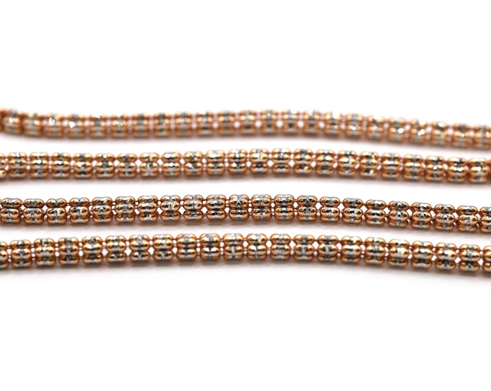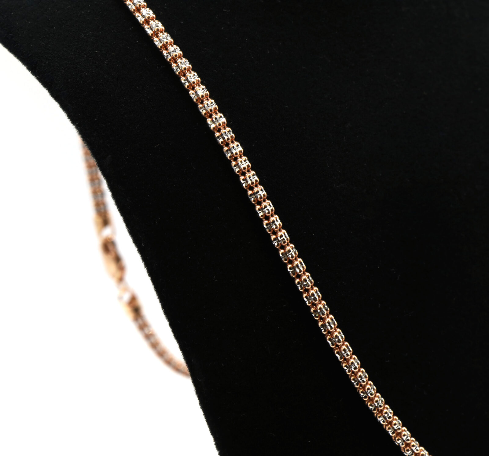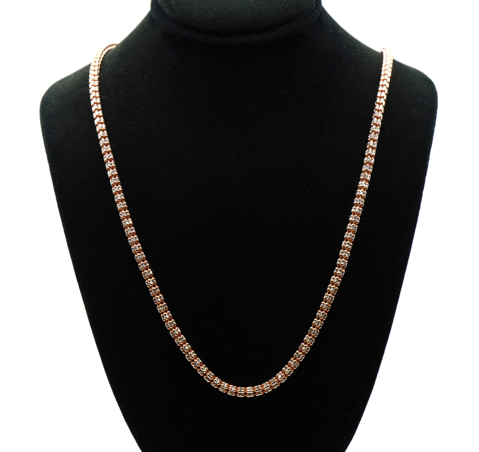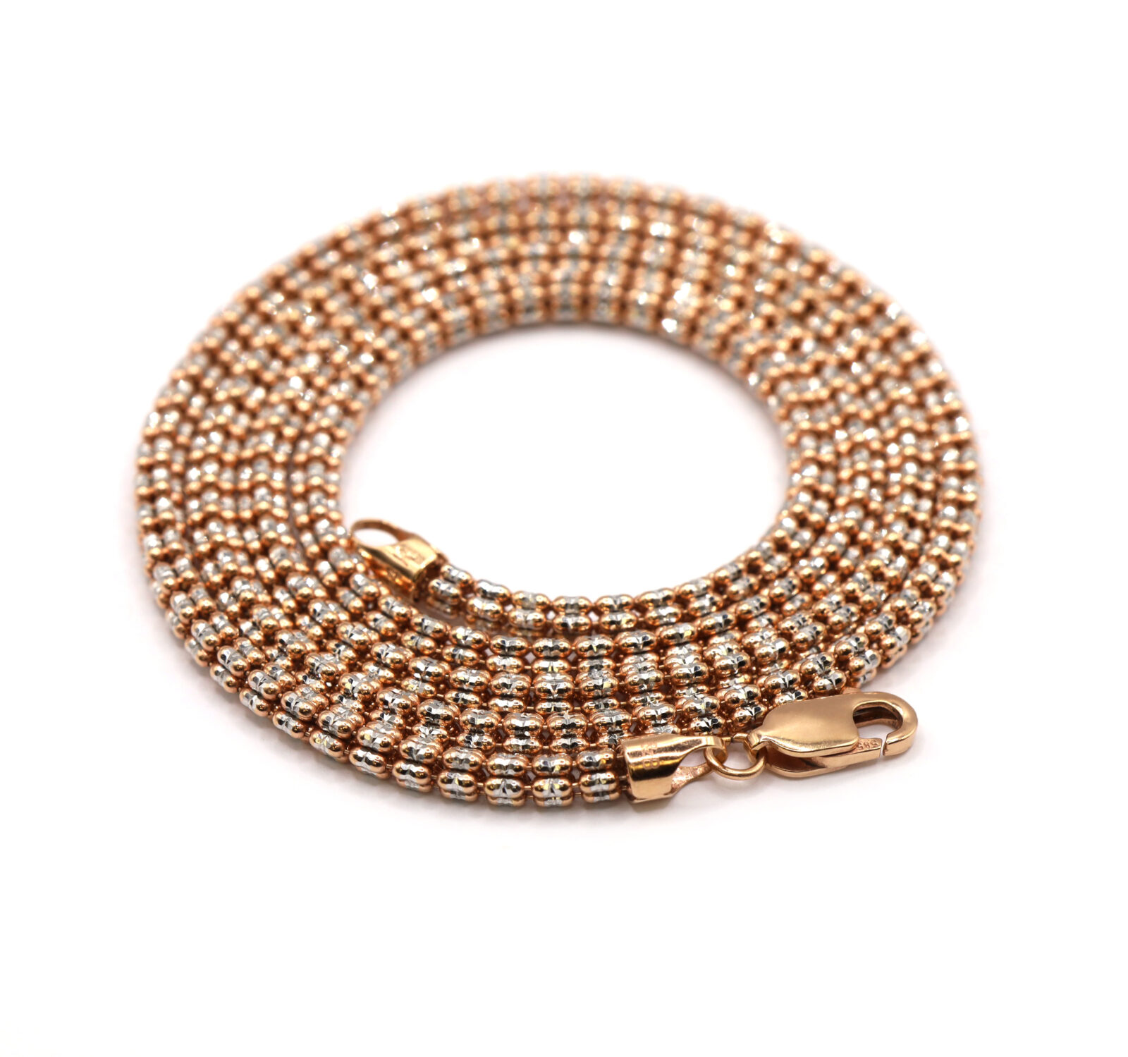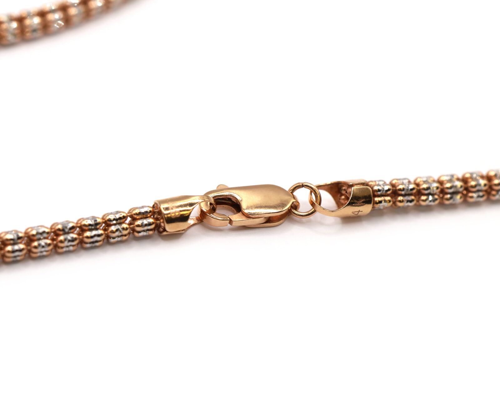 metal: 14k rose and white gold length: 24 inches type: ice diamond cut link weight: 20.1 grams width: 3.5mm clasp: lobster clasp