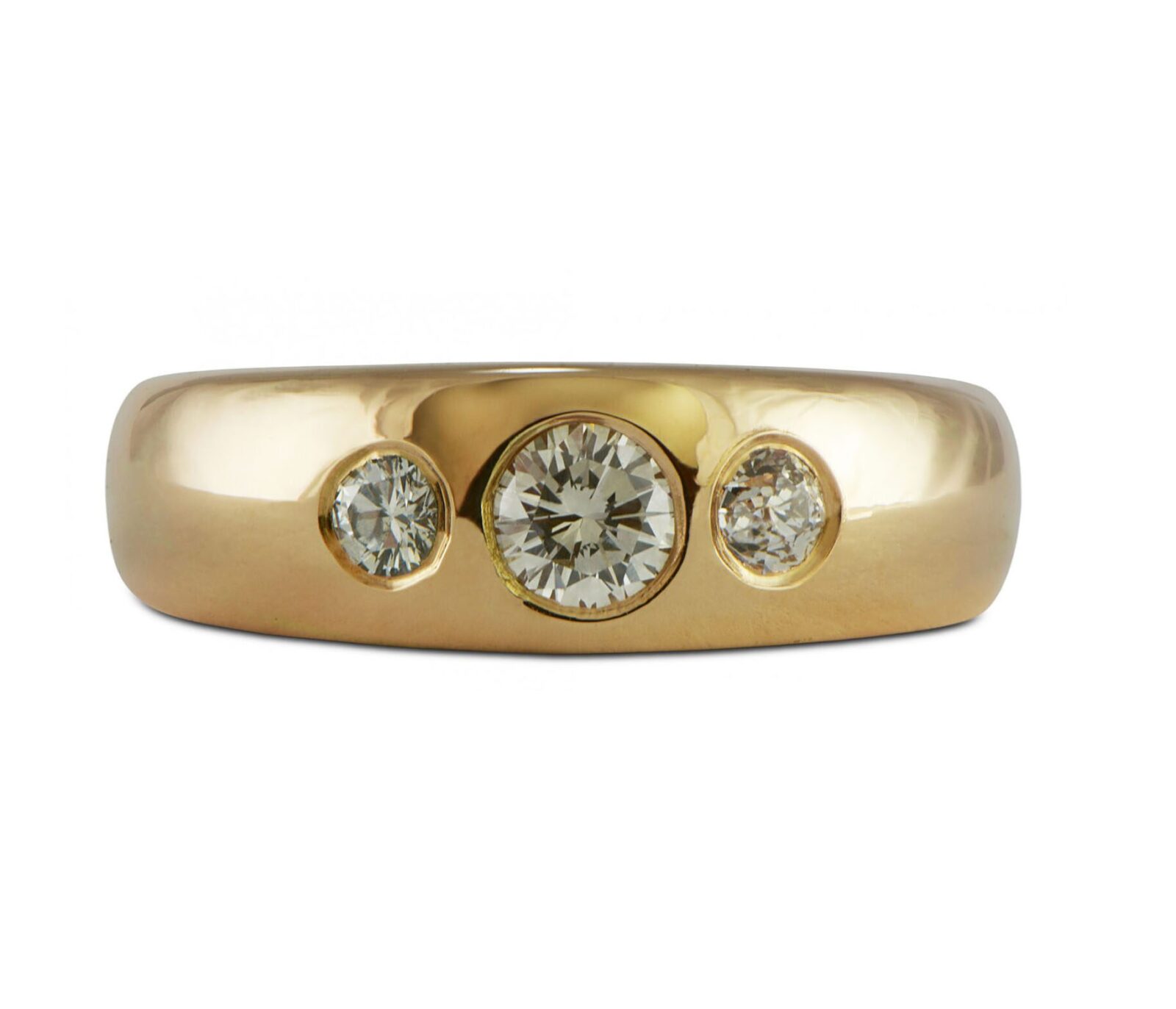 this stunning 14 karat rose gold ring features gipsy set diamonds along the top of the ring. The total diamond weight is .38 carats and is si clarity and h color.