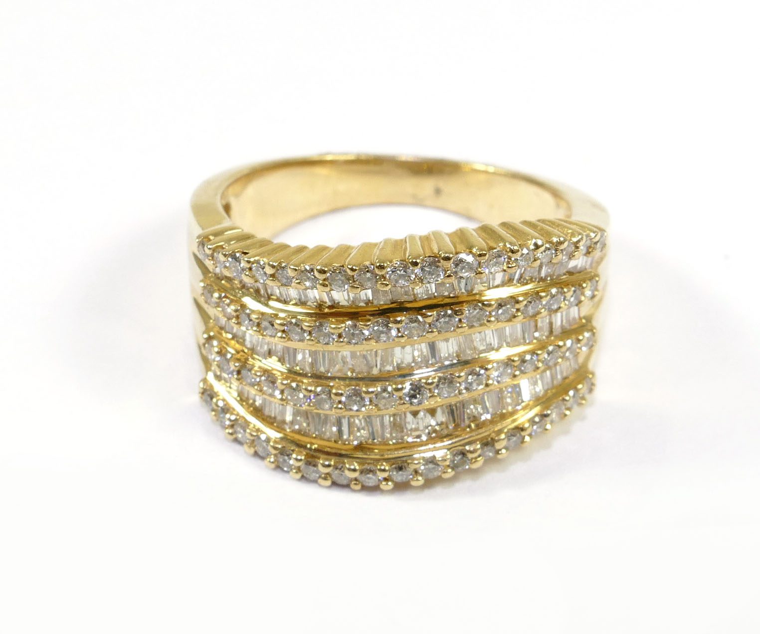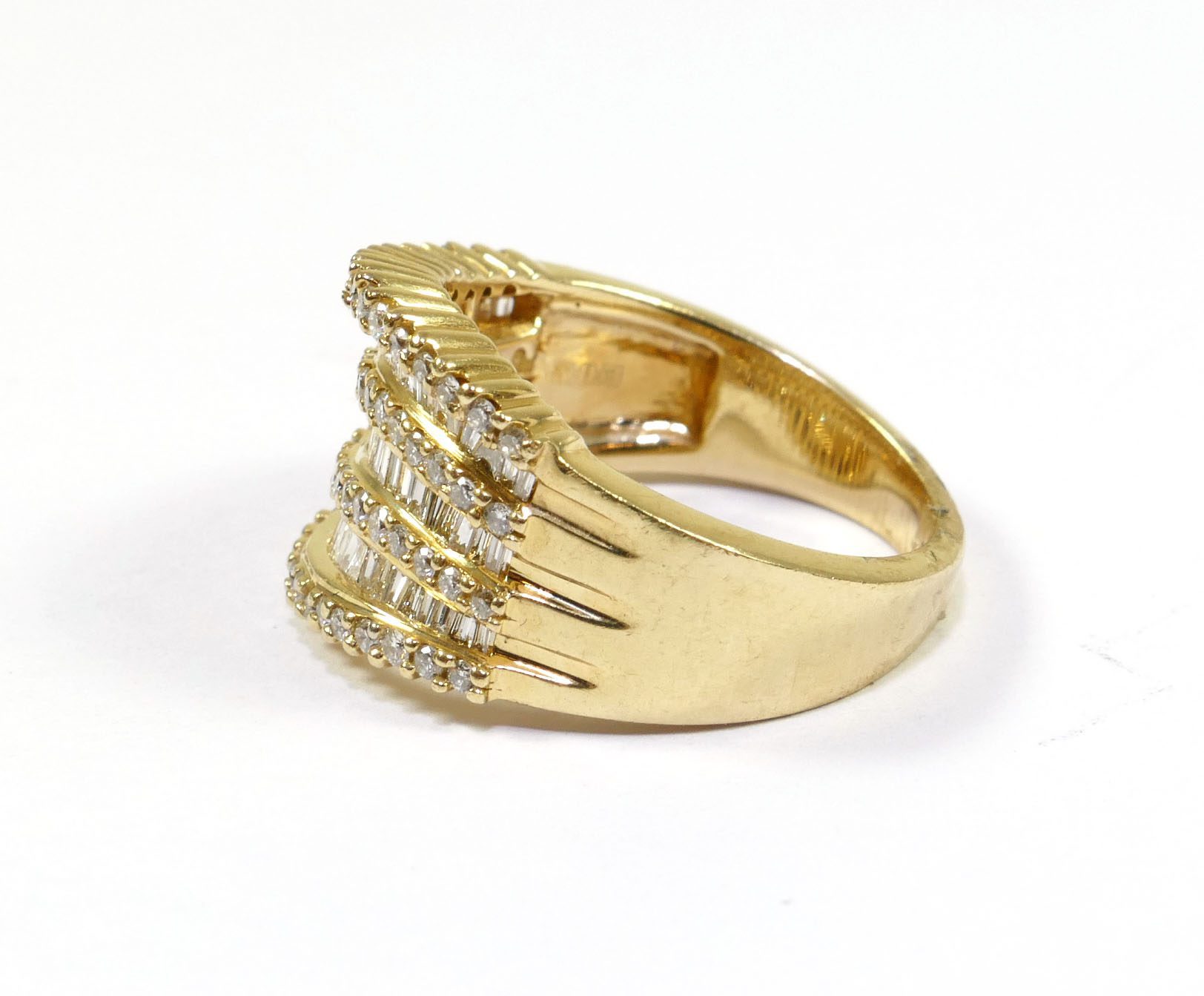 Ring Size: 7-7.25 Material: 14k Yellow Gold Stone: Natural Genuine Diamonds - Round/Baguette Cut - Clarity SI1-2 - Color H Ring Width: The back of the ring is 3mm, and the front is 12mm Read More