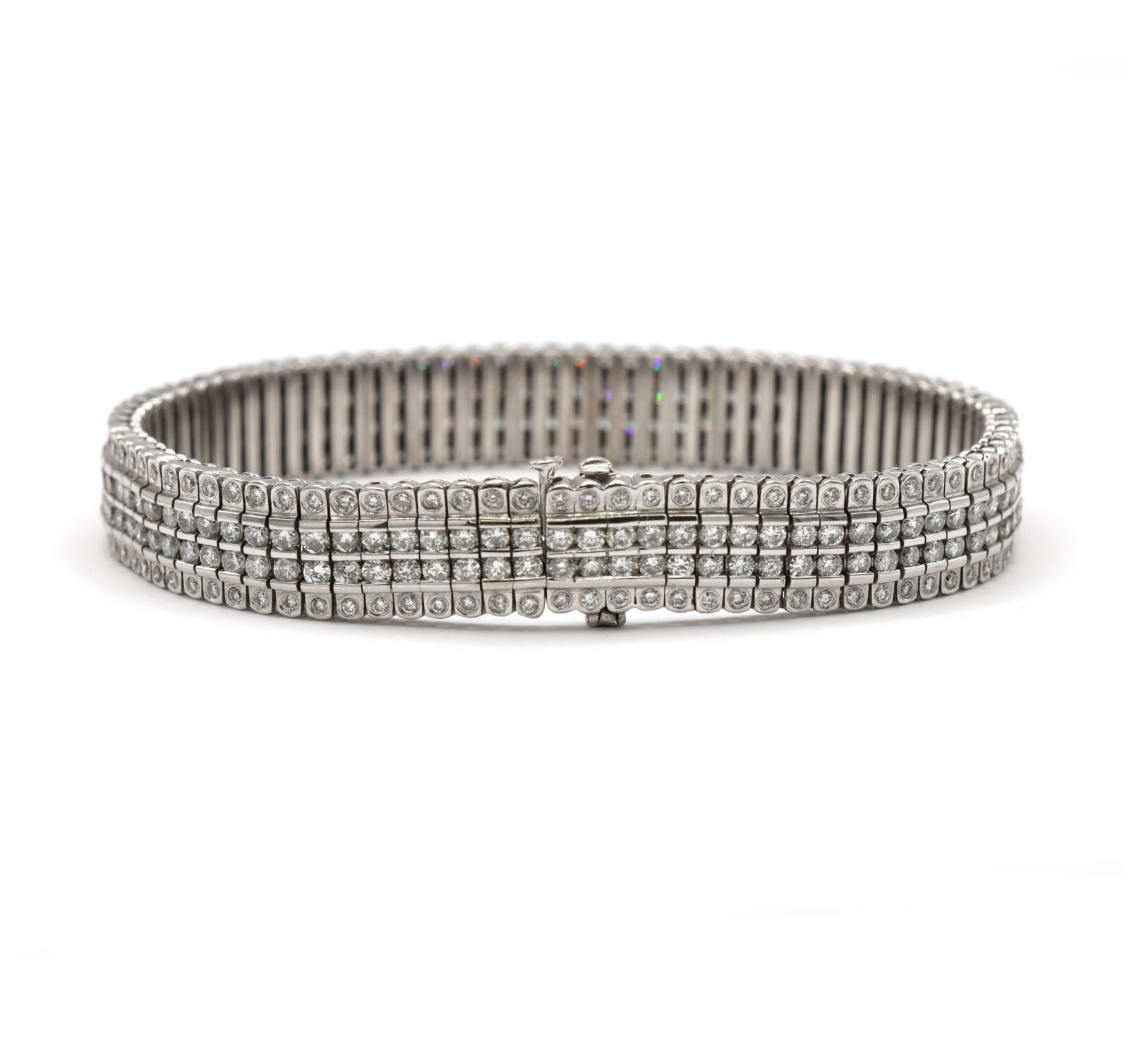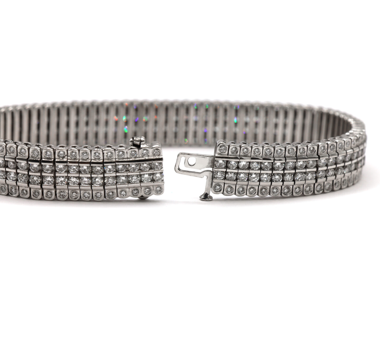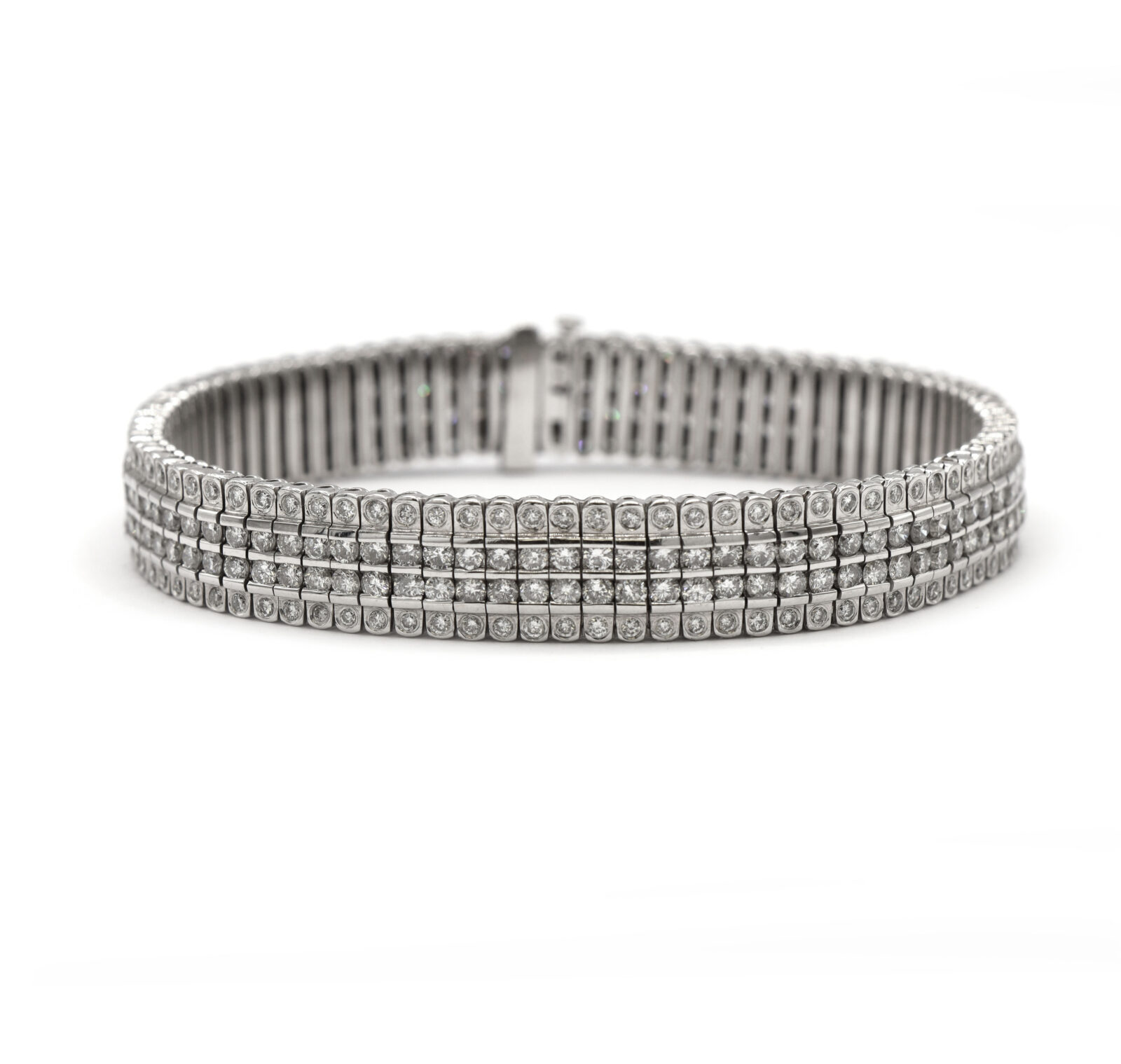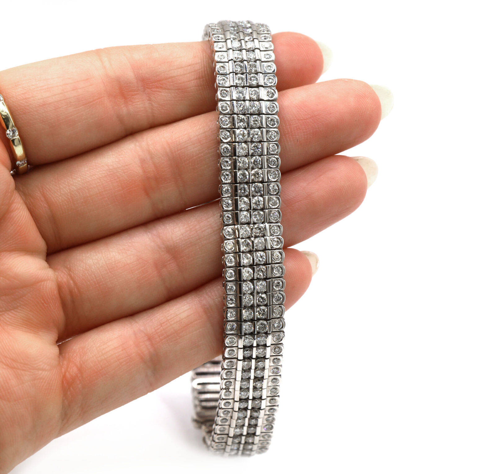 Material: 18k White Gold Gemstone: Natural Diamond Carat Weight: Approximately 16.00 Carat Clarity: SI1/2 Color: D/E/F Cut: Round Brilliant Length: 8.5 Inches Width: 11.80mm Weight: 64.7 Grams