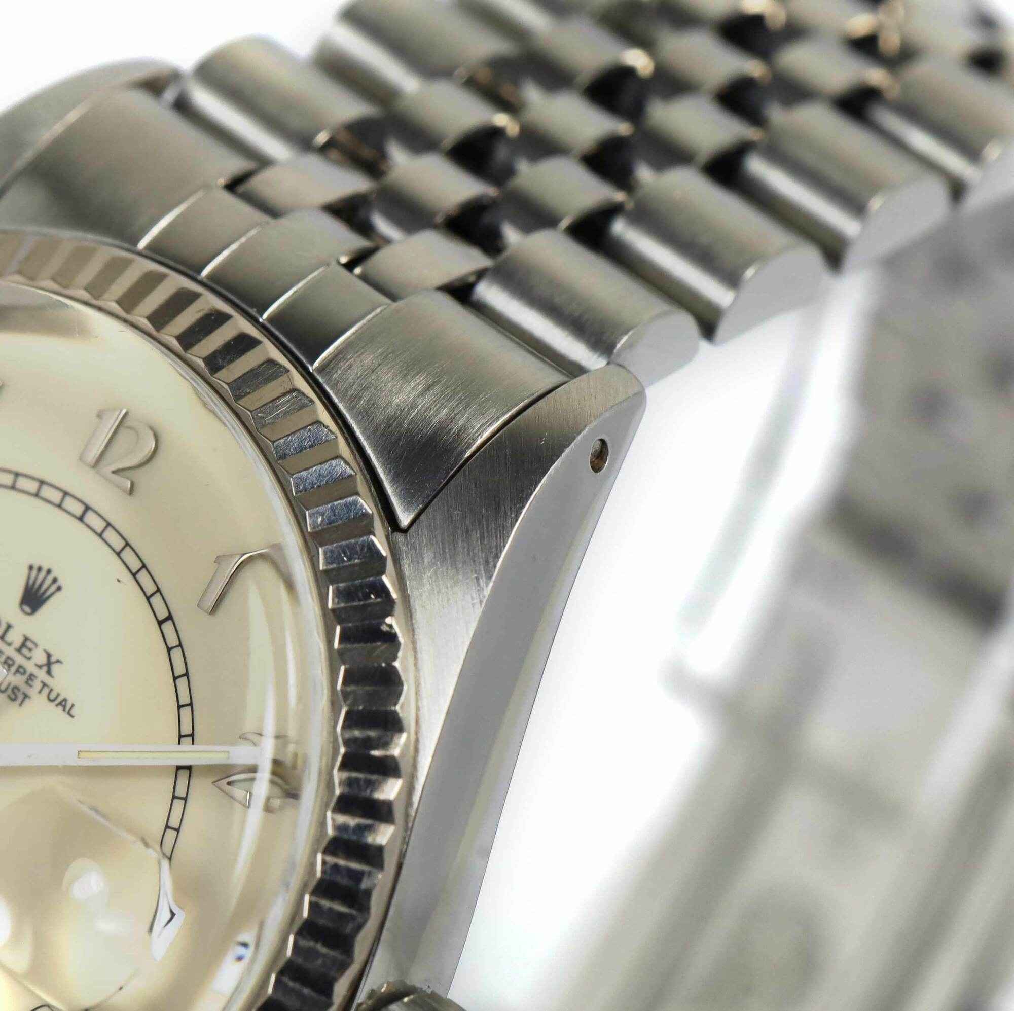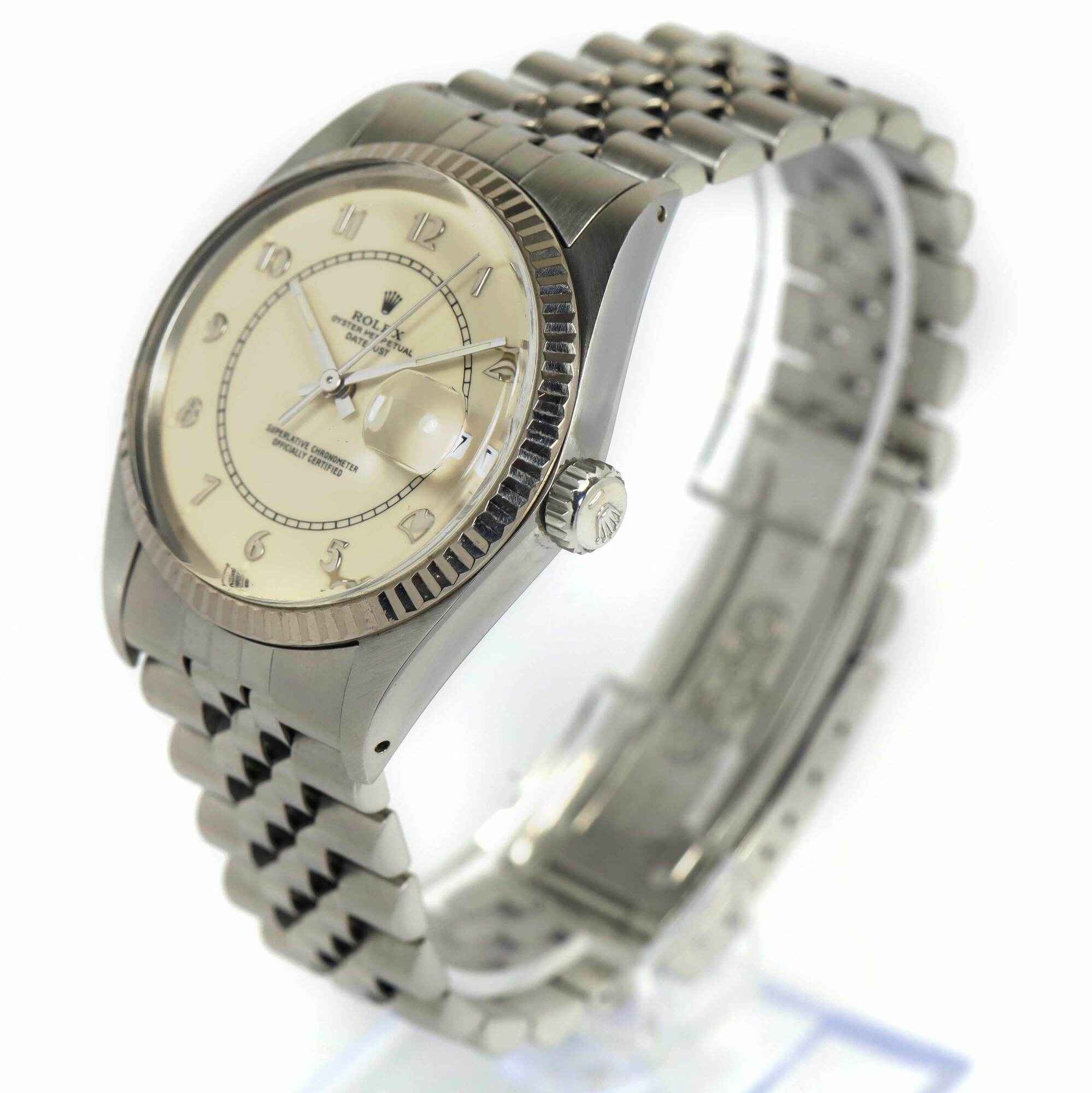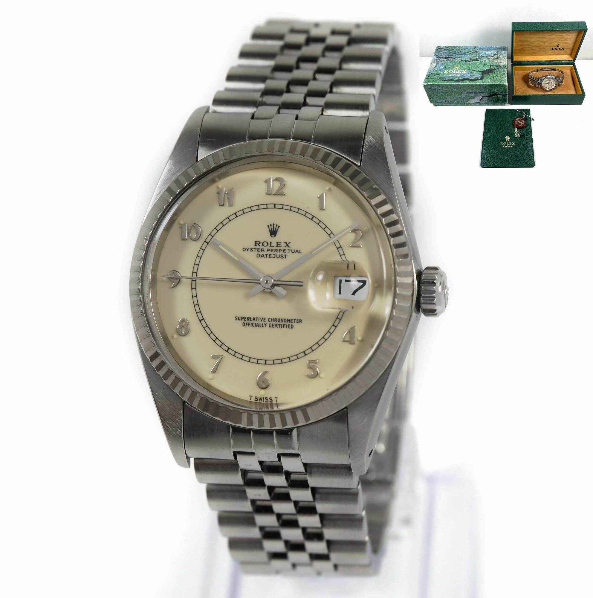Read Morethis rolex is in excellent condition for the age of the watch and comes with its box, red hang tag, and rolex wallet as shown in the pictures attached. This rolex has a serial number beginning with 88 which dates the year of production to be approximately 1985. This watch features a 36mm stainless steel case that surrounds a cream vintage boiler gauge rolex dial with a fluted bezel and comes on a jubilee band. The band shows some stretch but is in excellent overall condition. This watch is in stock and available to ship immediately!