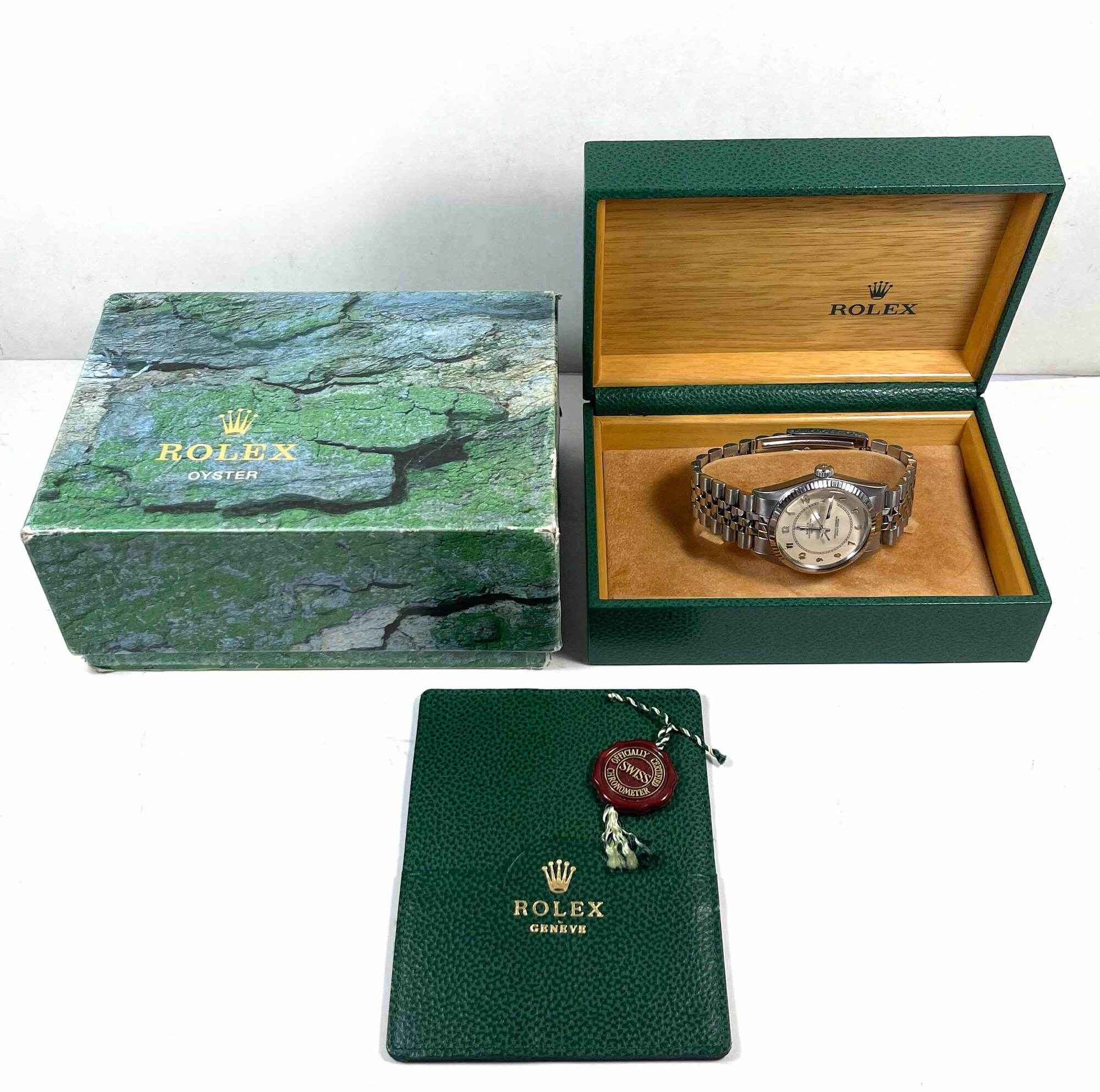 THIS ROLEX IS IN EXCELLENT CONDITION FOR THE AGE OF THE WATCH AND COMES WITH ITS BOX, RED HANG TAG, AND ROLEX WALLET AS SHOWN IN THE PICTURES ATTACHED. THIS ROLEX HAS A SERIAL NUMBER BEGINNING WITH 88 WHICH DATES THE YEAR OF PRODUCTION TO BE APPROXIMATELY 1...