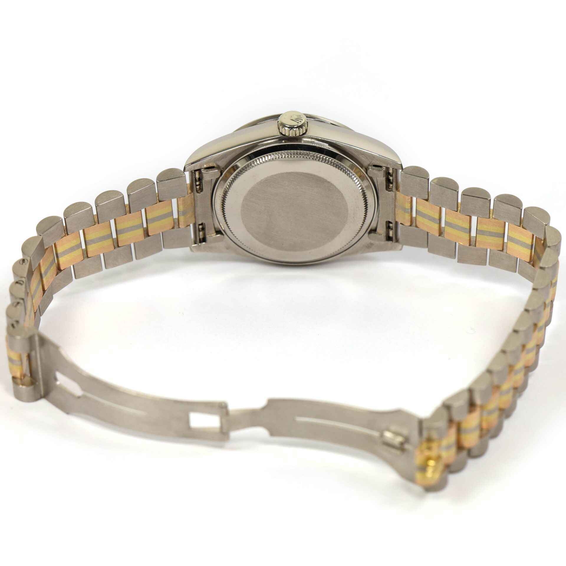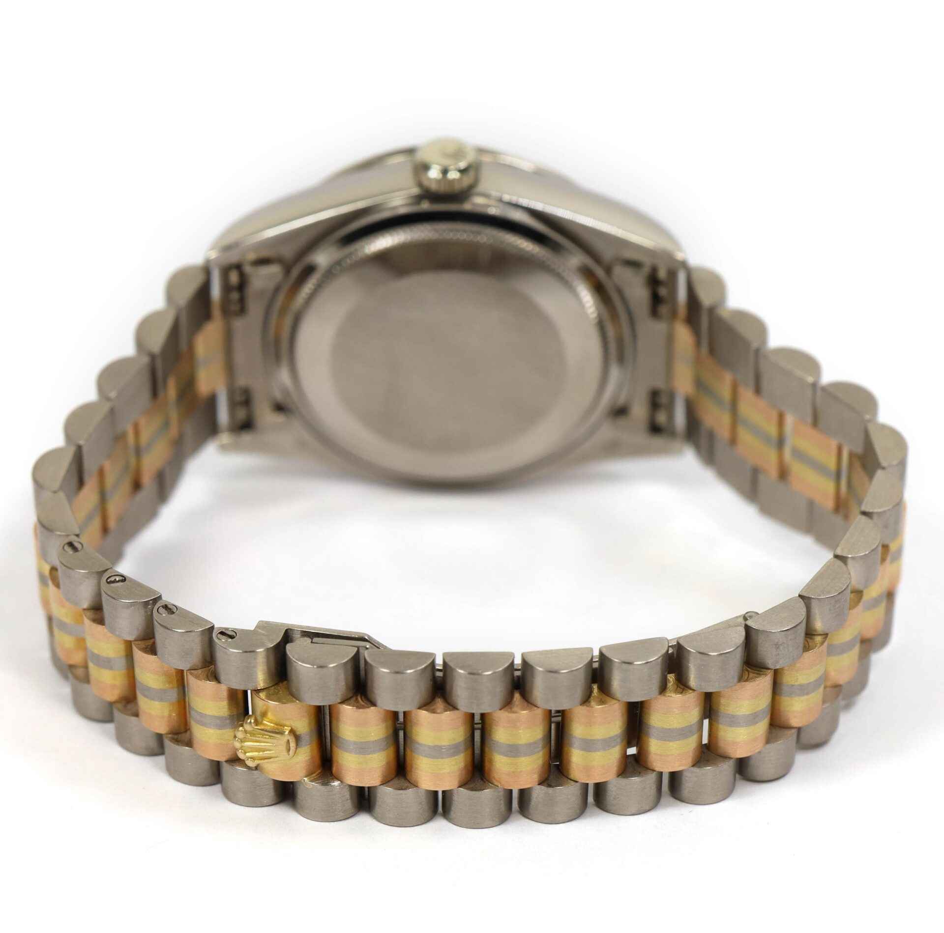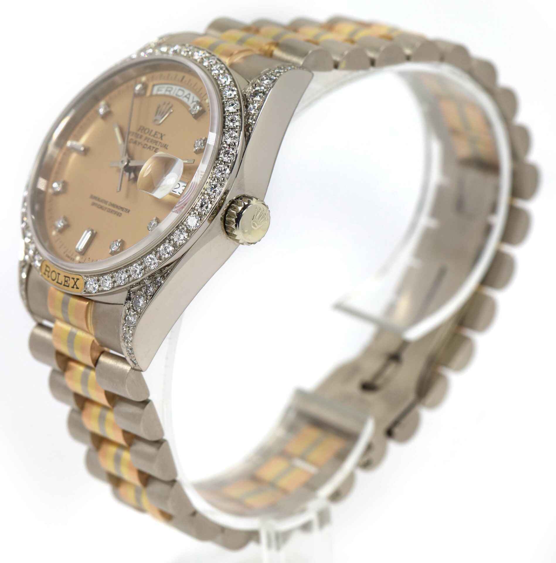 Read Morethis rolex president is in mint and unpolished condition and comes with its box and hang tag only as shown in the photos attached. This watch features a very interesting dial, it appears sand/rose color, it is matte finished, it has no sunburst effect as typically seen, and has factory set diamonds on the bezel, case, and hour markers. The tridor president band on this watch features 18k white, yellow, and rose gold. The serial number for this watch begins with 95 which dates the year of production to be approximately 1987. This watch is very rare and in unbelievable condition, this is a fantastic addition to any rolex collection.
