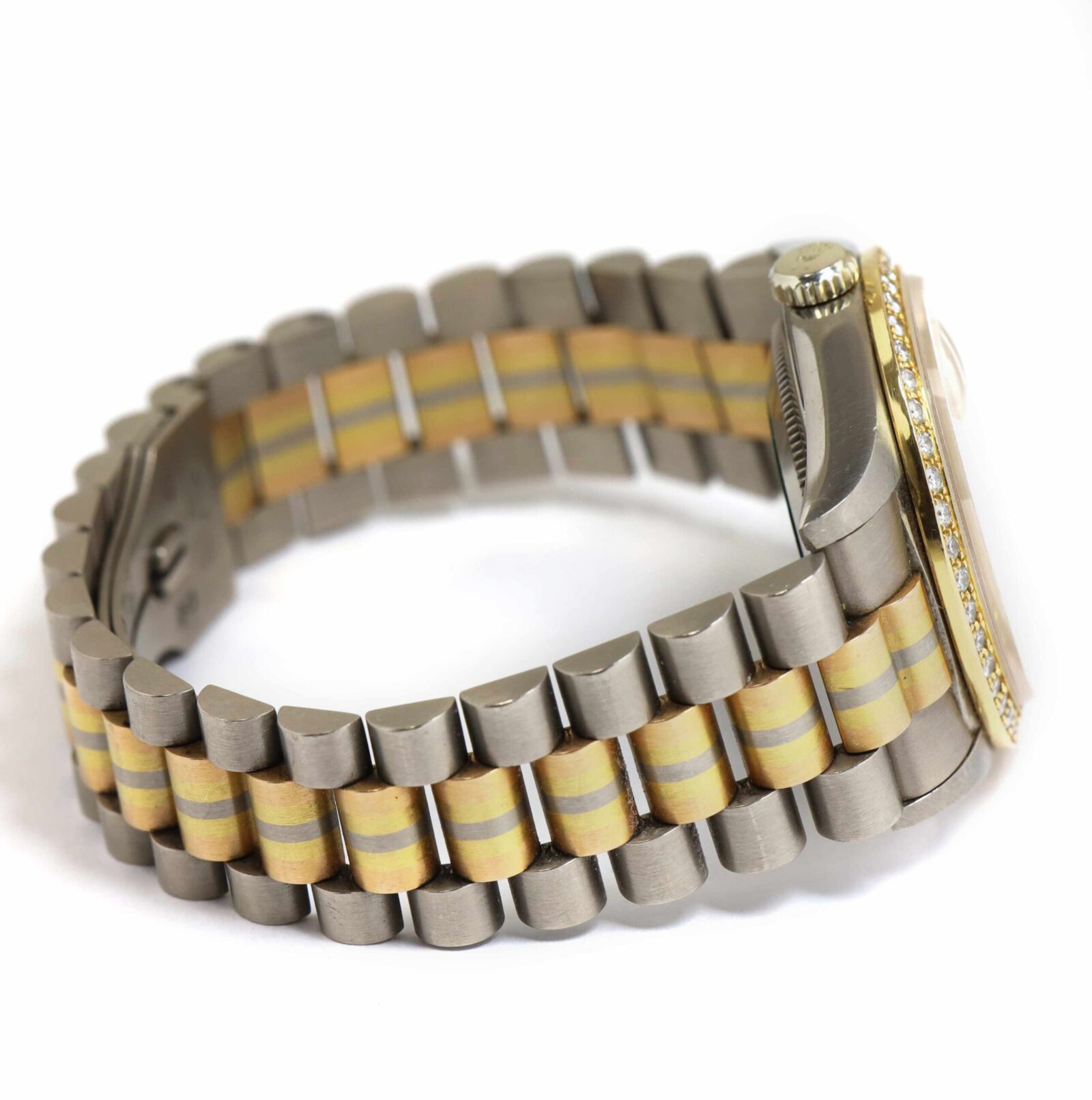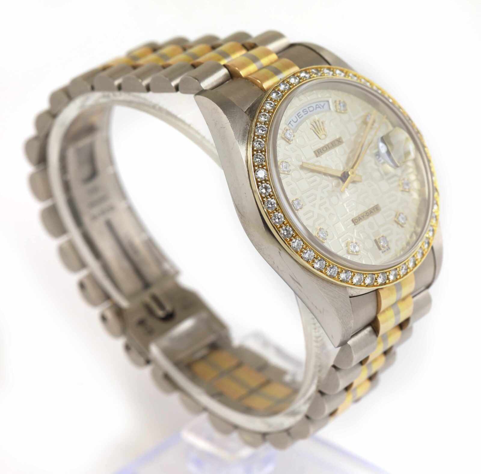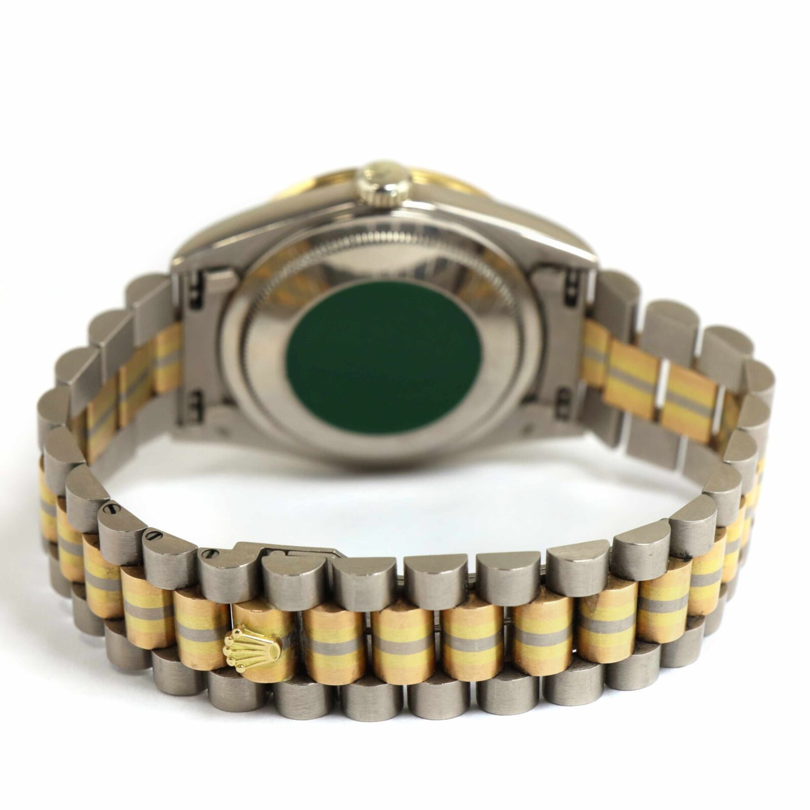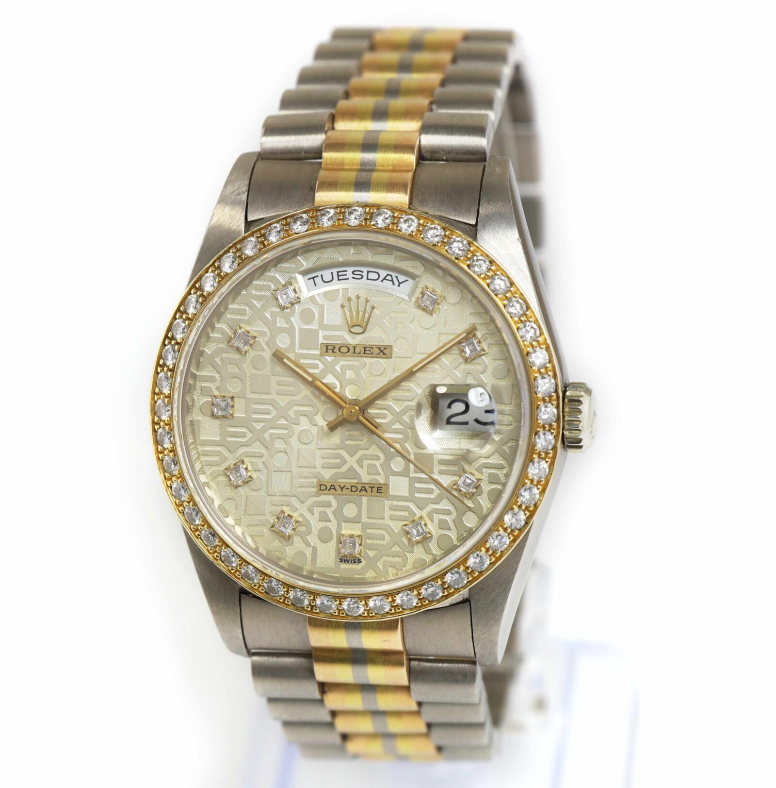 Read Morethis rolex president is in great condition with the green caseback sticker attached and comes as watch only as shown in the pictures attached. This watch has a serial number beginning with l which dates the year of production to be approximately 1989. The silver diamond dial on this model features square shaped diamonds as opposed to circle, which makes this watch especially rare. The tridor president band on this watch features 18k white, yellow, and rose gold. This watch is in stock and available to ship immediately!