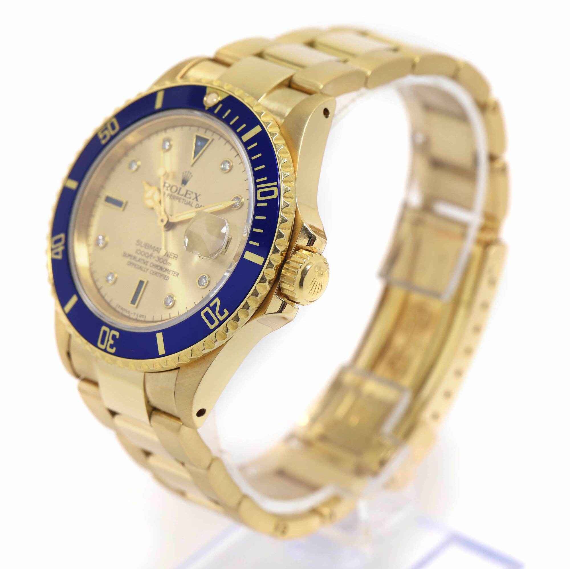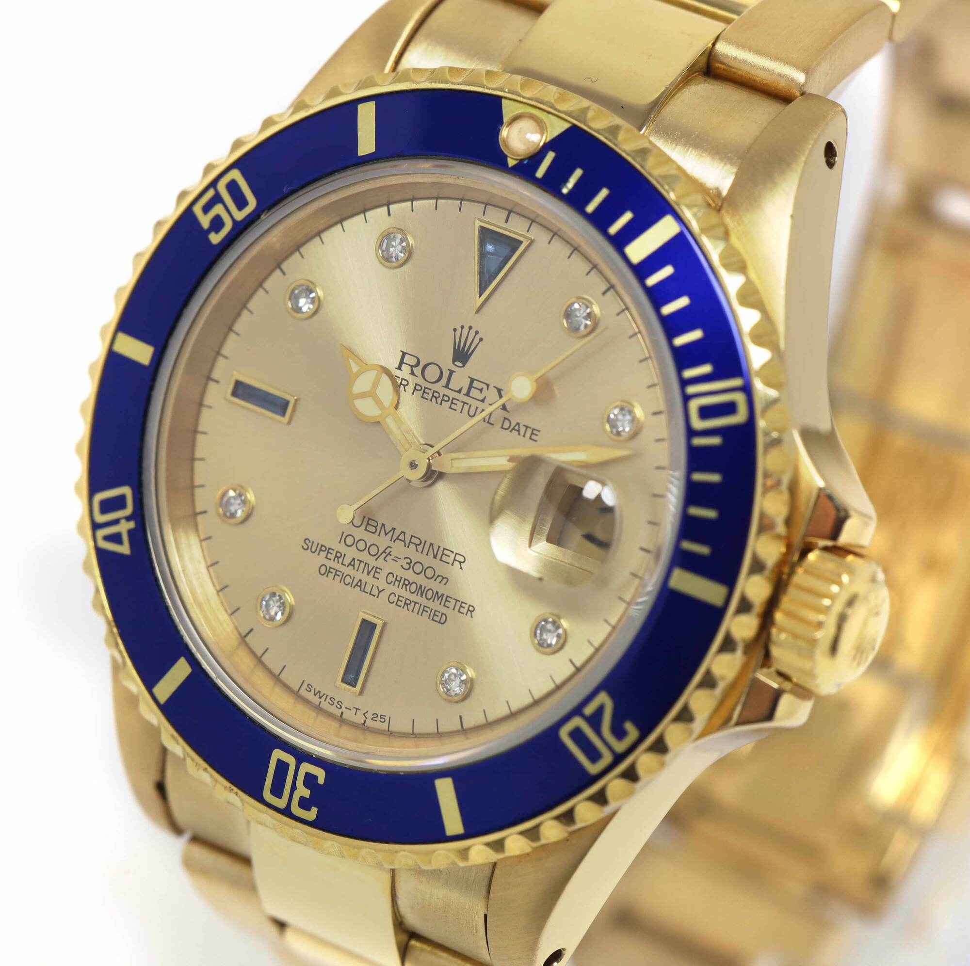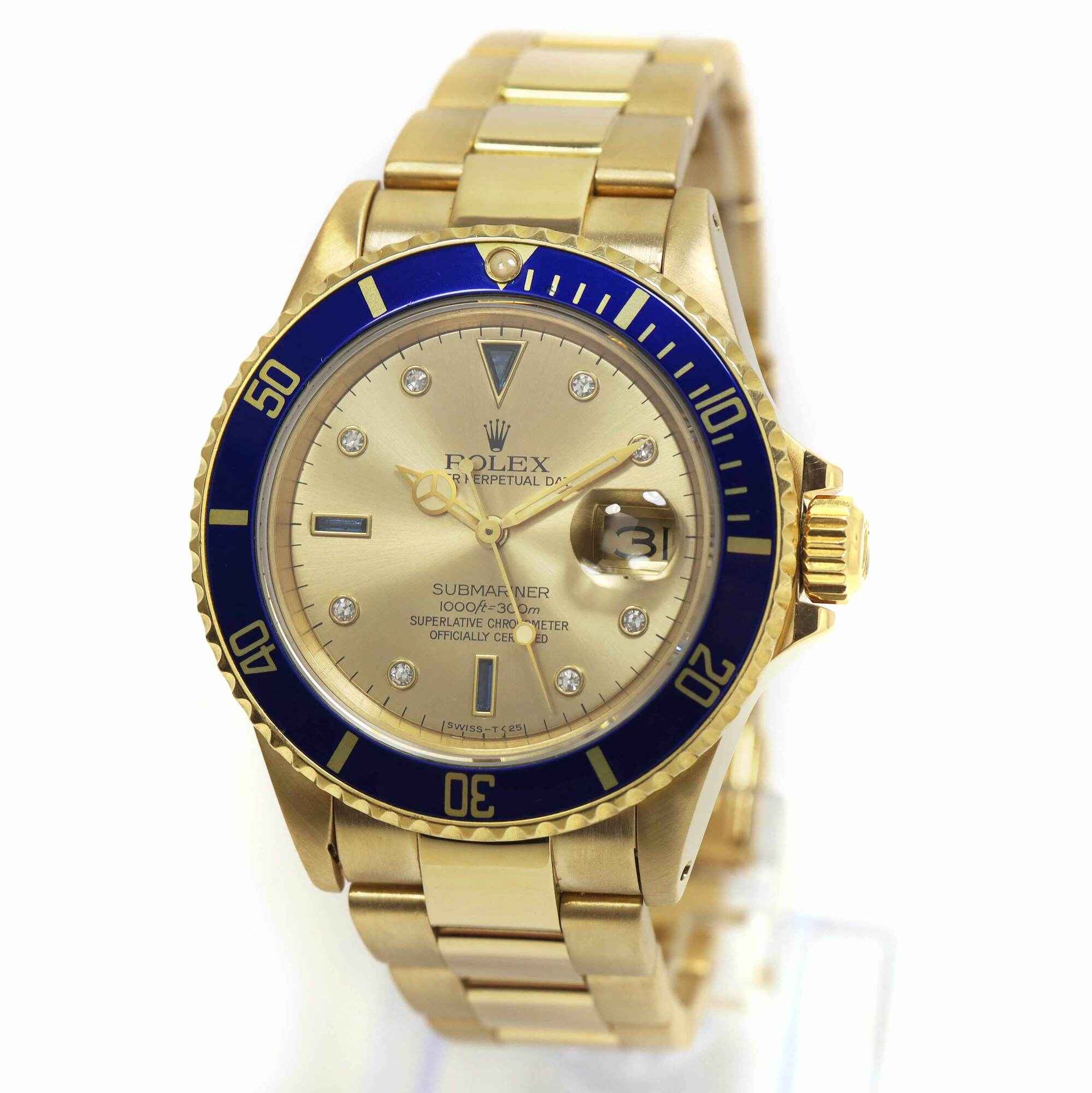 this rolex is in excellent condition for the age of the watch and comes as watch only. This watch features a 40mm 18k yellow gold case that surrounds a factory slate serti dial with 8 round diamonds and 3 blue sapphires with a blue bezel and comes on a yellow gold bracelet. This watch is in stock and available to ship immediately!
