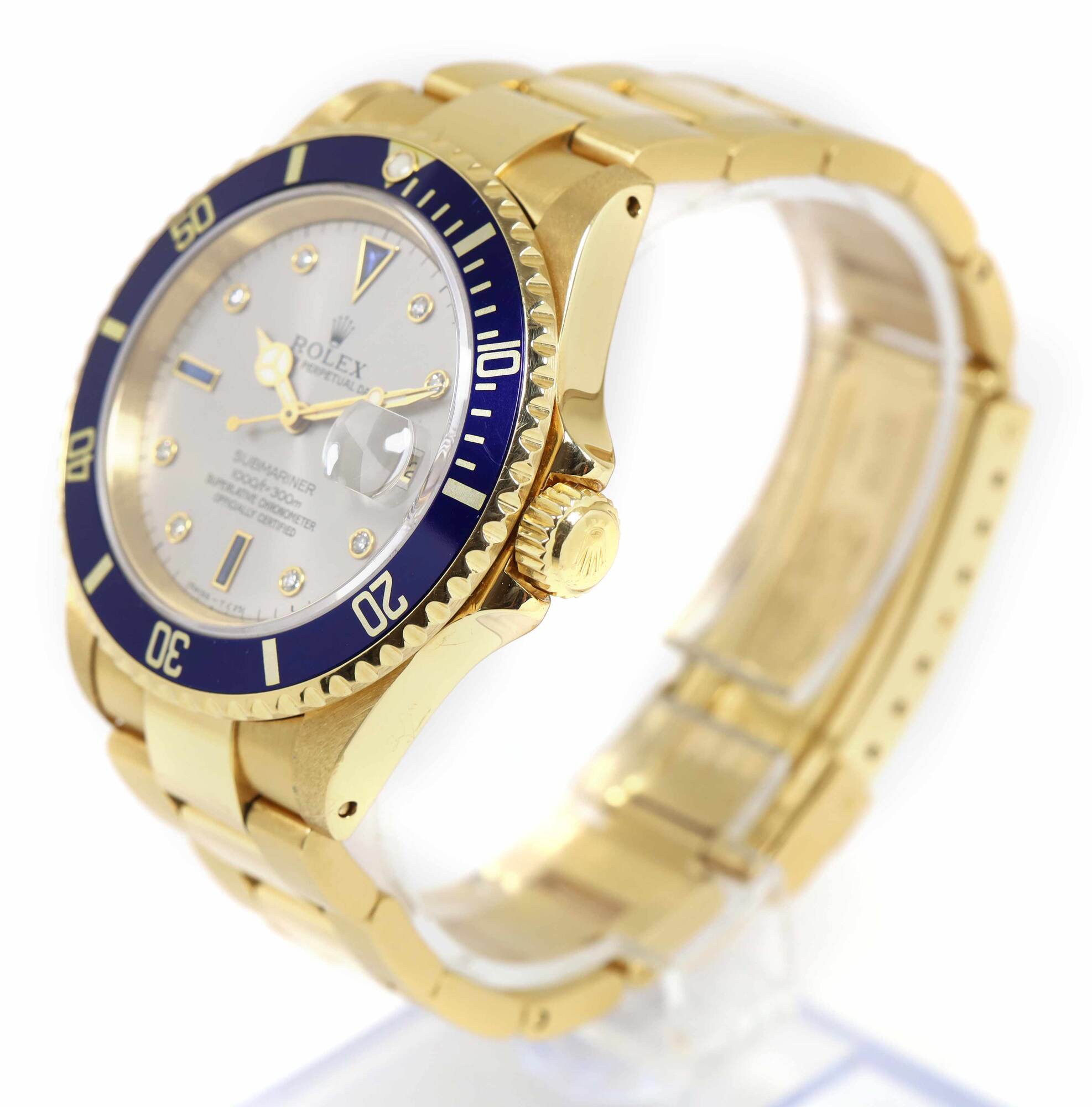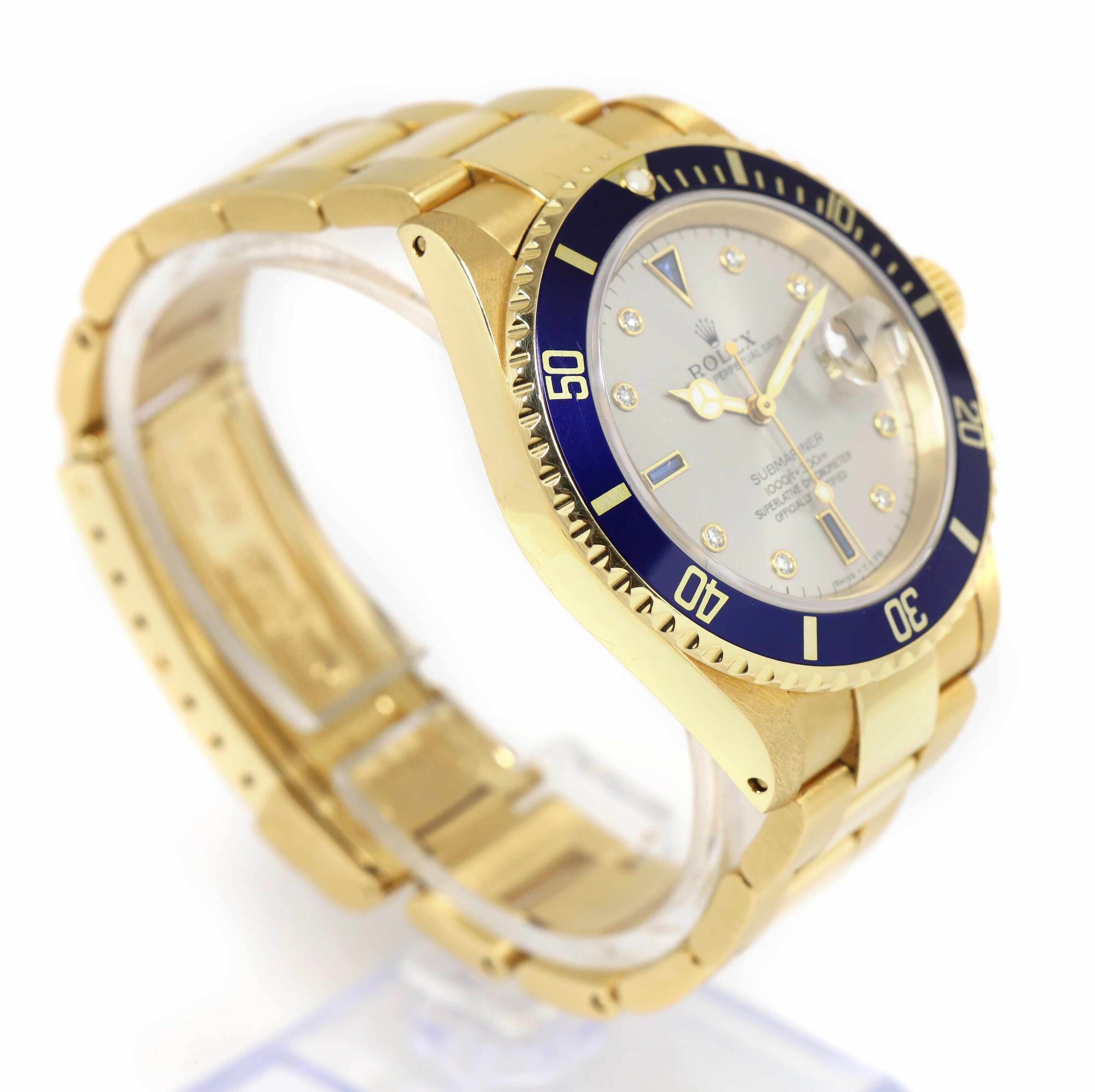 THIS ROLEX IS IN EXCELLENT CONDITION FOR THE AGE OF THE WATCH AND COMES AS WATCH ONLY. THIS WATCH FEATURES A 40MM 18K YELLOW GOLD CASE THAT SURROUNDS A FACTORY SLATE SERTI DIAL WITH 8 ROUND DIAMONDS AND 3 BLUE SAPPHIRES WITH A BLUE BEZEL AND COMES ON A YELL...