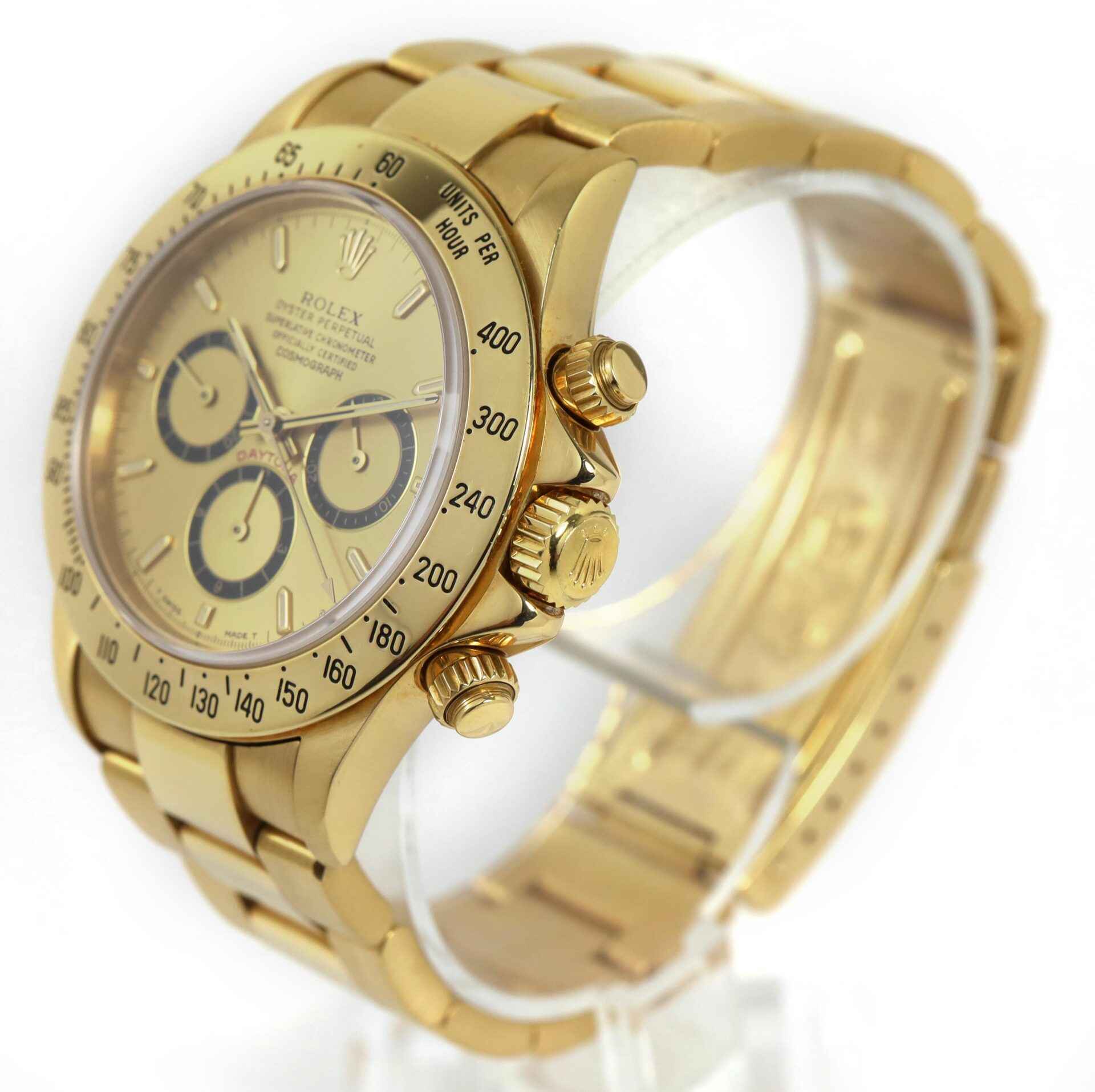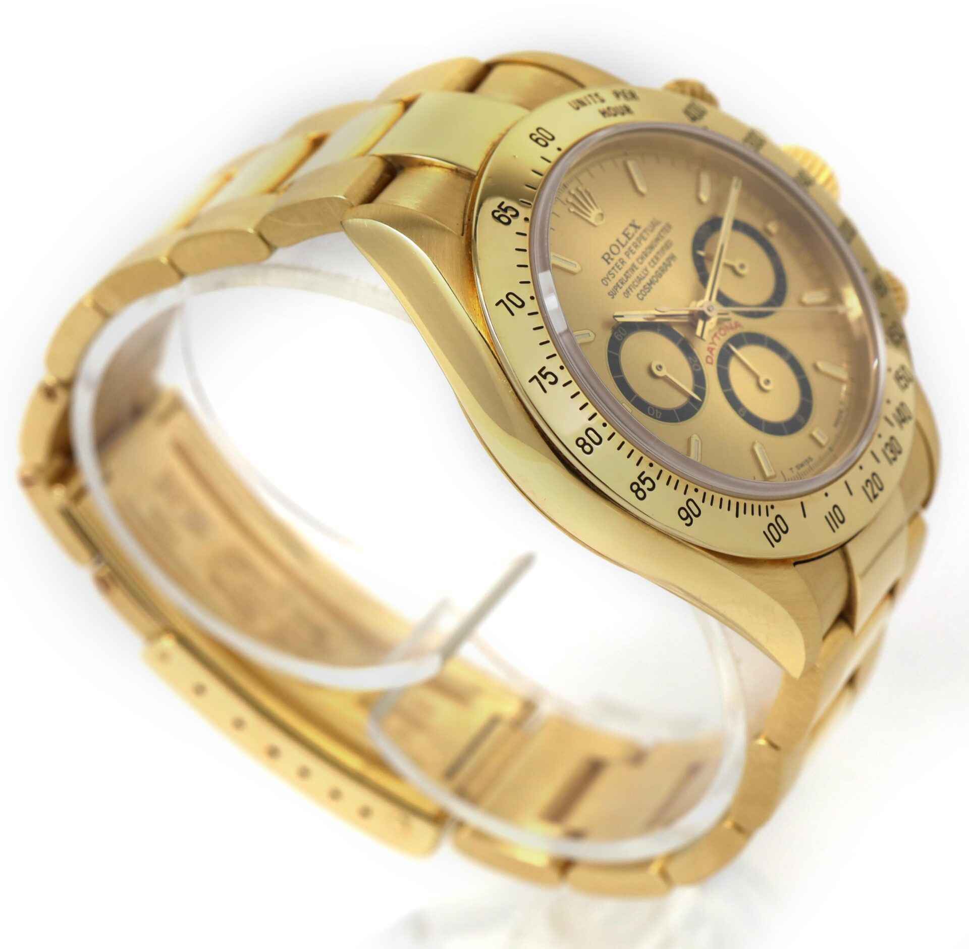 THIS ROLEX DAYTONA IS IN EXCELLENT CONDITION AND COMES AS WATCH ONLY AS SHOWN IN THE PICTURES ATTACHED. THIS WATCH FEATURES A 40MM 18K YELLOW GOLD CASE THAT SURROUNDS A CHAMPAGNE DIAL AND COMES ON A GOLD BRACELET. THIS WATCH HAS A SERIAL NUMBER BEGINNING WI...