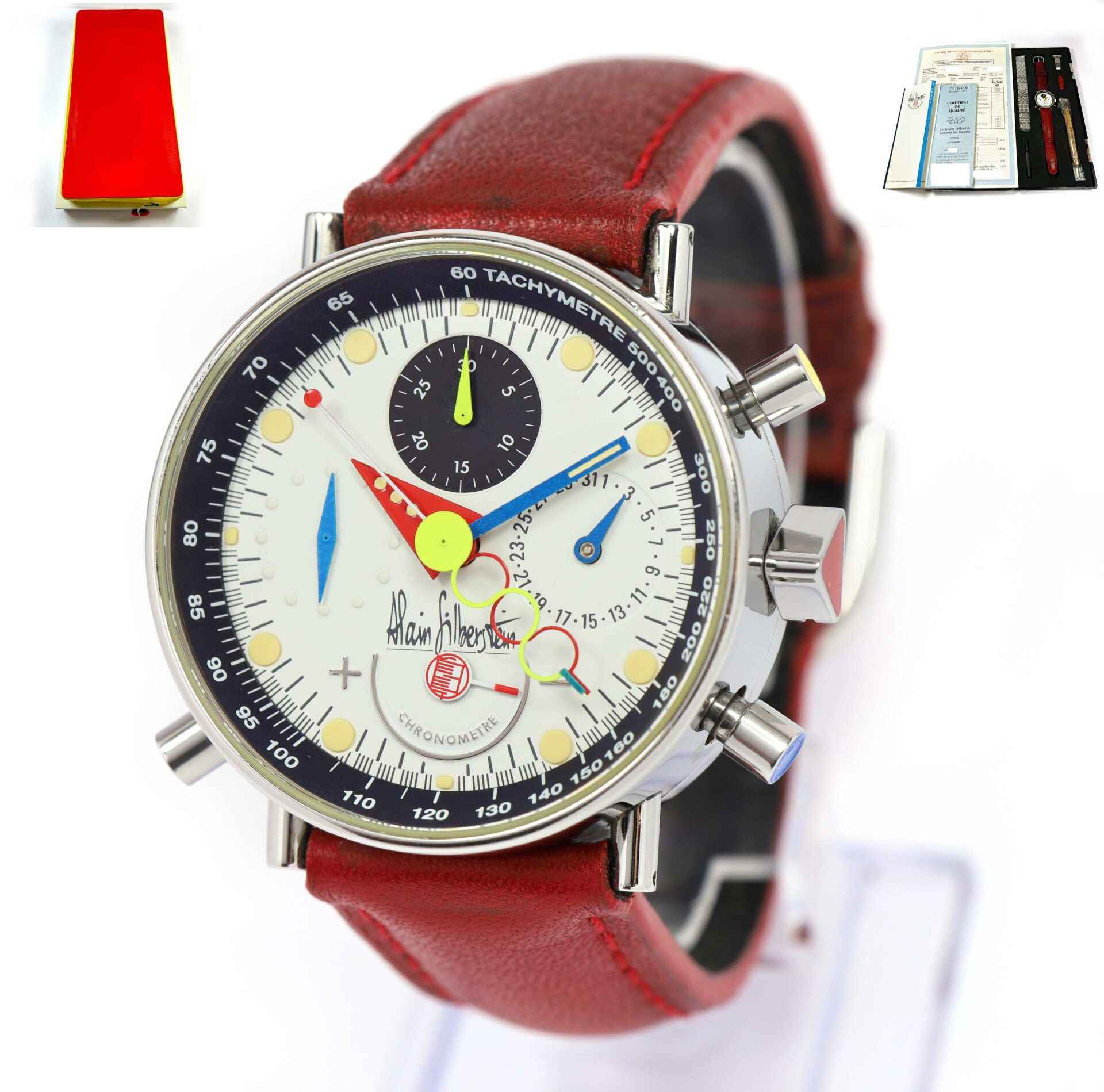 this alain silberstein watch is in great overall condition for the age of the watch and comes with its box, booklets, watch tools, one additional steel bracelet, and warranty paper dated september 16th, 1994 as shown in the pictures attached. This watch is in stock and available to ship immediately!