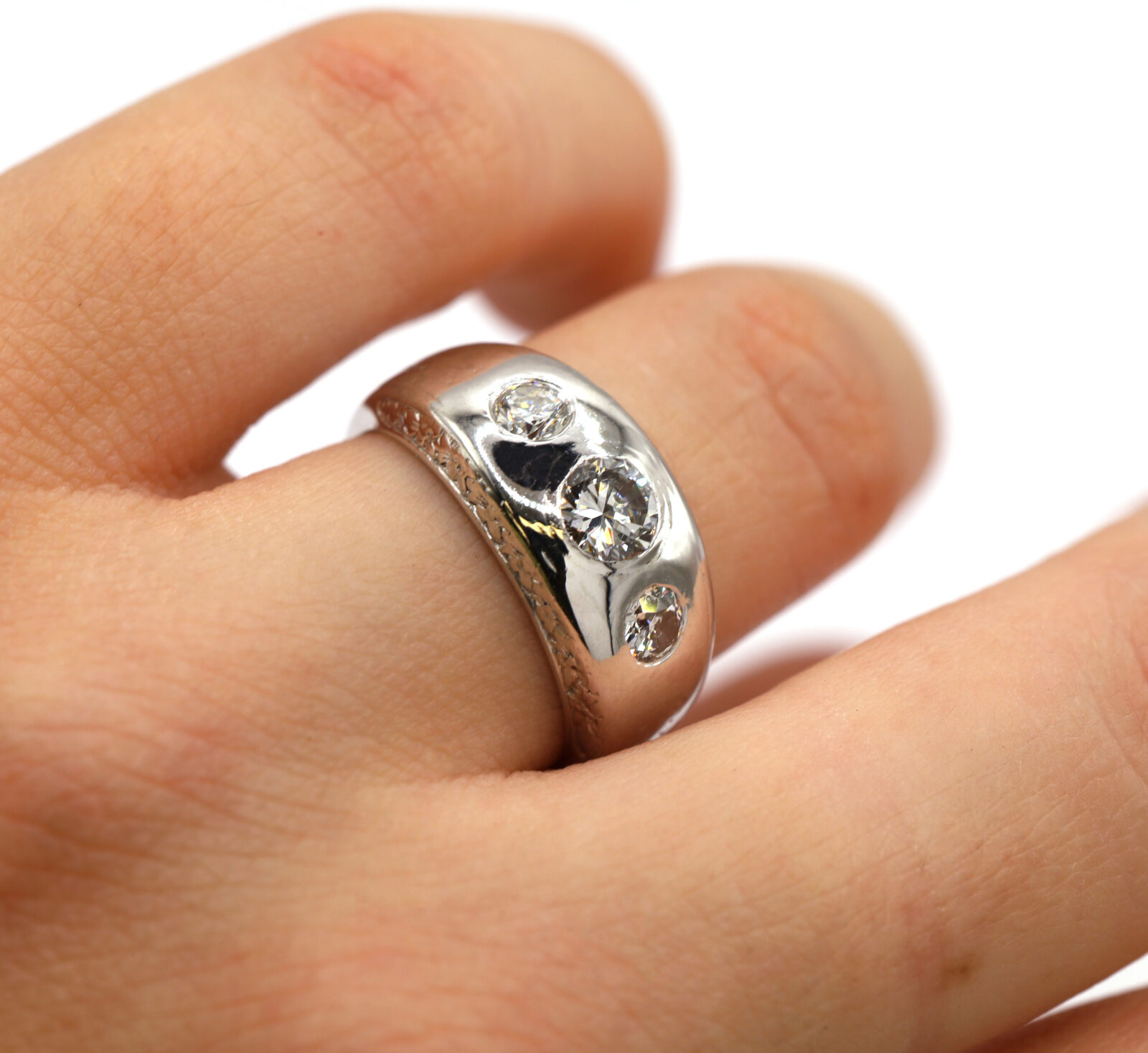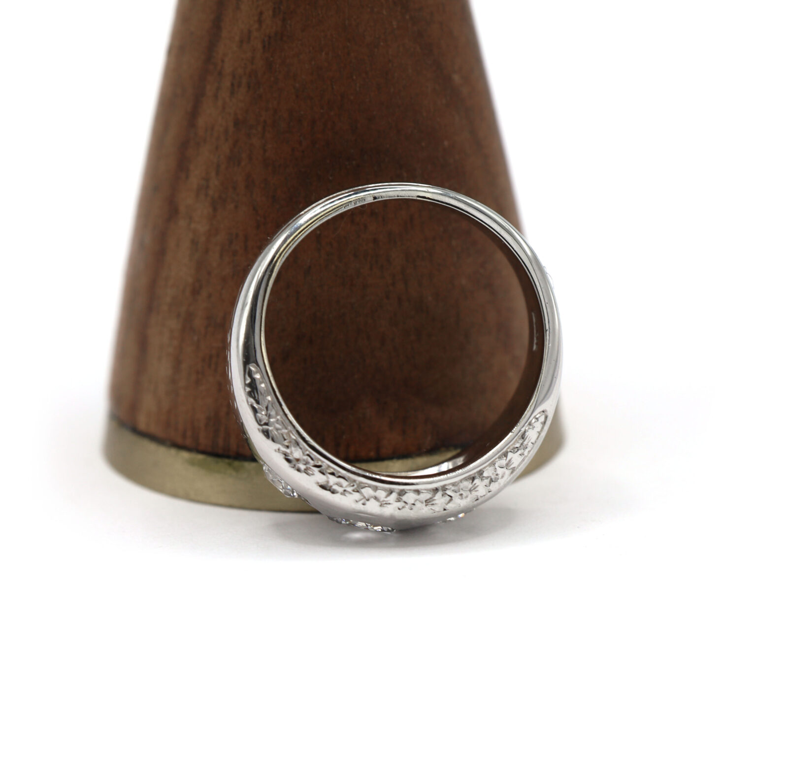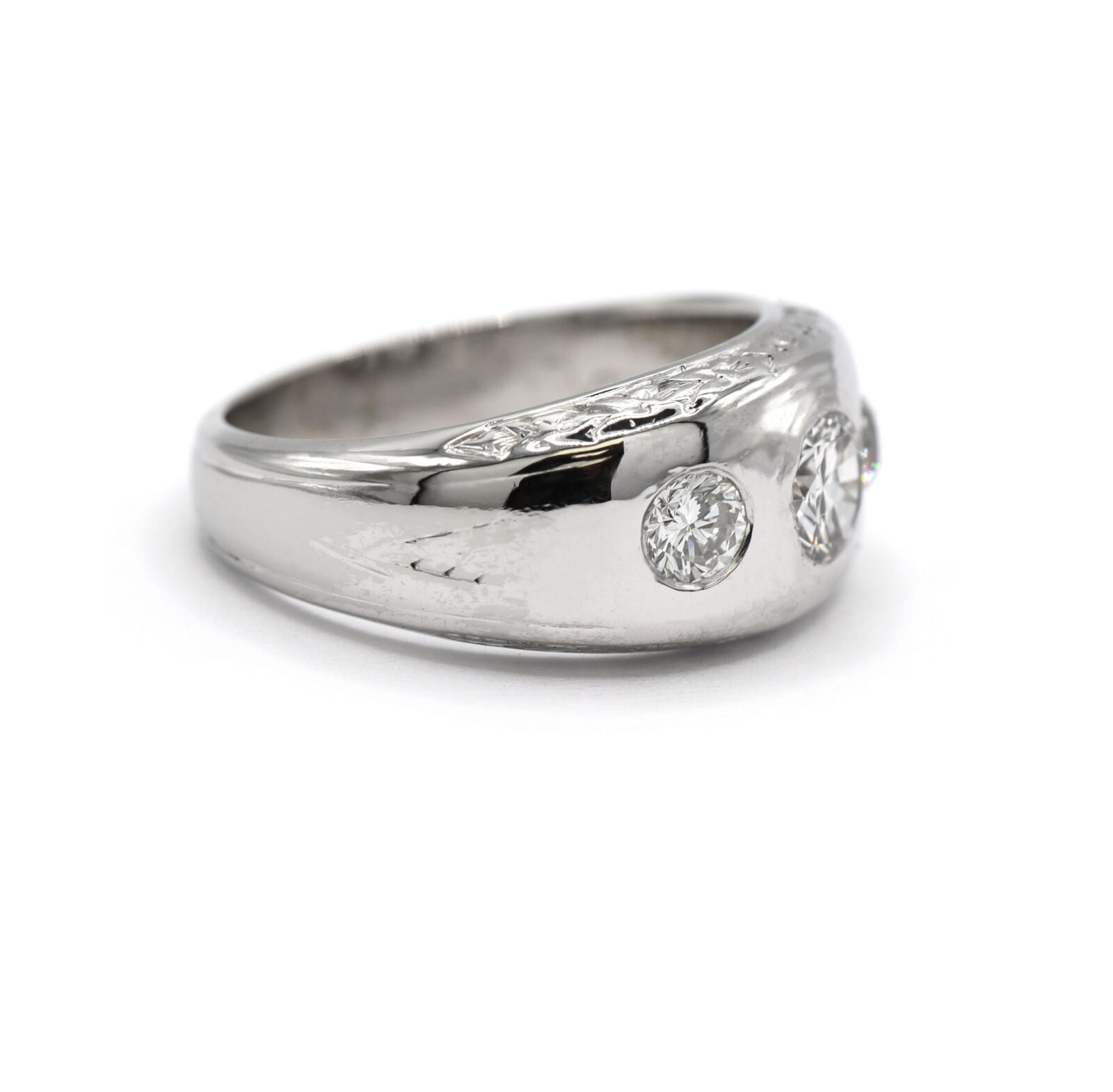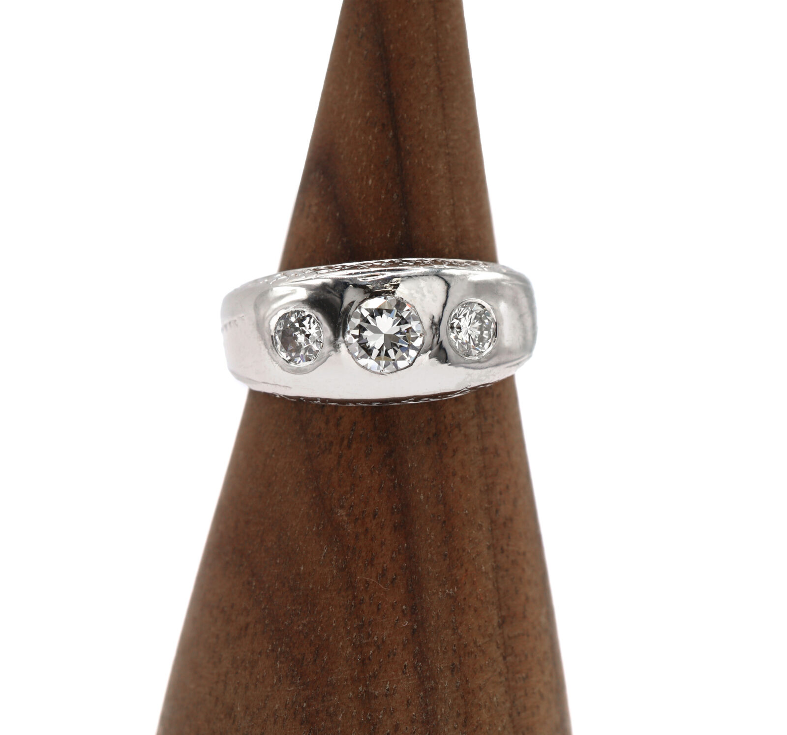 Material: 18k White Gold Ring Size: 6.5 Front Width: 9.3mm Back Width: 3.5mm Weight: 8.8 Grams Gemstone: Natural Diamond Carat Weight: 1.00 Carat Clarity: VS2 Color: F Cut: Round Brilliant