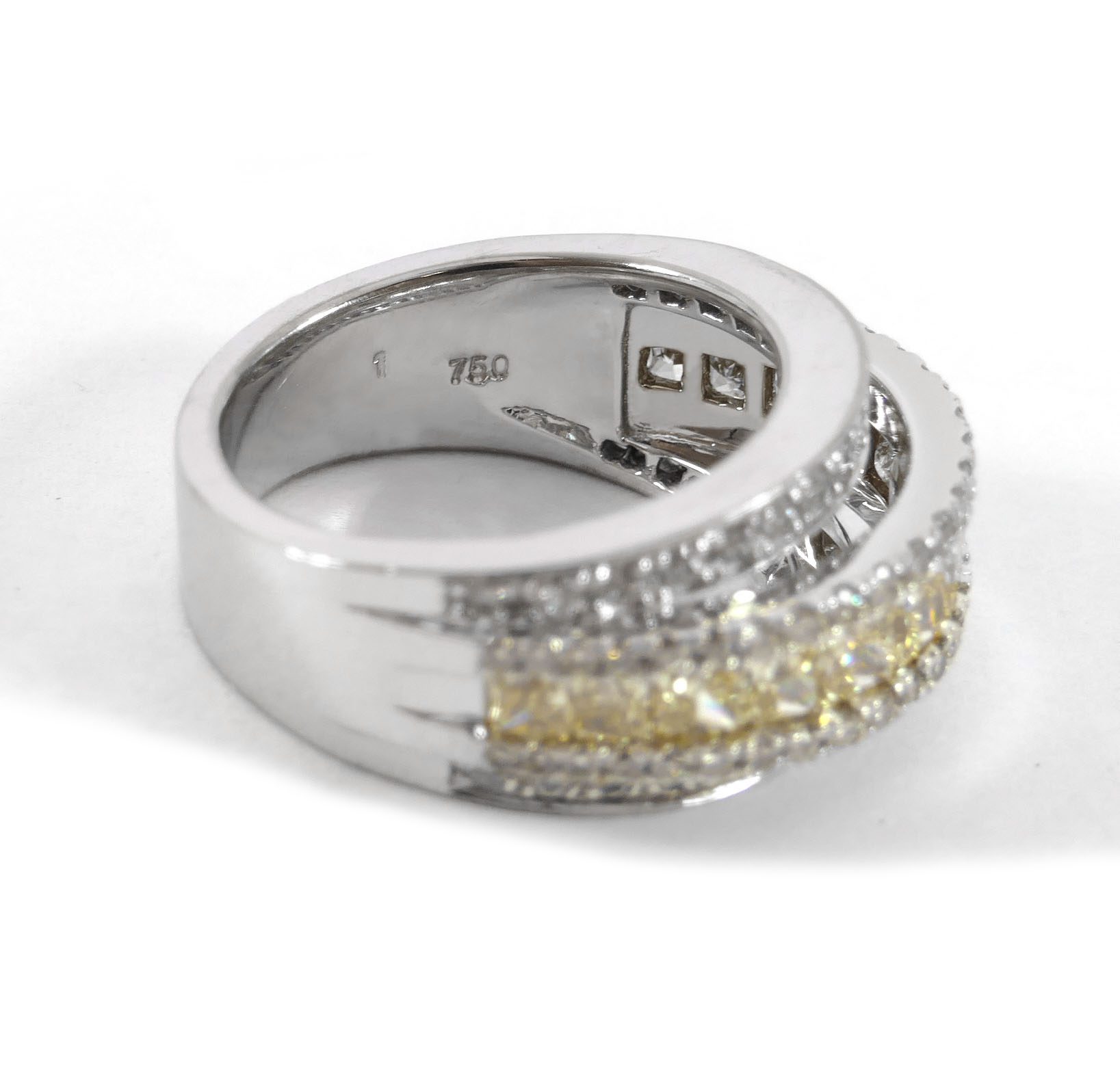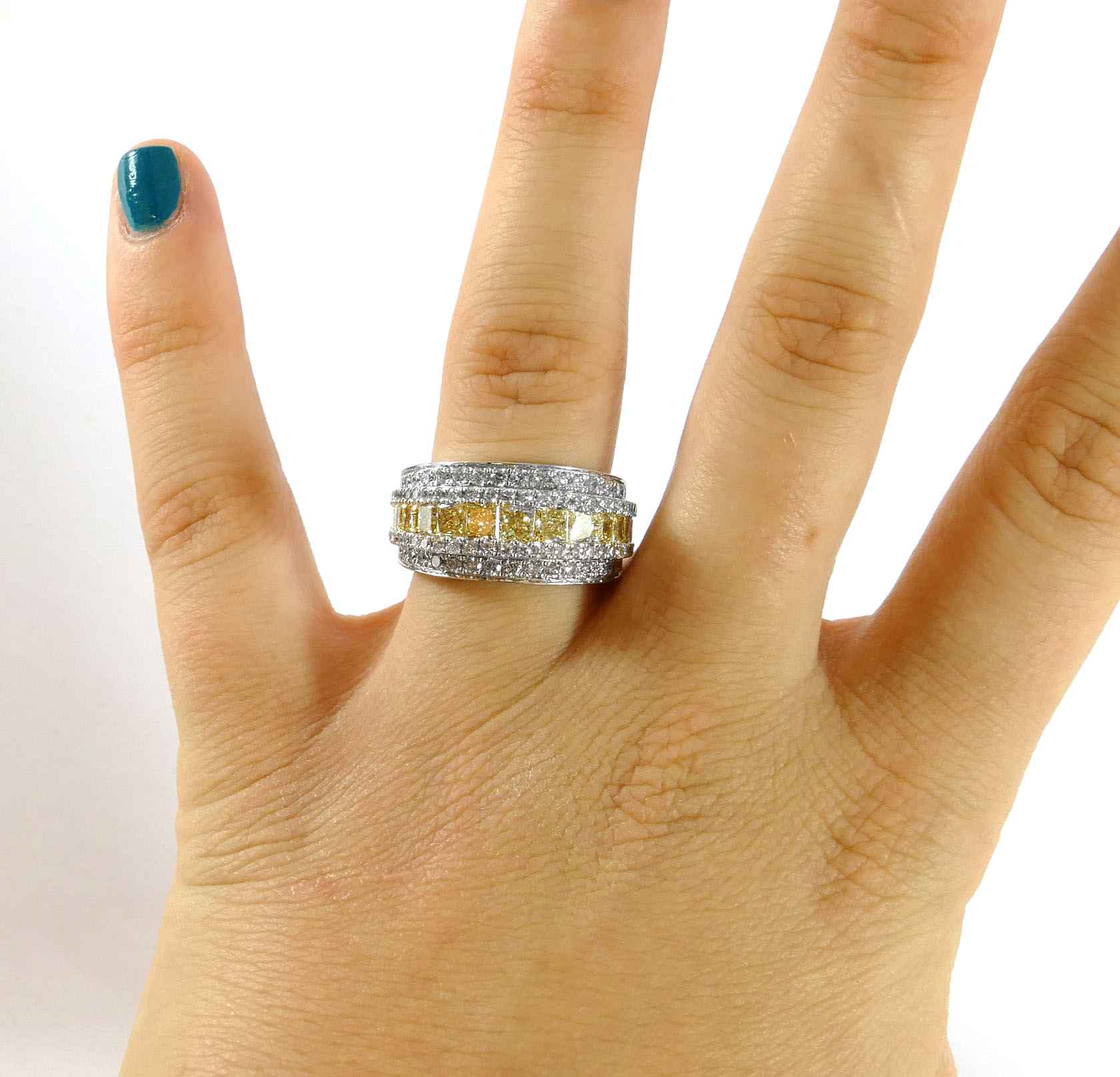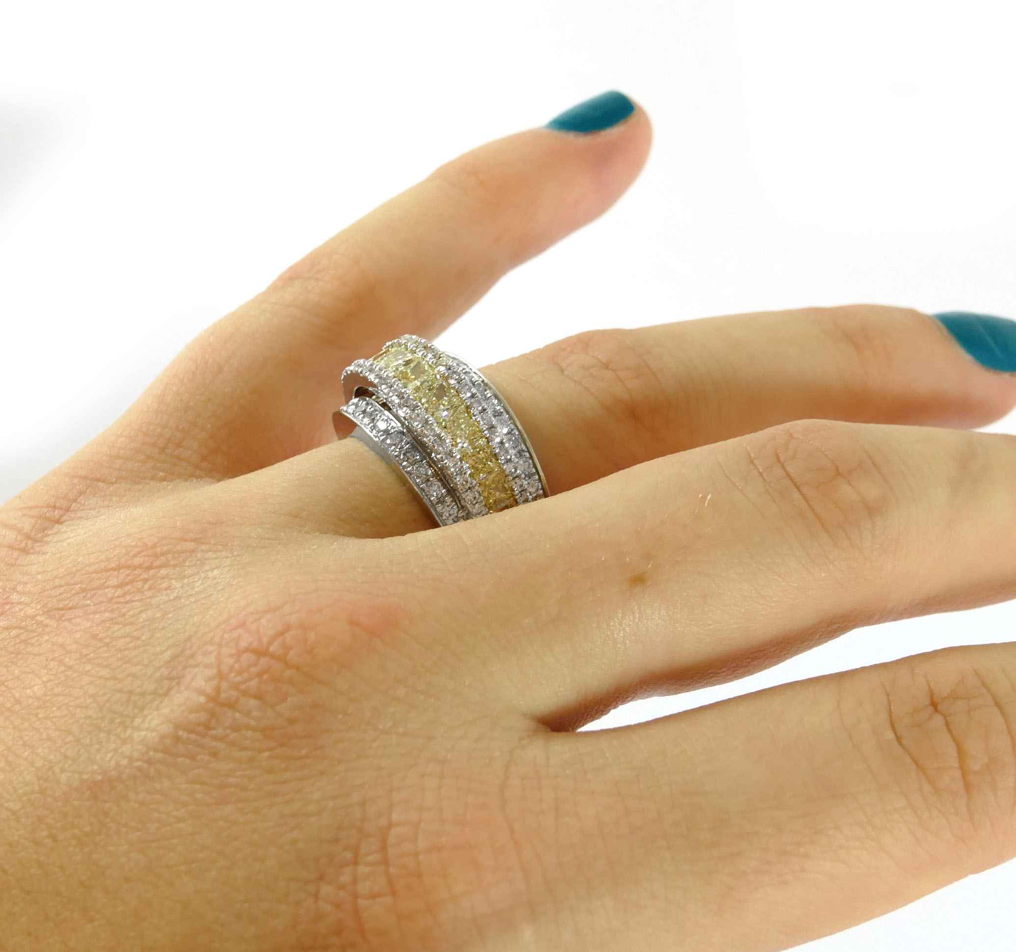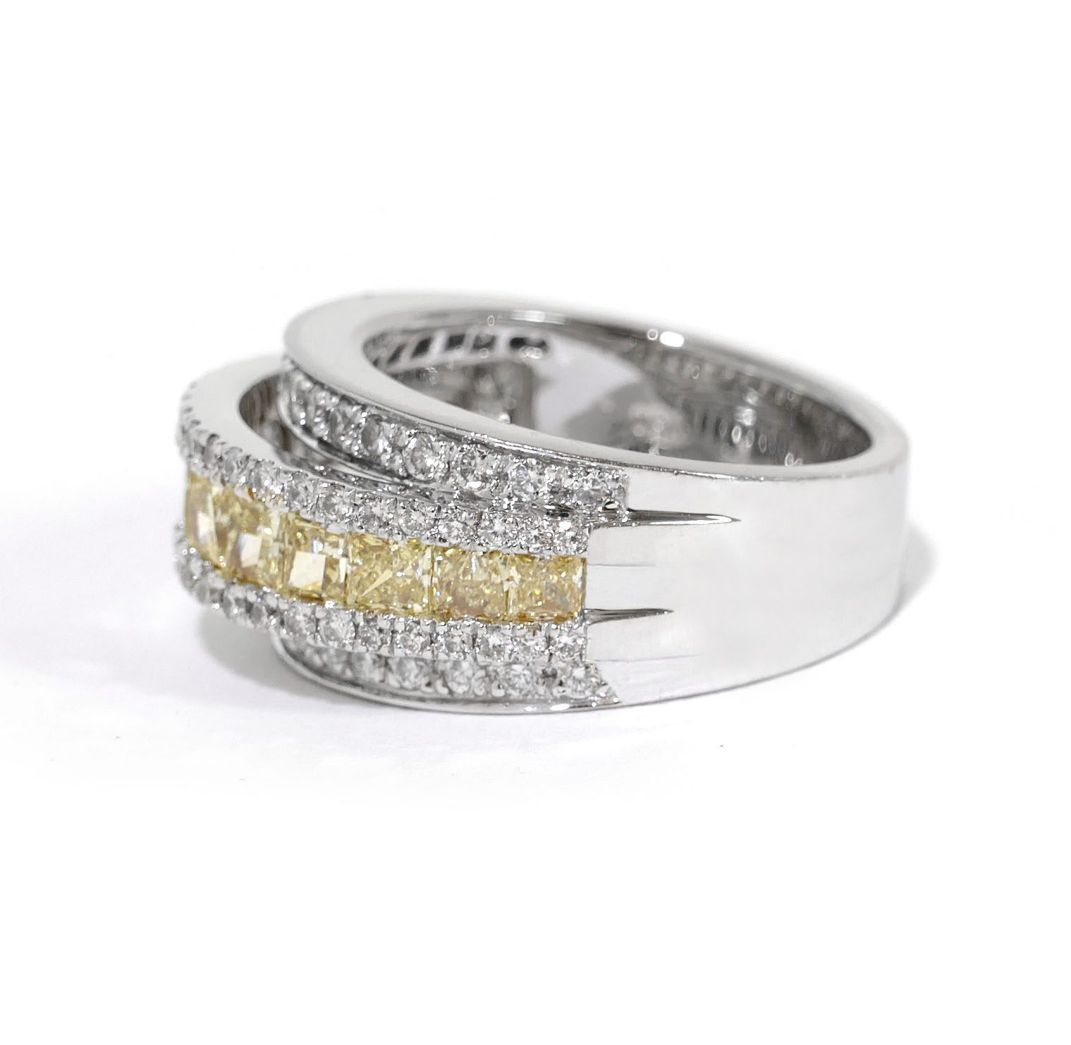 This stunning canary yellow and white diamond row ring is made of solid 18k white gold. All the yellow diamonds are princess cut, surrounded by two rows on the top and bottom of white round cut diamonds.  Material...