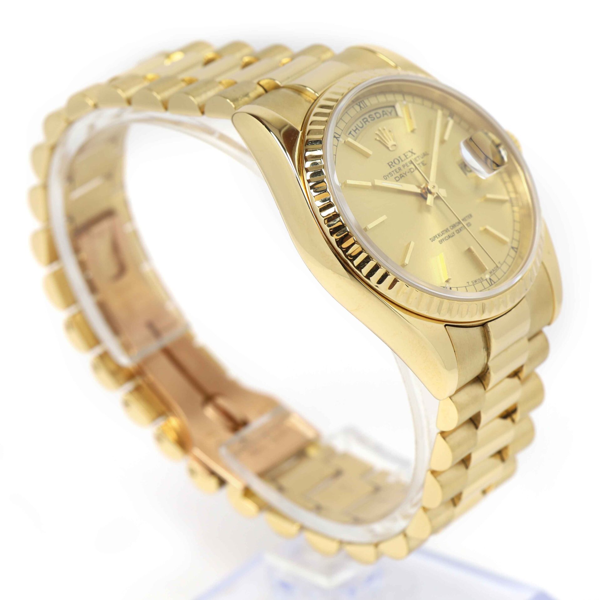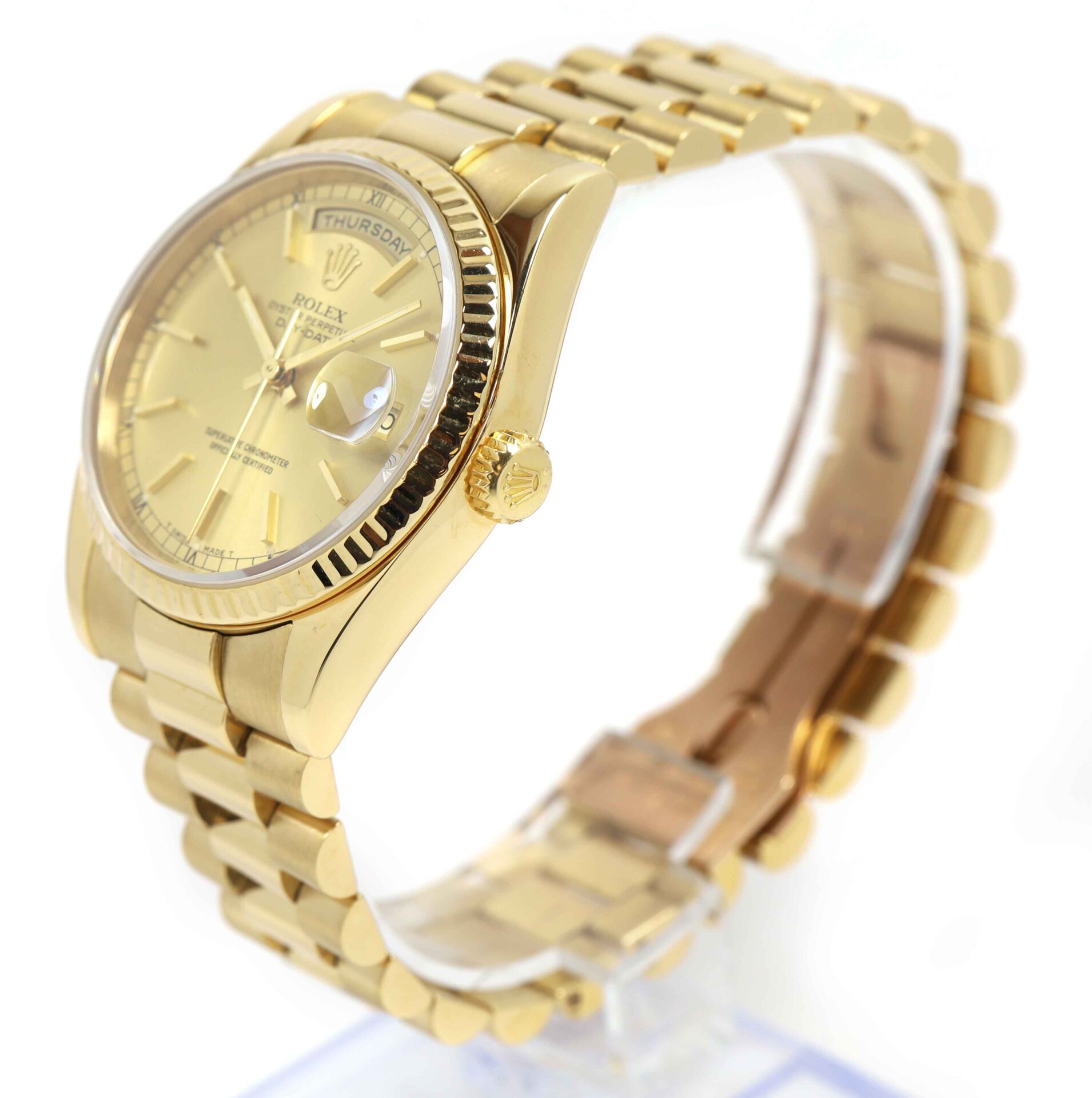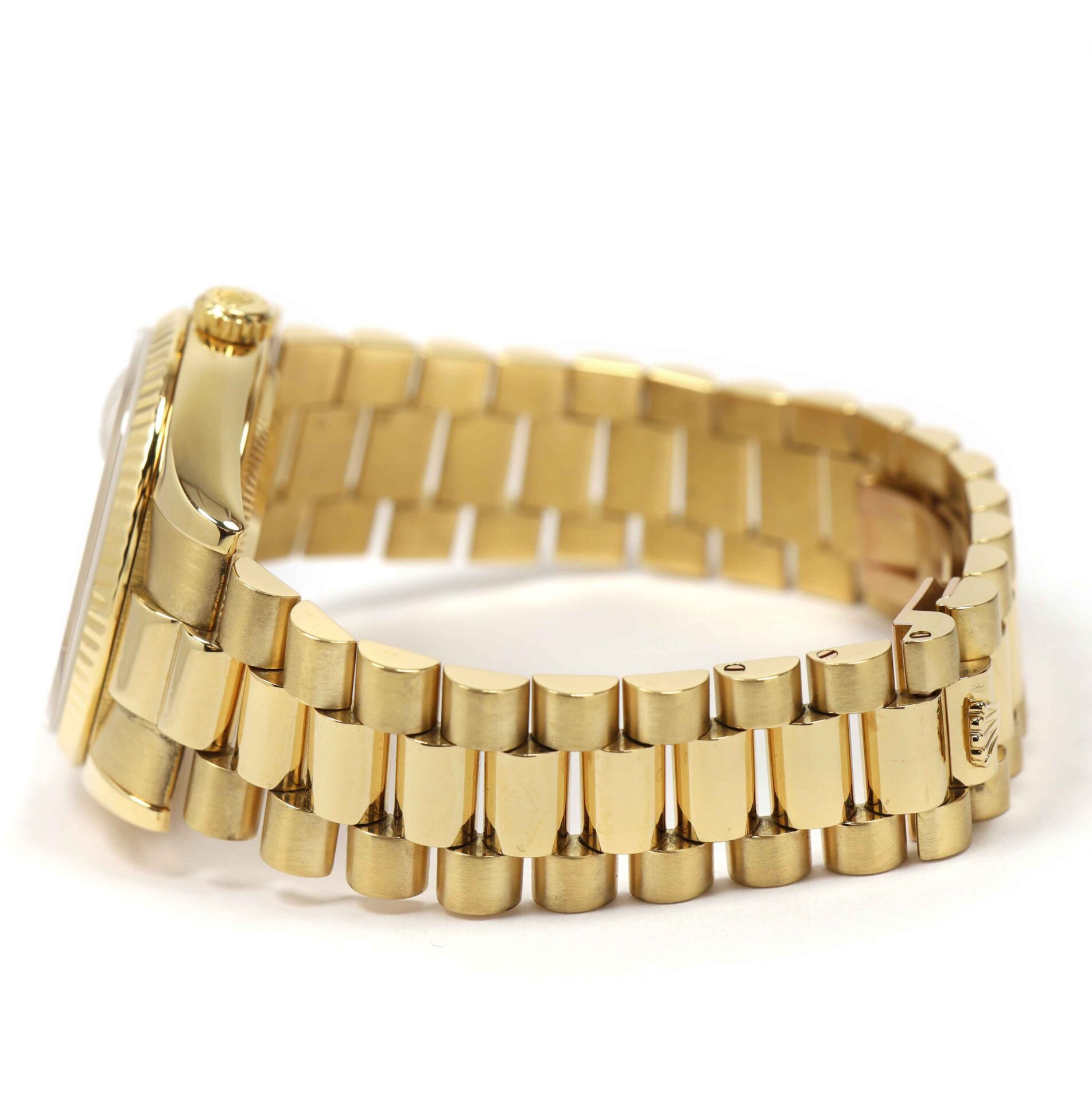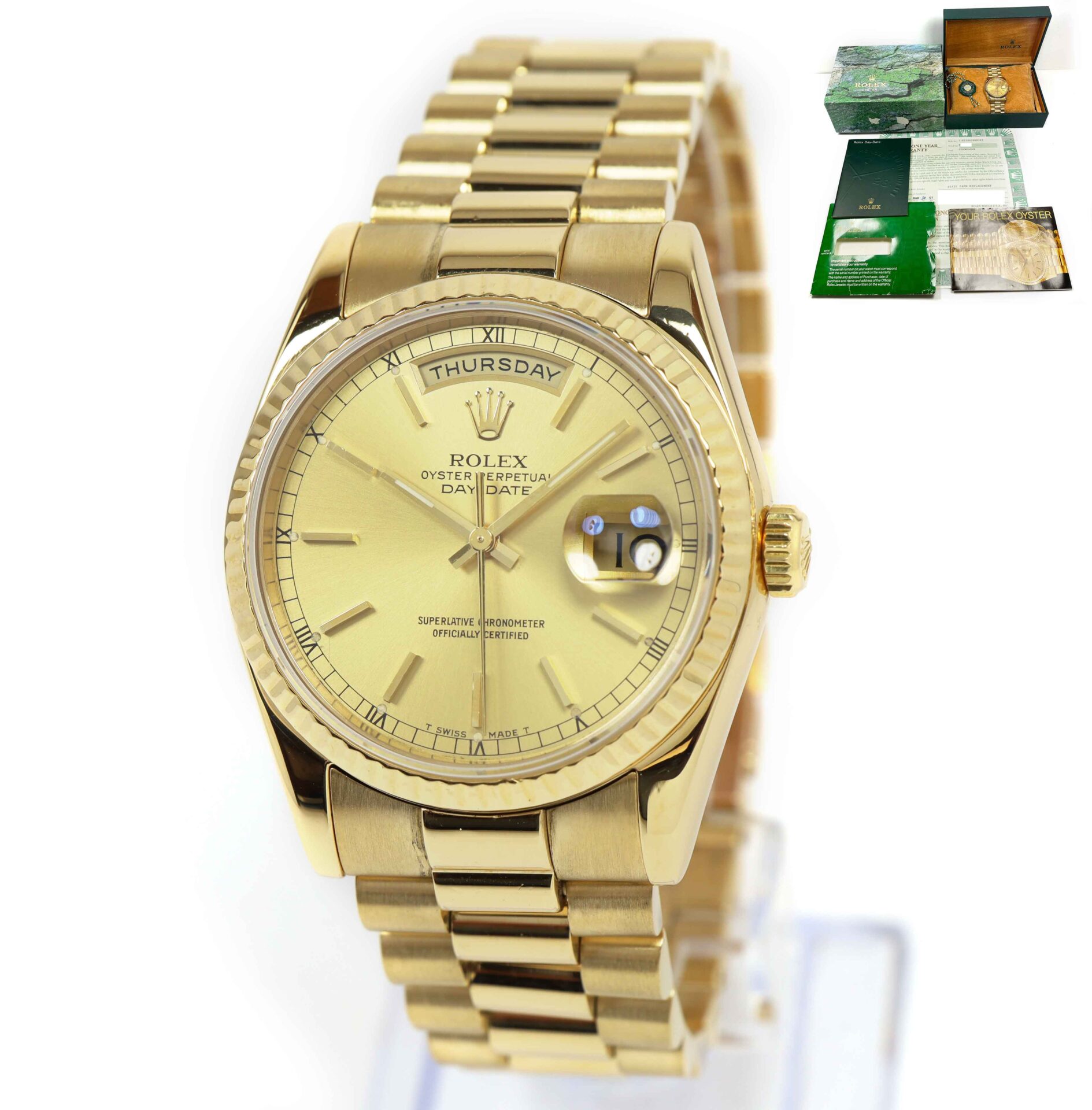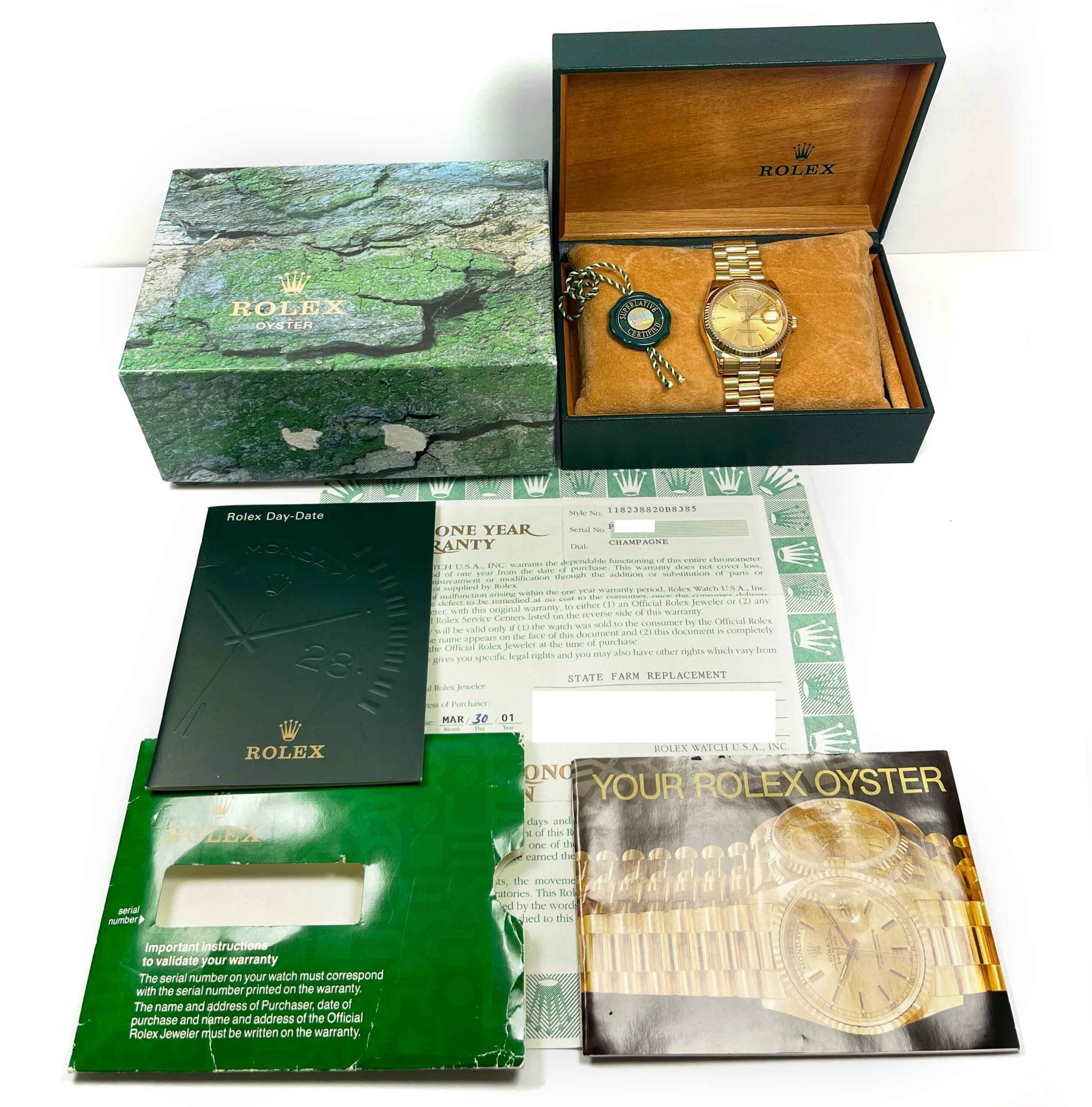 THIS ROLEX PRESIDENT IS IN GREAT CONDITION FOR ITS AGE SHOWING SOME LIGHT WEAR AND COMES WITH ITS BOX, BOOKLETS, HANG TAG, AND WARRANTY PAPER DATED MARCH 30TH, 2001 AS SHOWN IN THE PICTURES ATTACHED. THIS WATCH IS IN STOCK AND AVAILABLE TO SHIP IMMEDIATELY!...