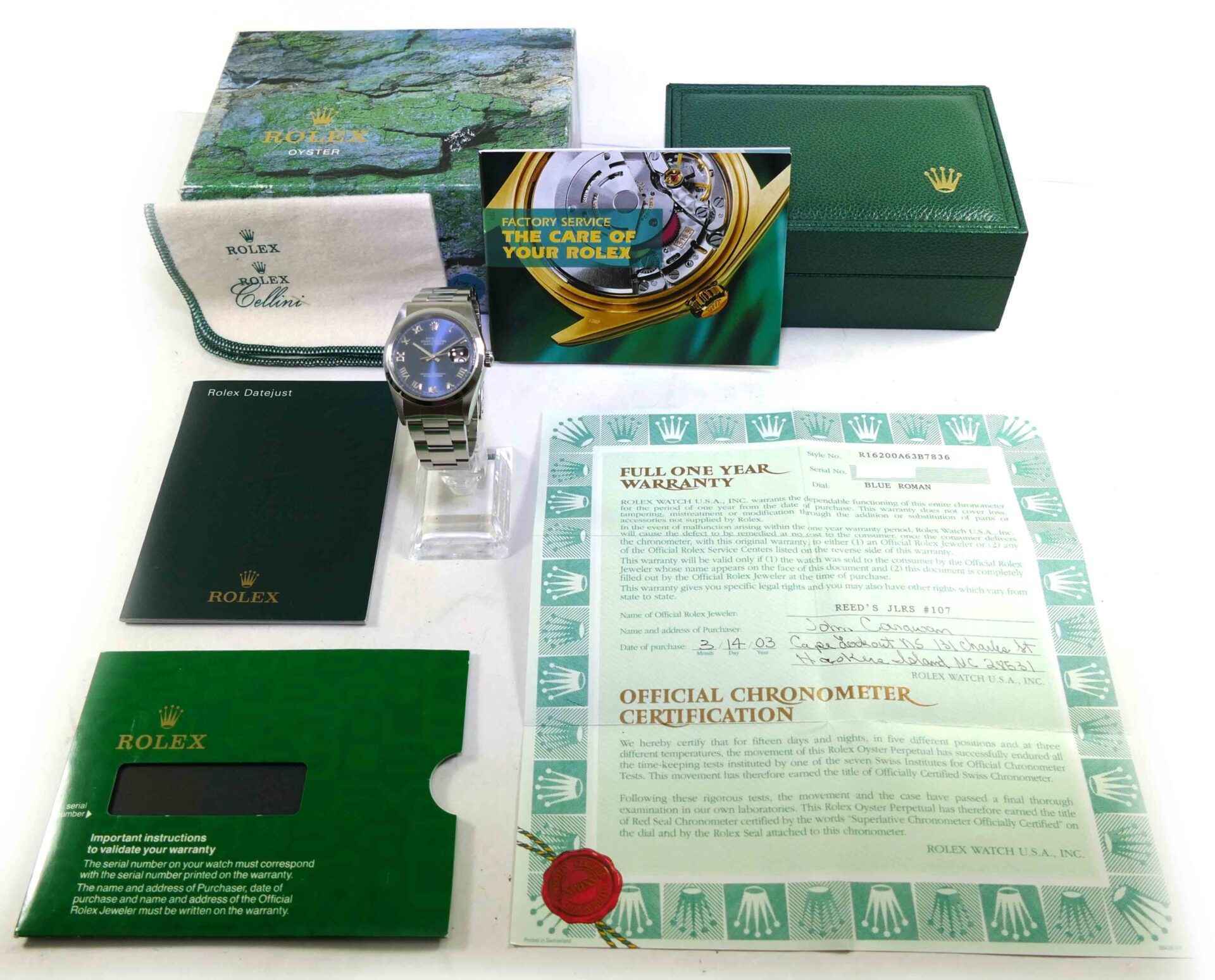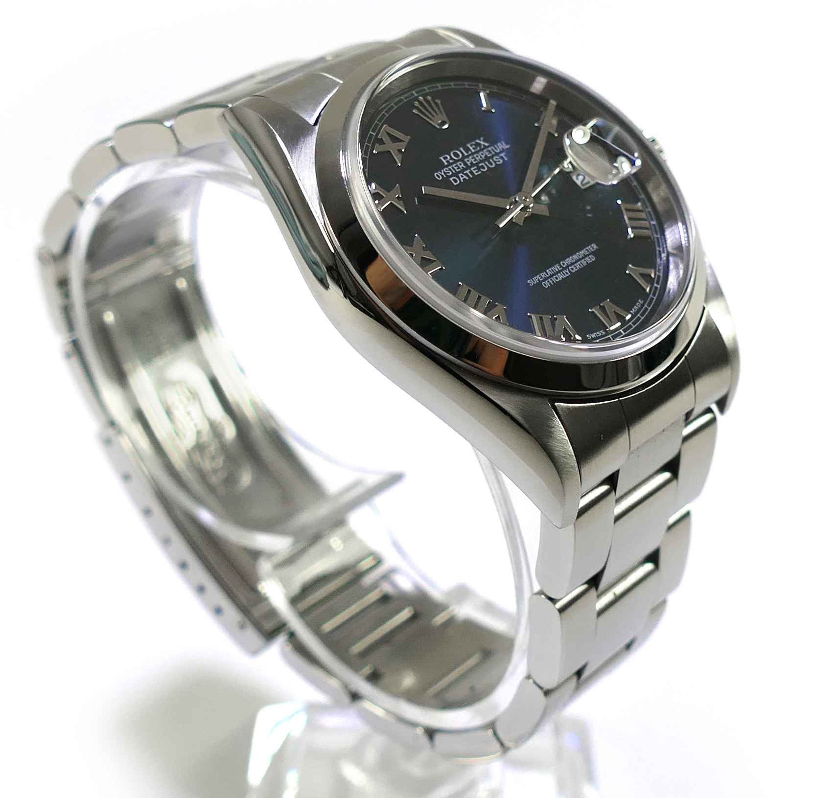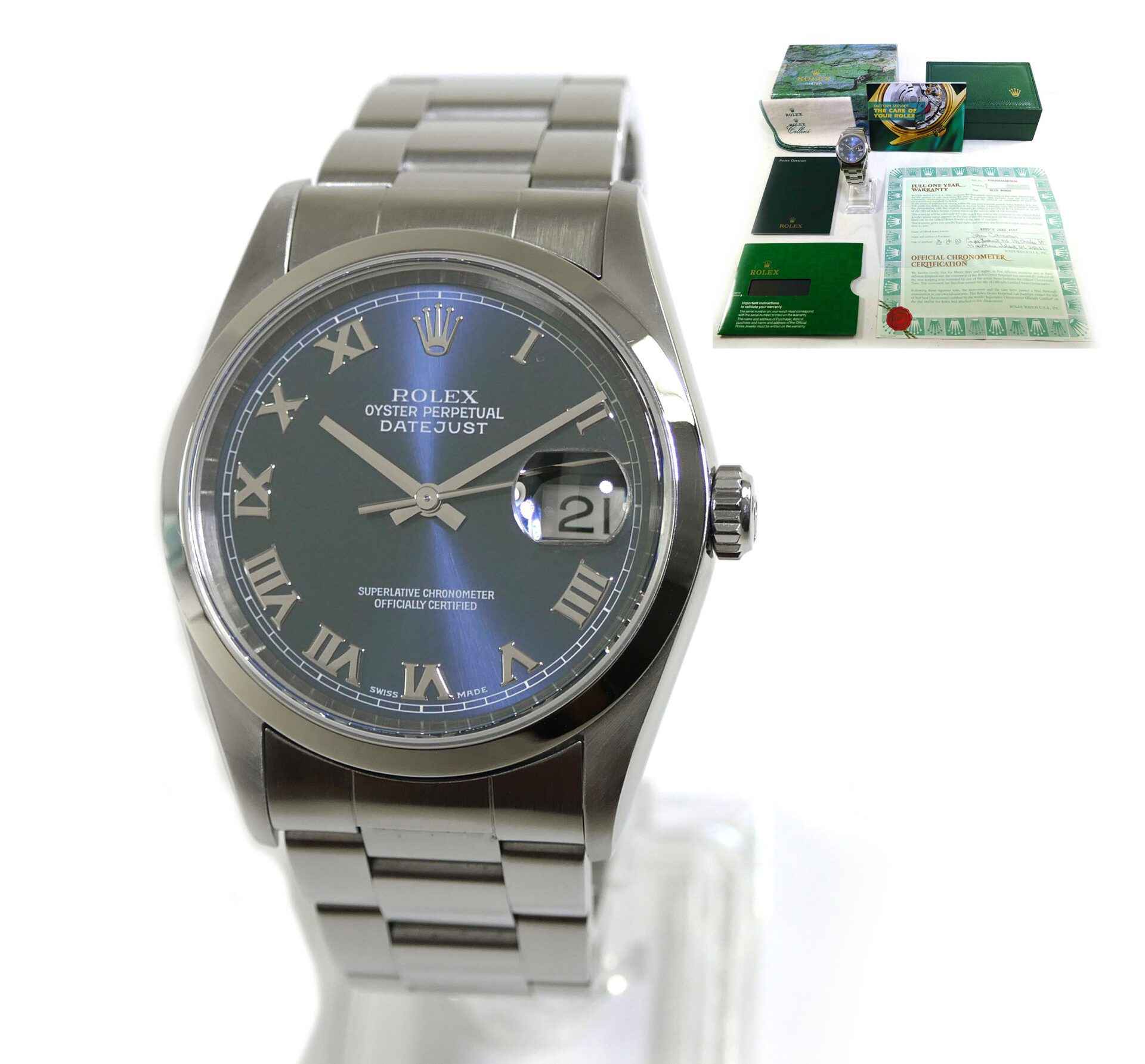 Read Morethis rolex datejust is in amazing condition and comes with its complete set of original box and papers. The paperwork states the blue roman dial, this is a very rare combo to have a factory blue roman dial on oyster bracelet. The condition combined with the dial and bracelet combo makes this an amazing collectors item! the warranty certificate is dated march 14th, 2003, and the serial starts with the letter k.