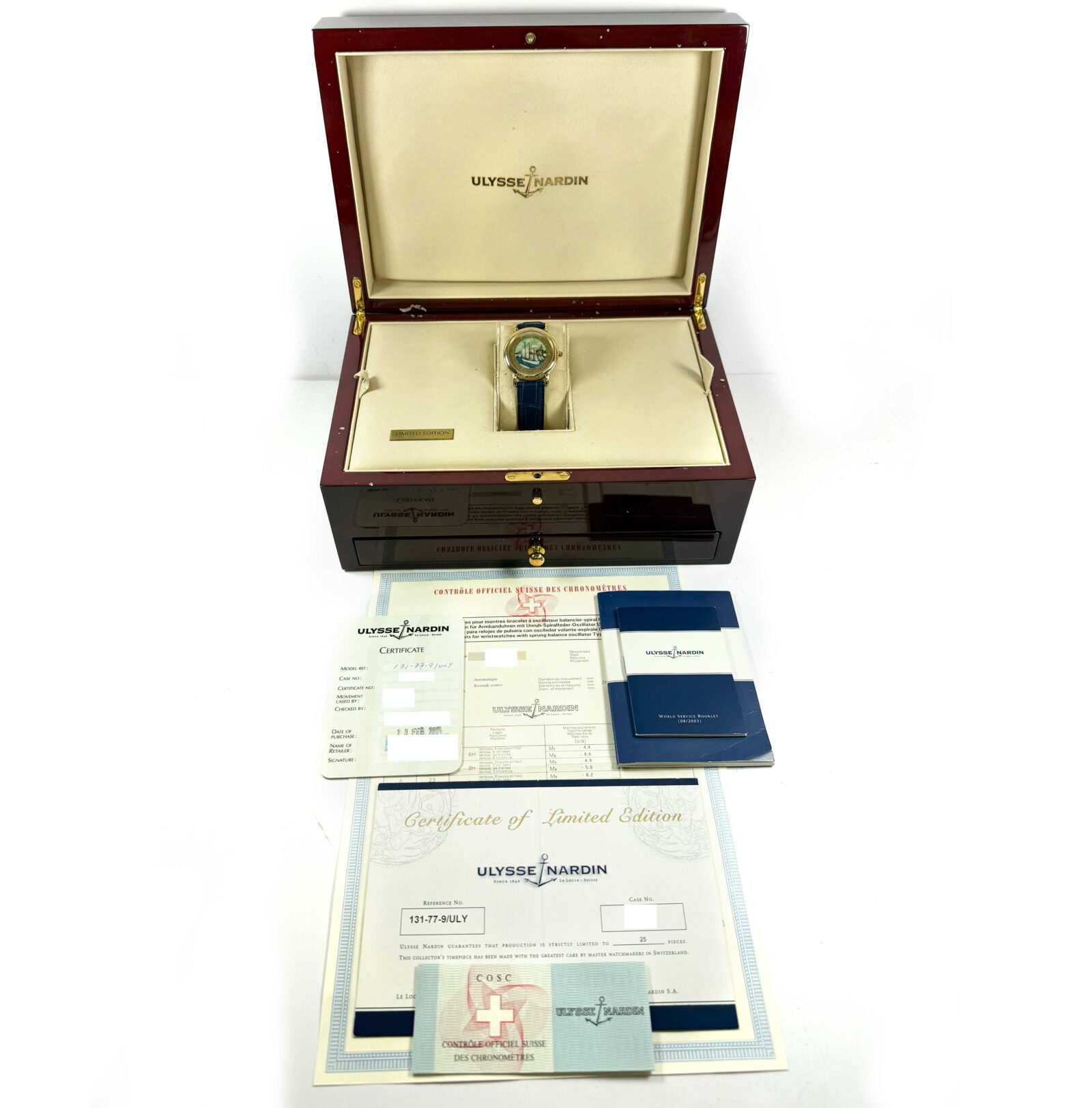 This Ulysse Nardin watch is in excellent overall condition for the age of the watch showing some light signs of surface wear consistent with preowned watches. A true collector’s item, this piece is part of a rare 25 piece limited edition created to celebrate U...