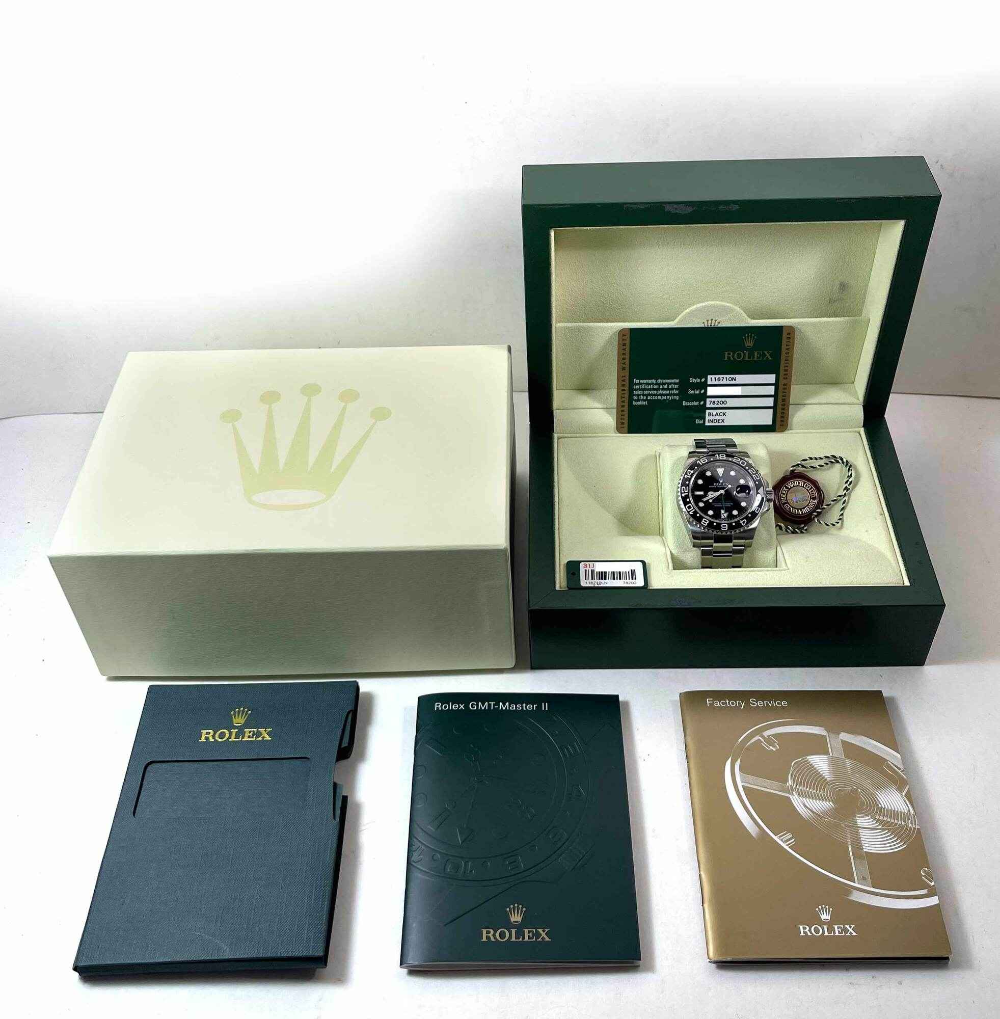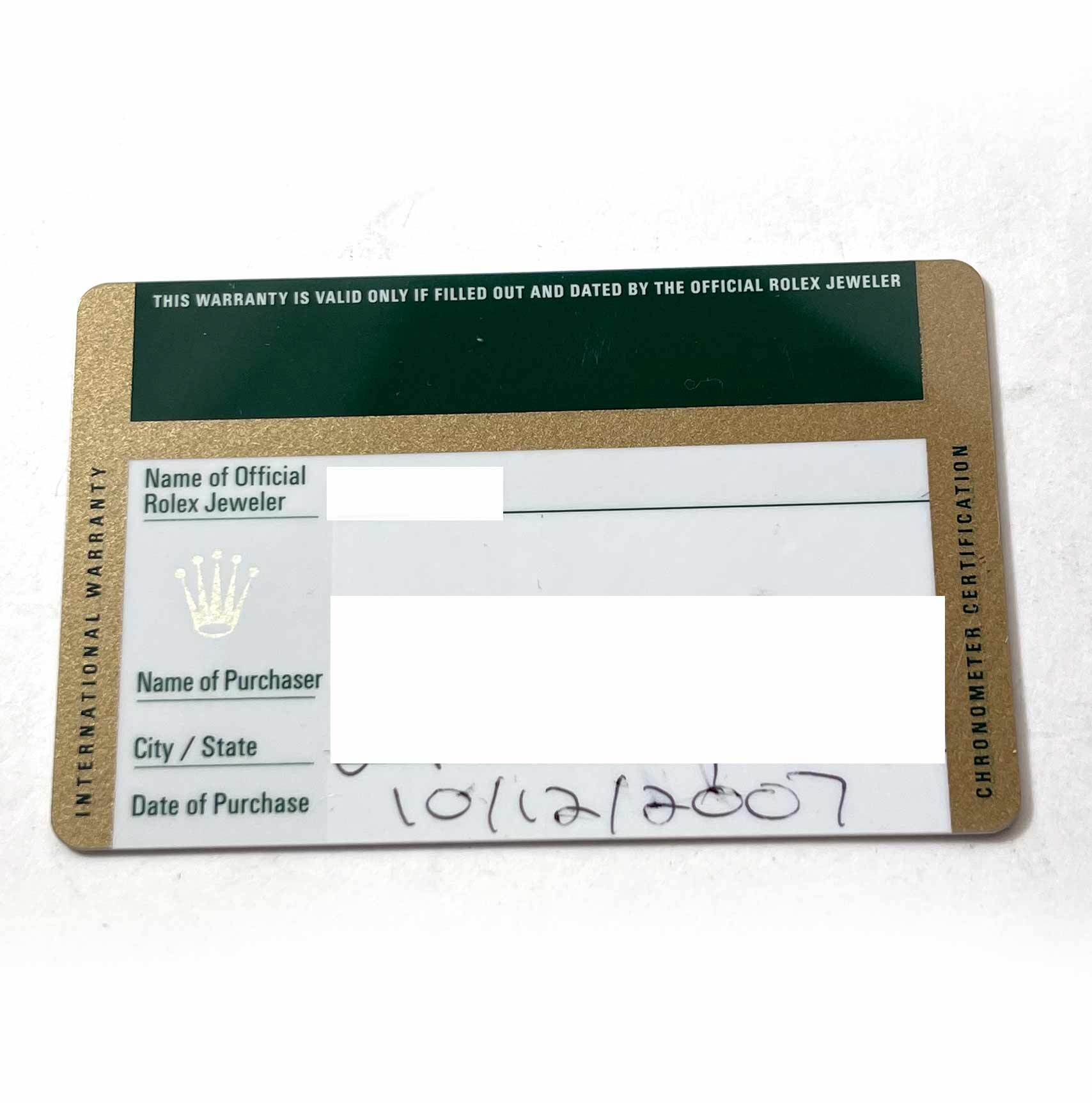 THIS ROLEX IS IN EXCELLENT CONDITION AND COMES WITH ITS BOX, BOOKLETS, BOTH HANG TAGS, AND WARRANTY CARD DATED DECEMBER 10TH, 2007 AS SHOWN IN THE PICTURES ATTACHED. THIS WATCH IS IN STOCK AND AVAILABLE TO SHIP IMMEDIATELY!