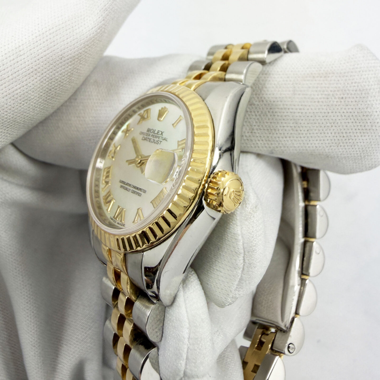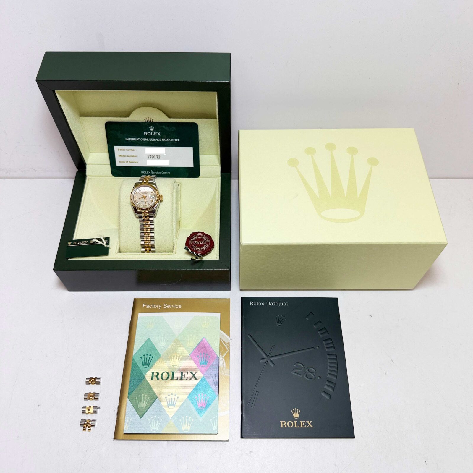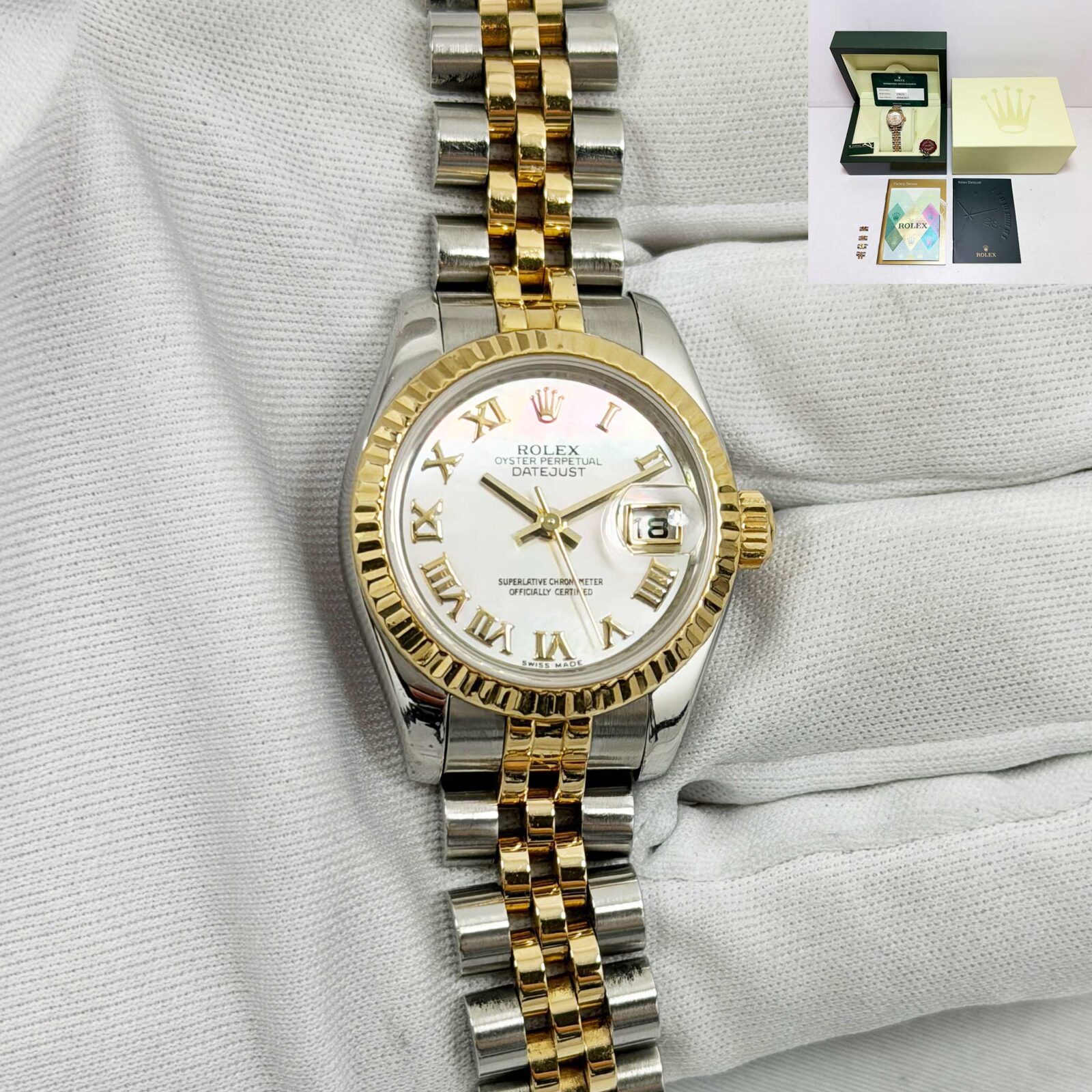 This Rolex Lady-Datejust watch comes with its booklets, hangtags, service papers, extra links, and warranty booklets dated June, 2007. The photos shown are of the exact watch being sold and accurately represent its condition. This watch is in stock and ready t...