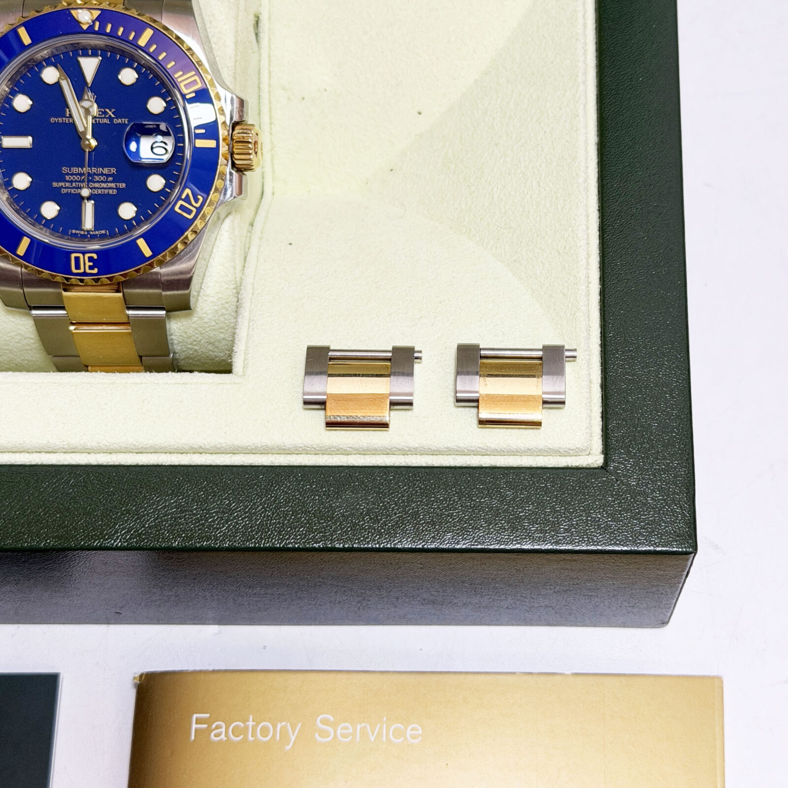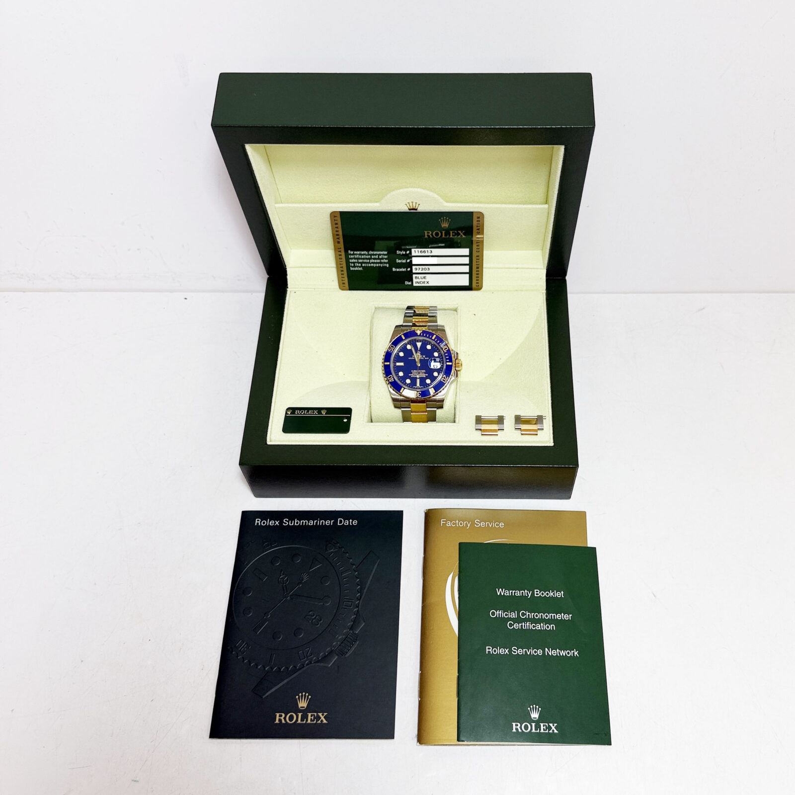 this rolex submariner “bluesy” comes with its box, booklets, hangtag, extra links, and warranty card dated april, 2010. The photos shown are of the exact watch being sold and accurately represent its condition. This watch is in stock and ready to ship immediately!