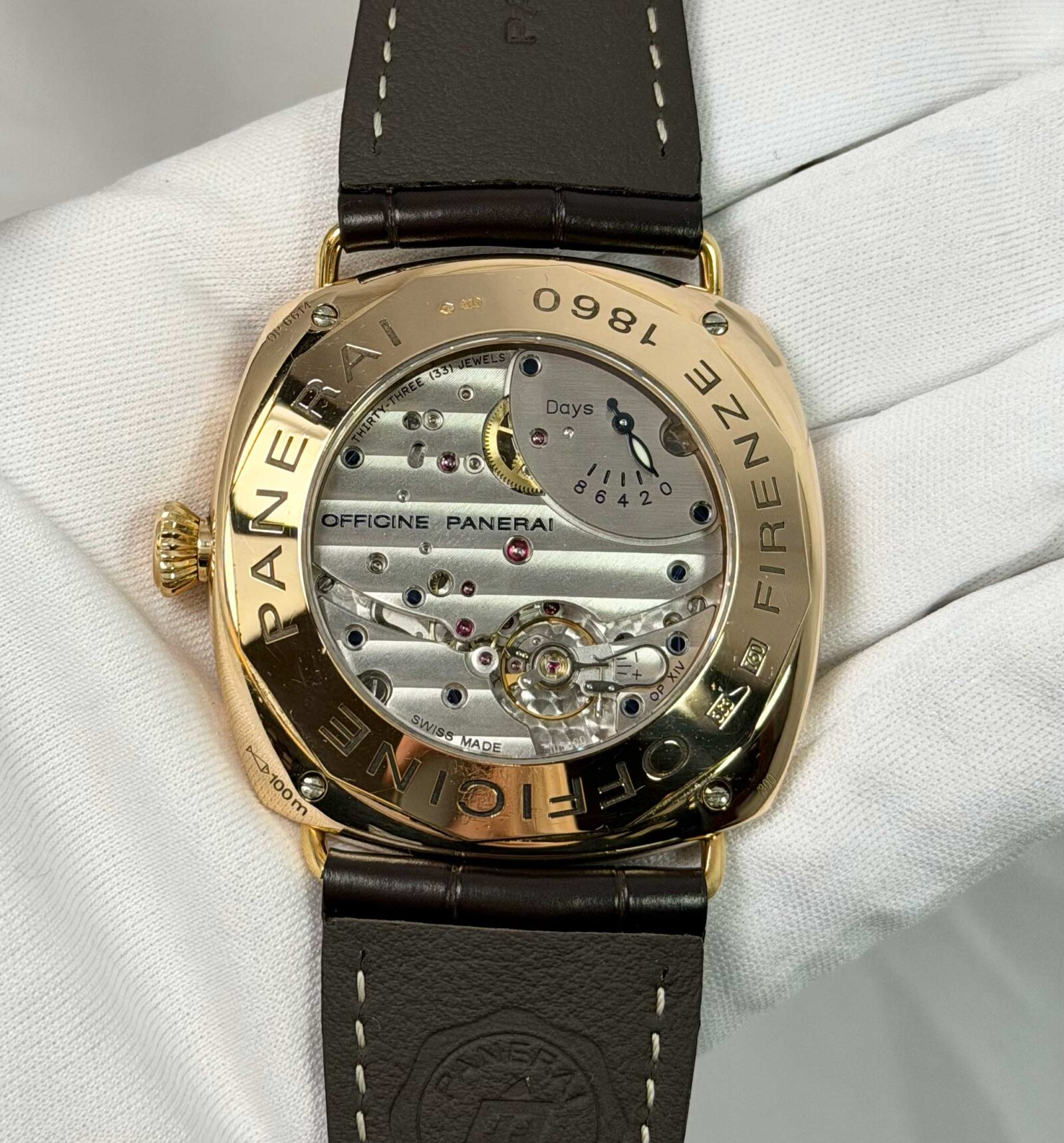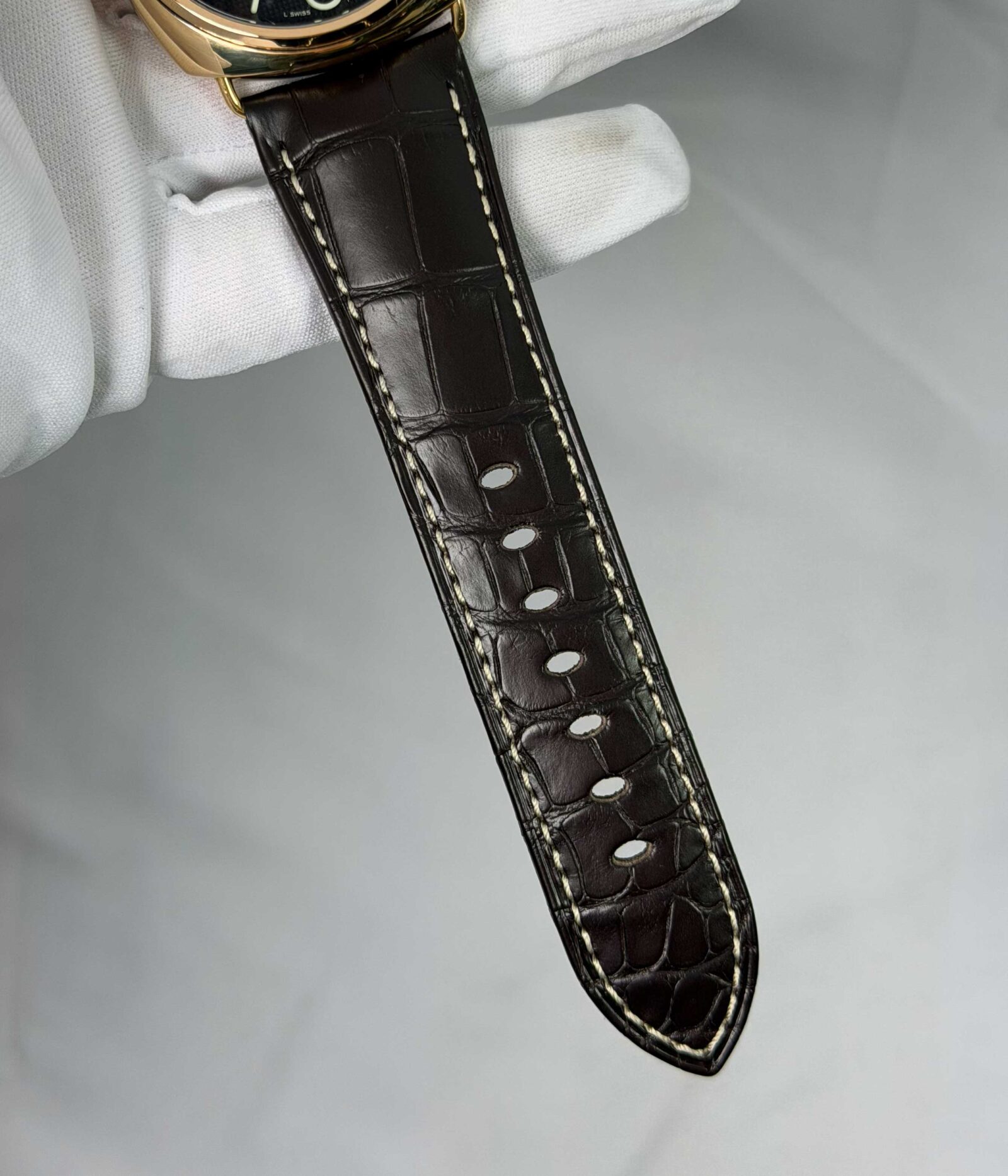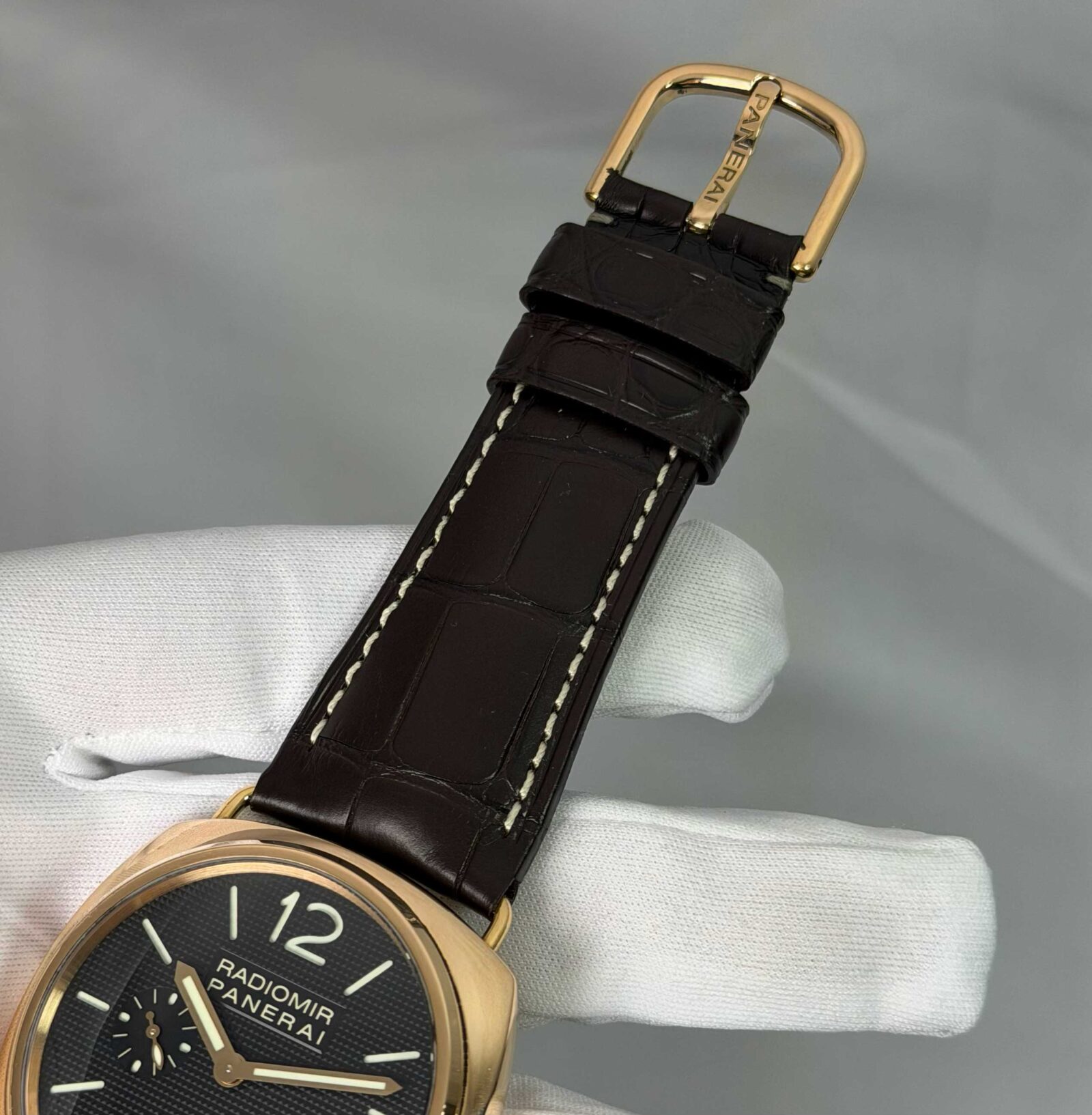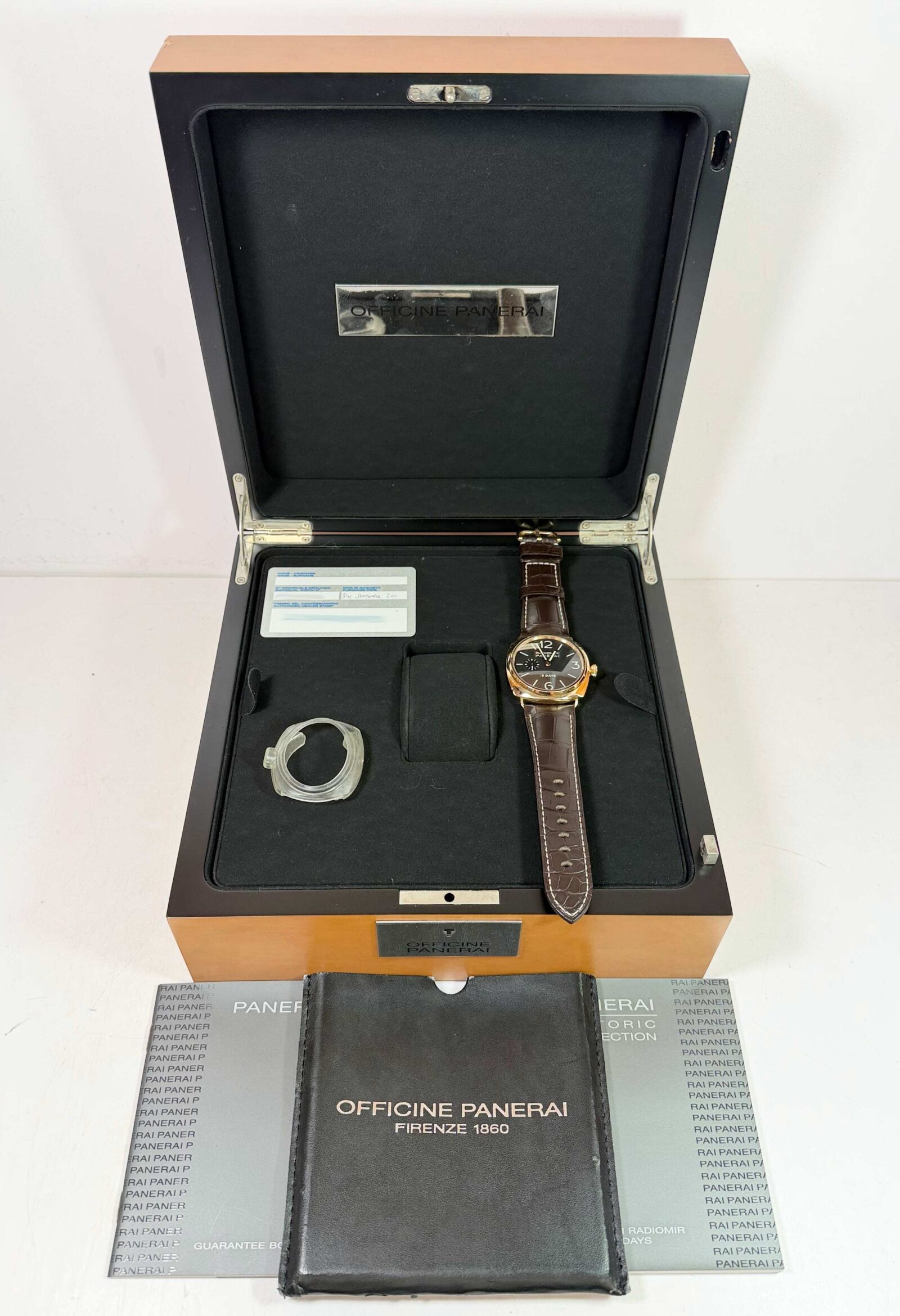 this panerai watch is in excellent overall condition showing some signs of surface wear consistent with preowned watches. This comes with its box, booklets, bezel protector, and warranty card dated september 2011 as shown in the pictures attached. Please note we purchased a brand new panerai strap for this watch. This watch is in stock and available to ship immediately!
