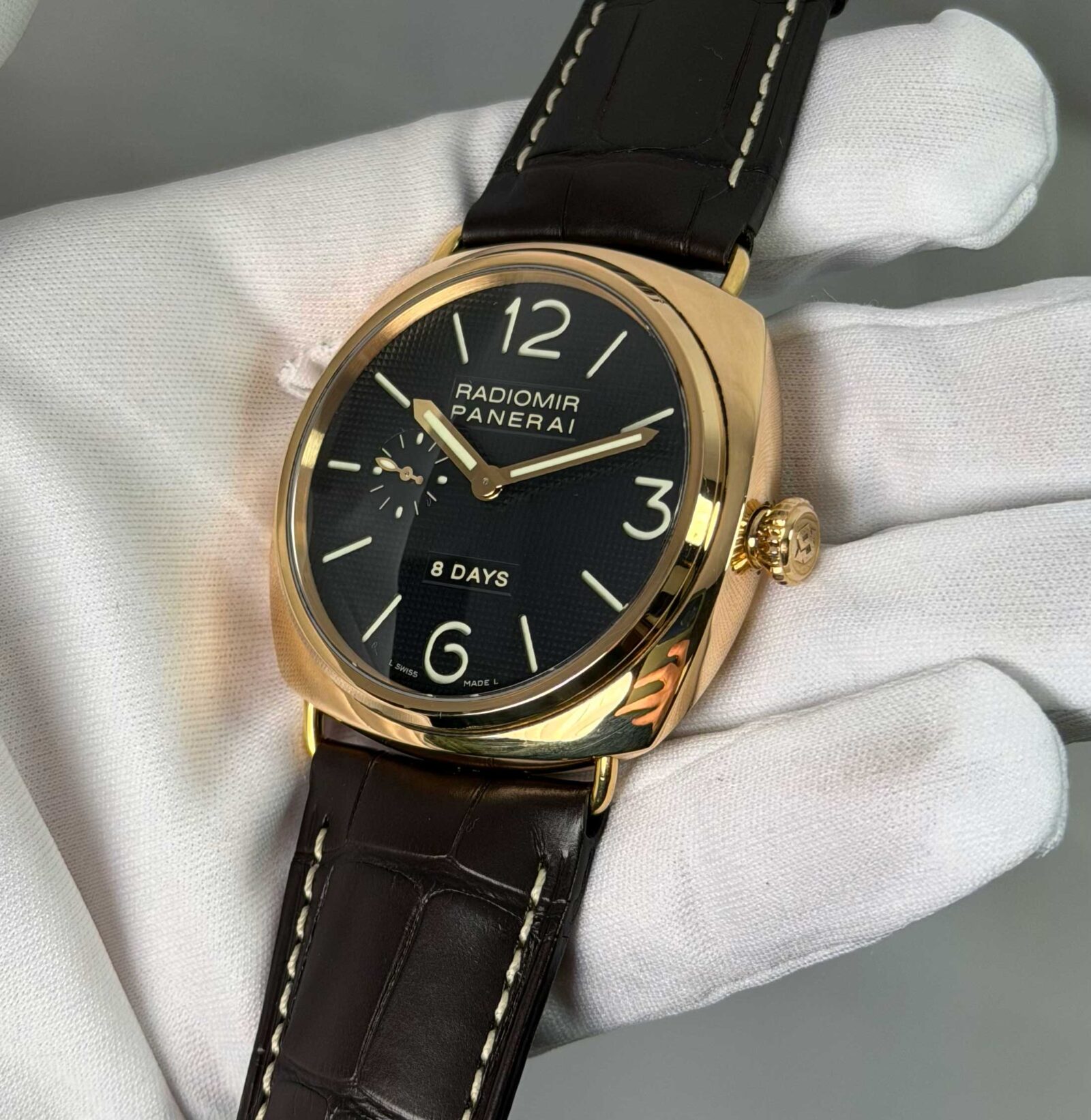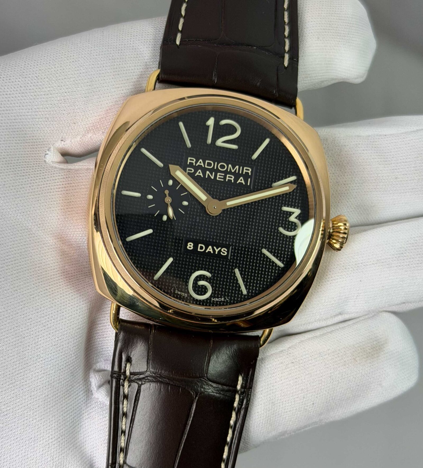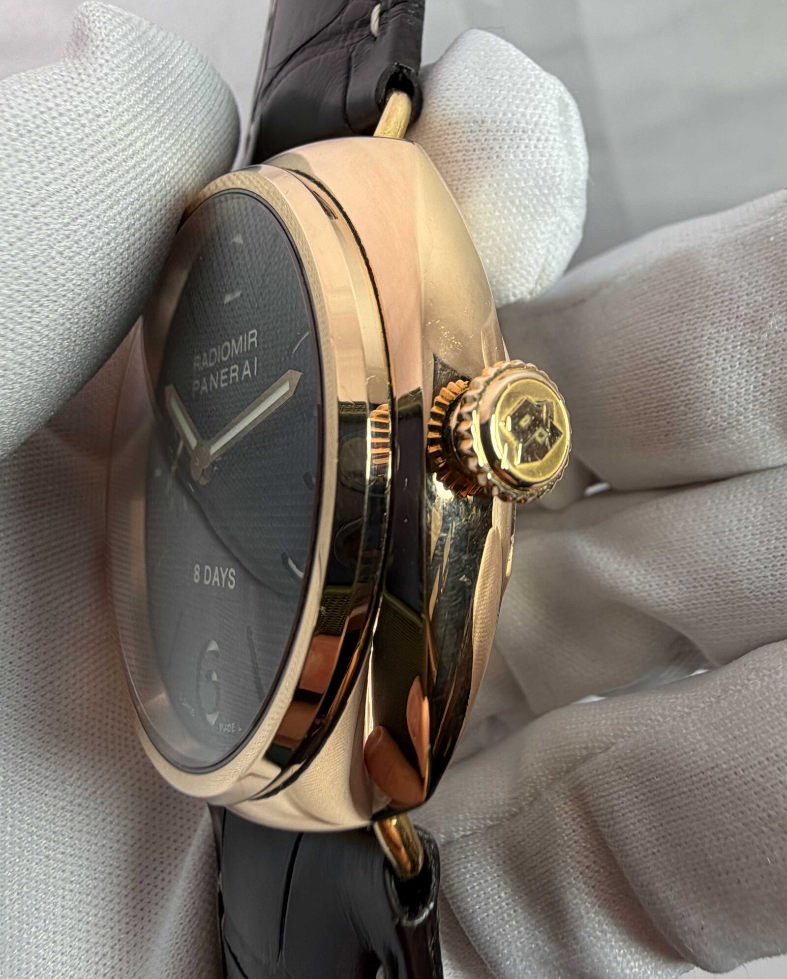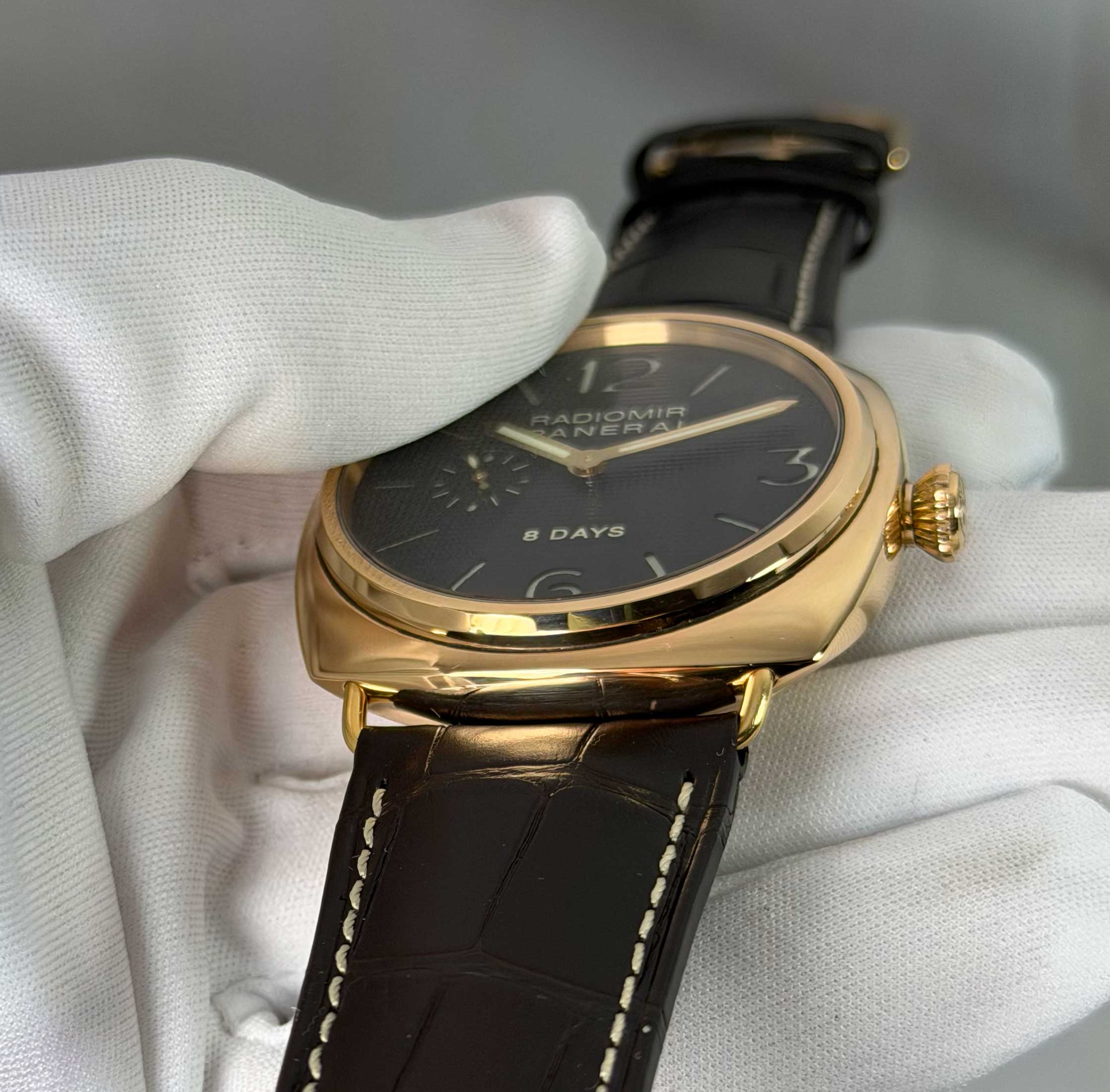 this panerai watch is in excellent overall condition showing some signs of surface wear consistent with preowned watches. This comes with its box, booklets, bezel protector, and warranty card dated september 2011 as shown in the pictures attached. Please note we purchased a brand new panerai strap for this watch. This watch is in stock and available to ship immediately!