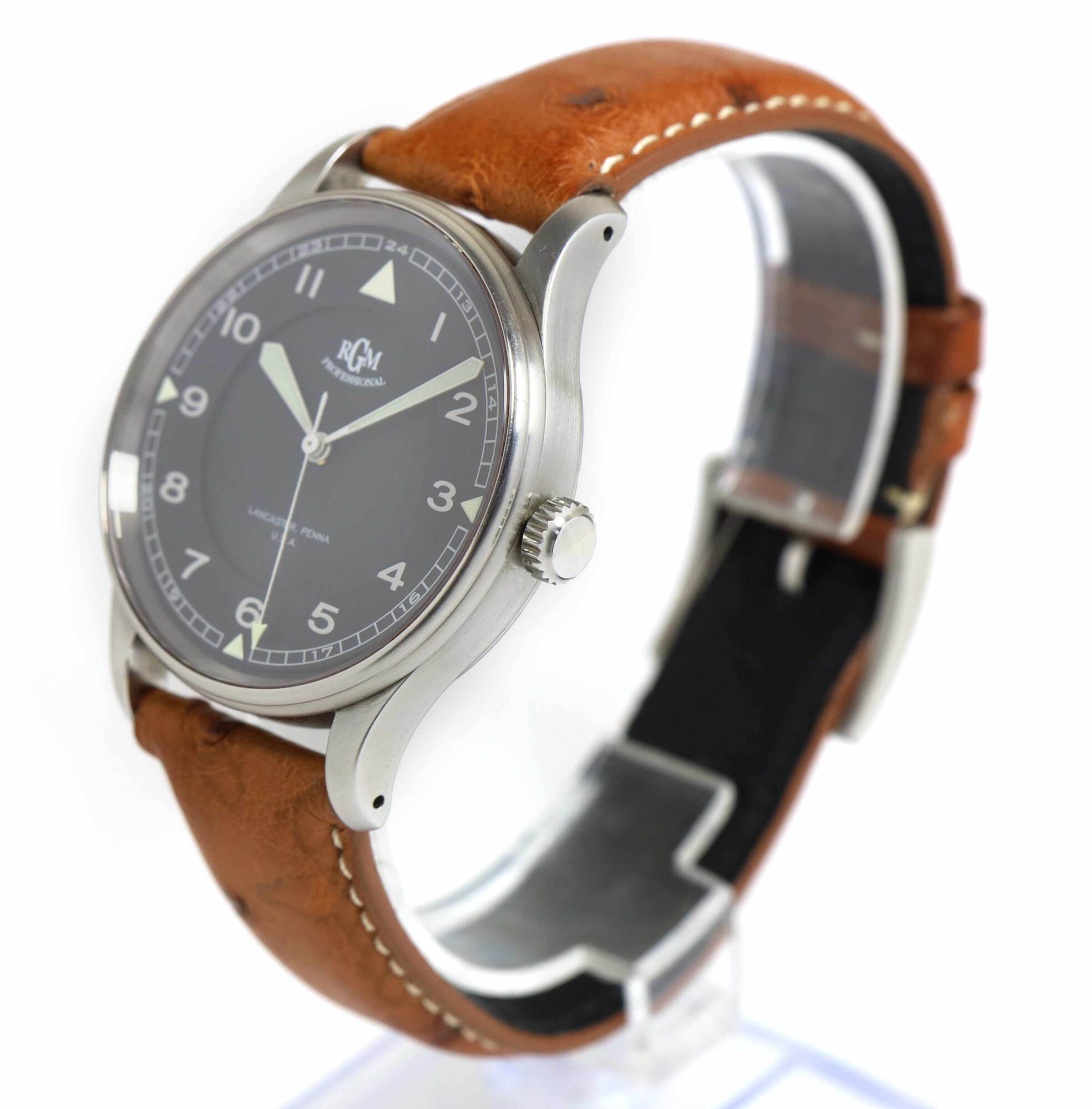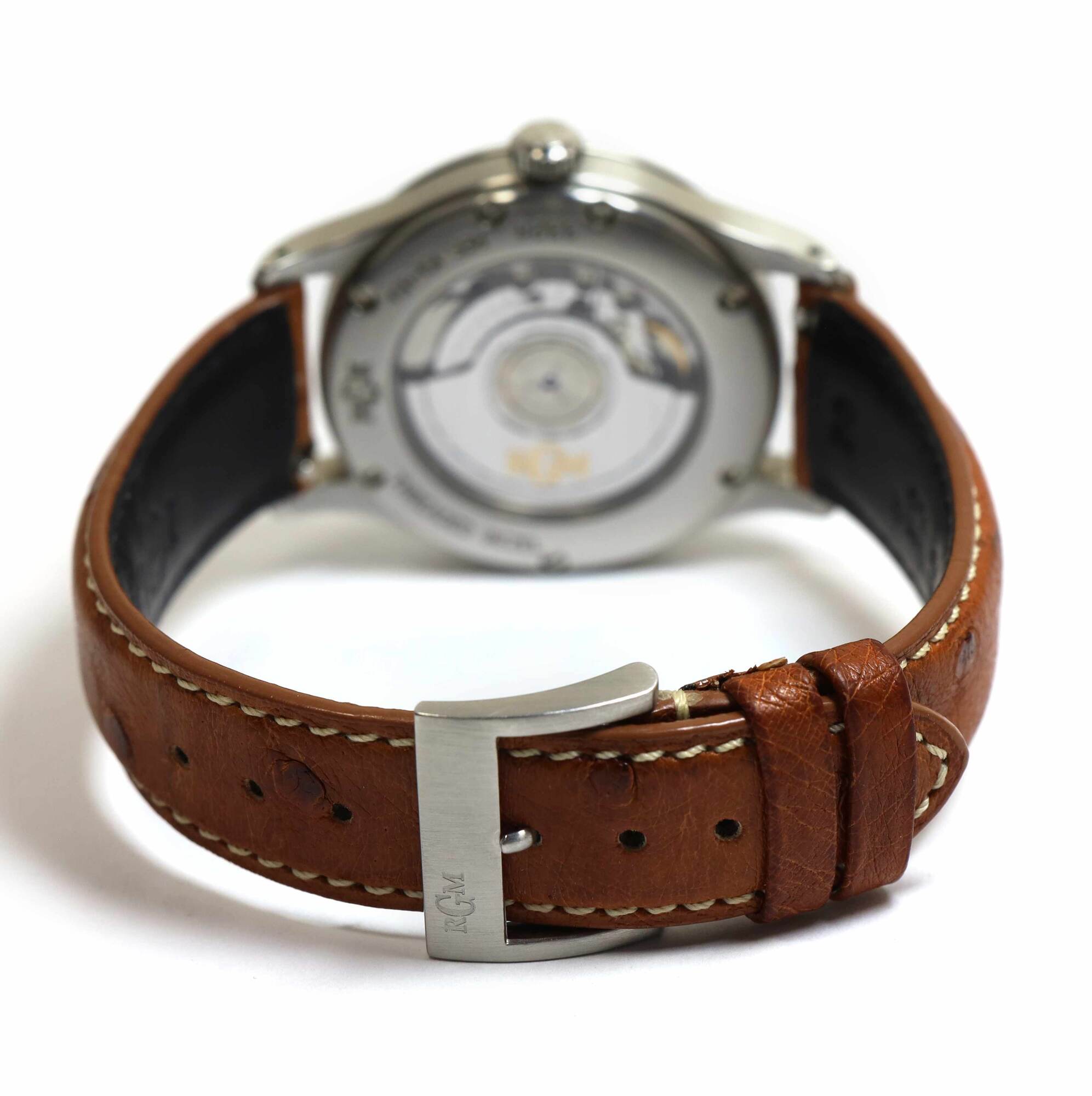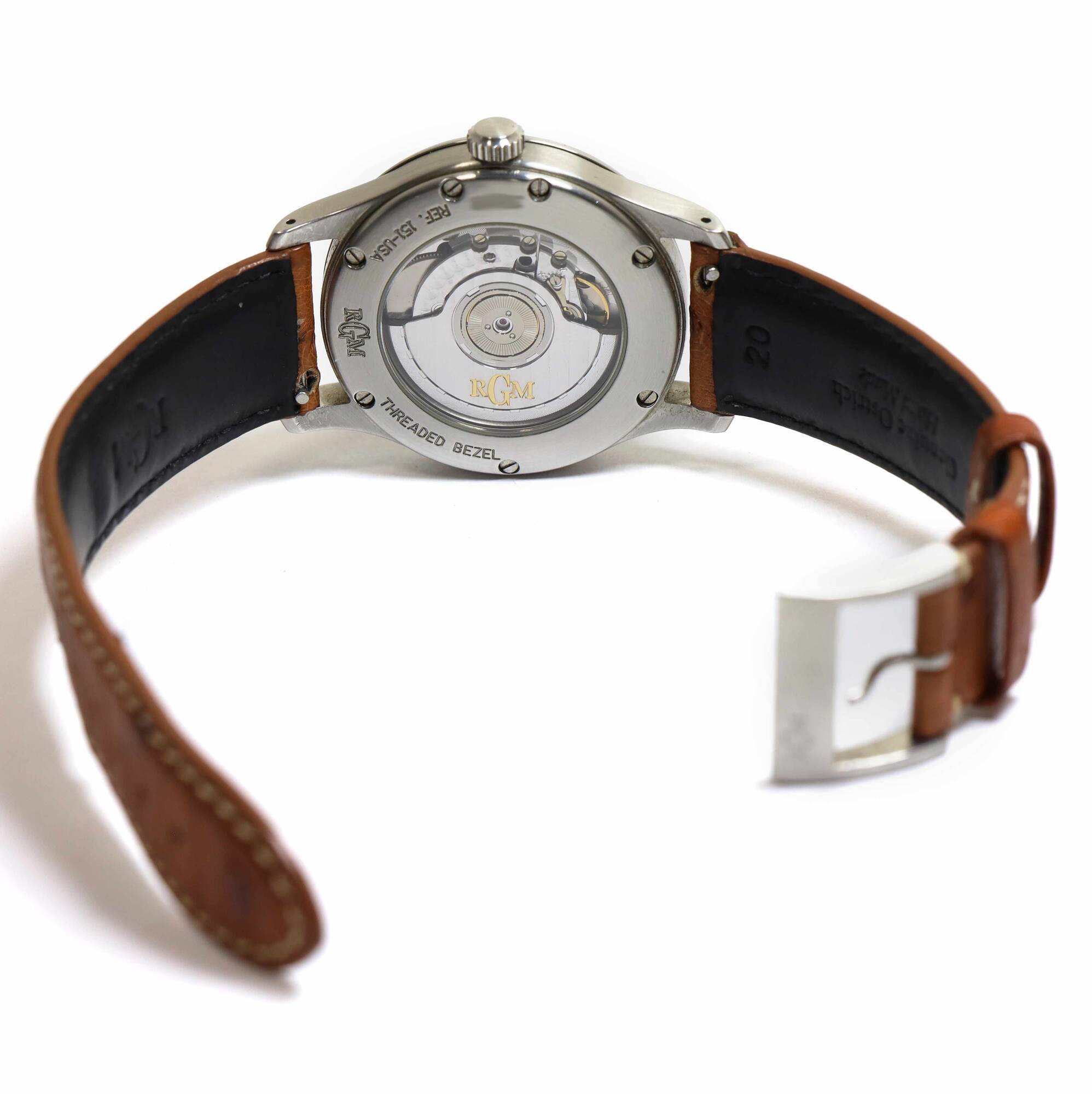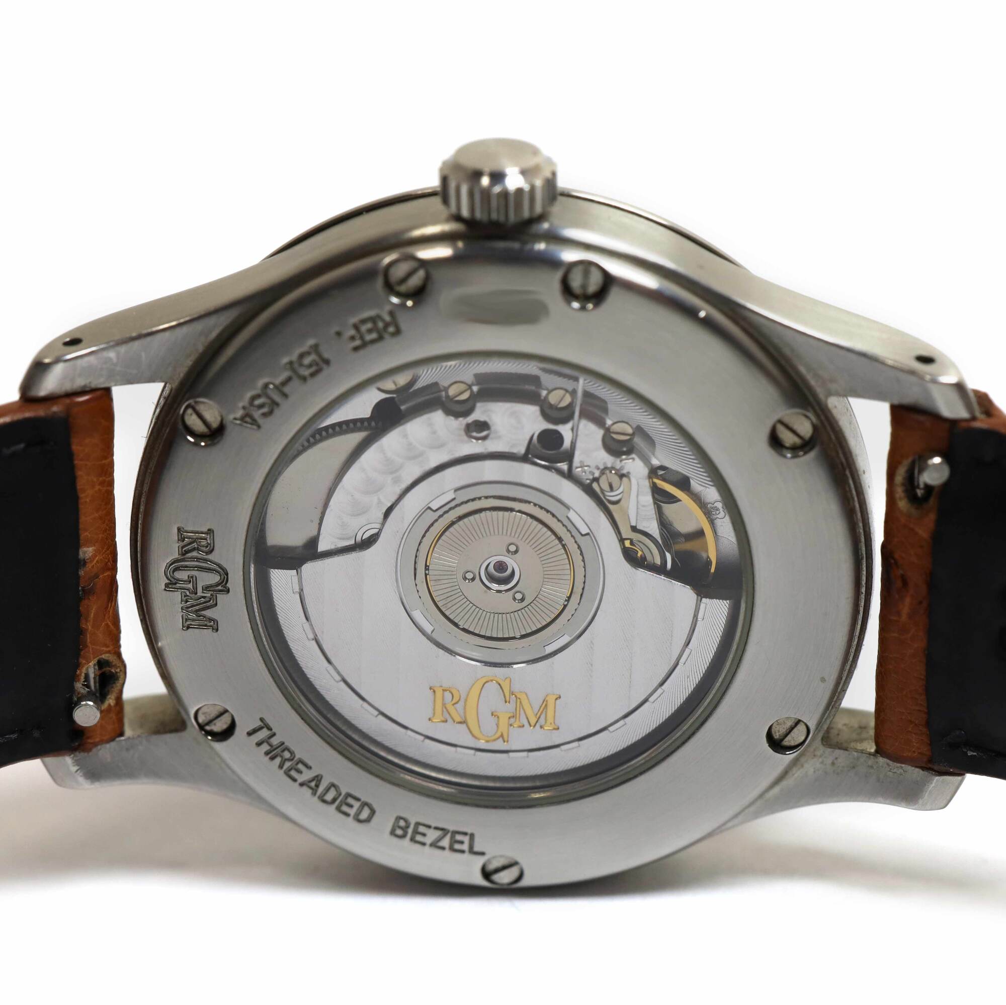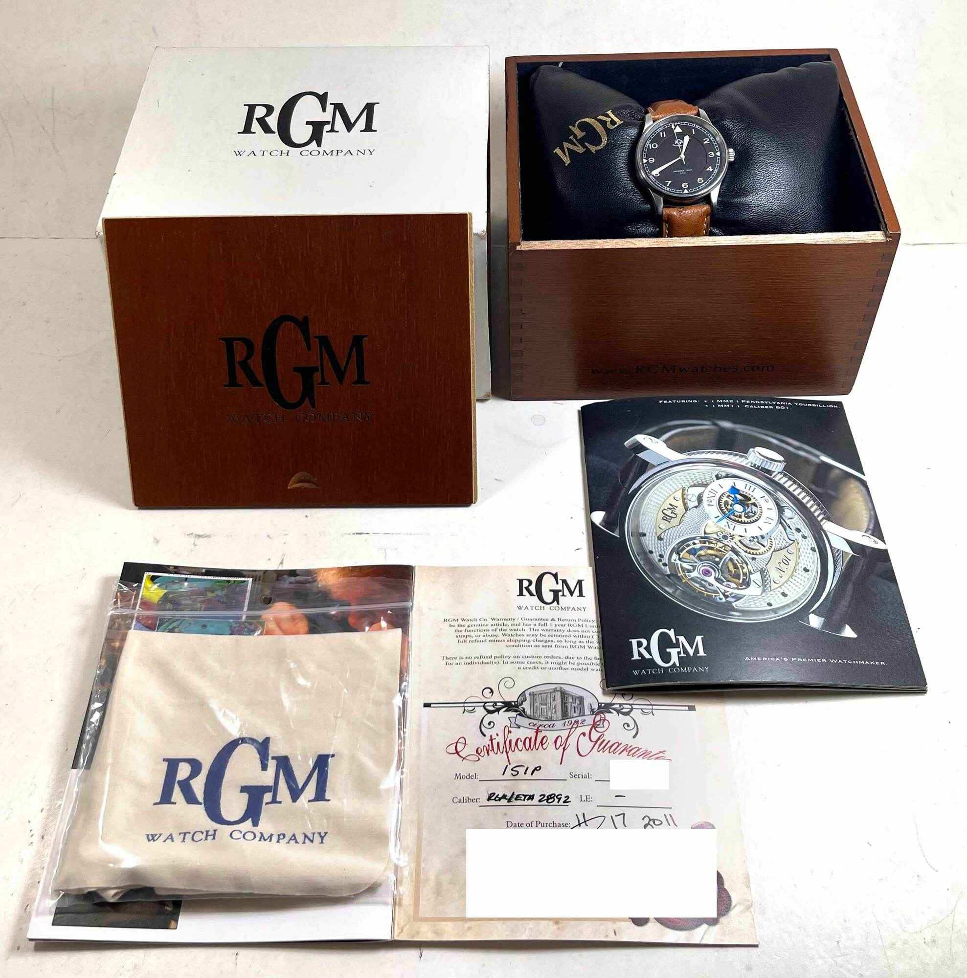THIS RGM WATCH IS IN EXCELLENT CONDITION SHOWING SOME MINOR SIGNS OF WEAR ON THE CASE CONSISTENT WITH PREOWNED WATCHES. THIS COMES WITH ITS BOX, BOOKLETS, AND WARRANTY PAPER DATED NOVEMBER 17TH, 2011 AS SHOWN IN THE PICTURES ATTACHED. THIS WATCH IS IN STOCK...