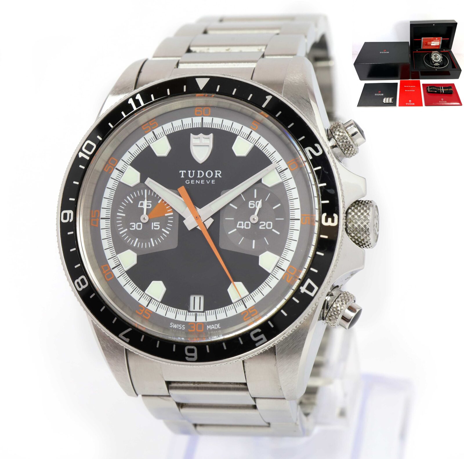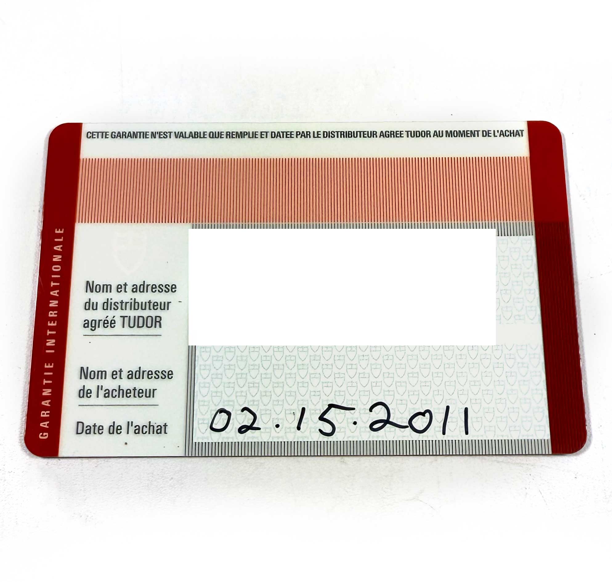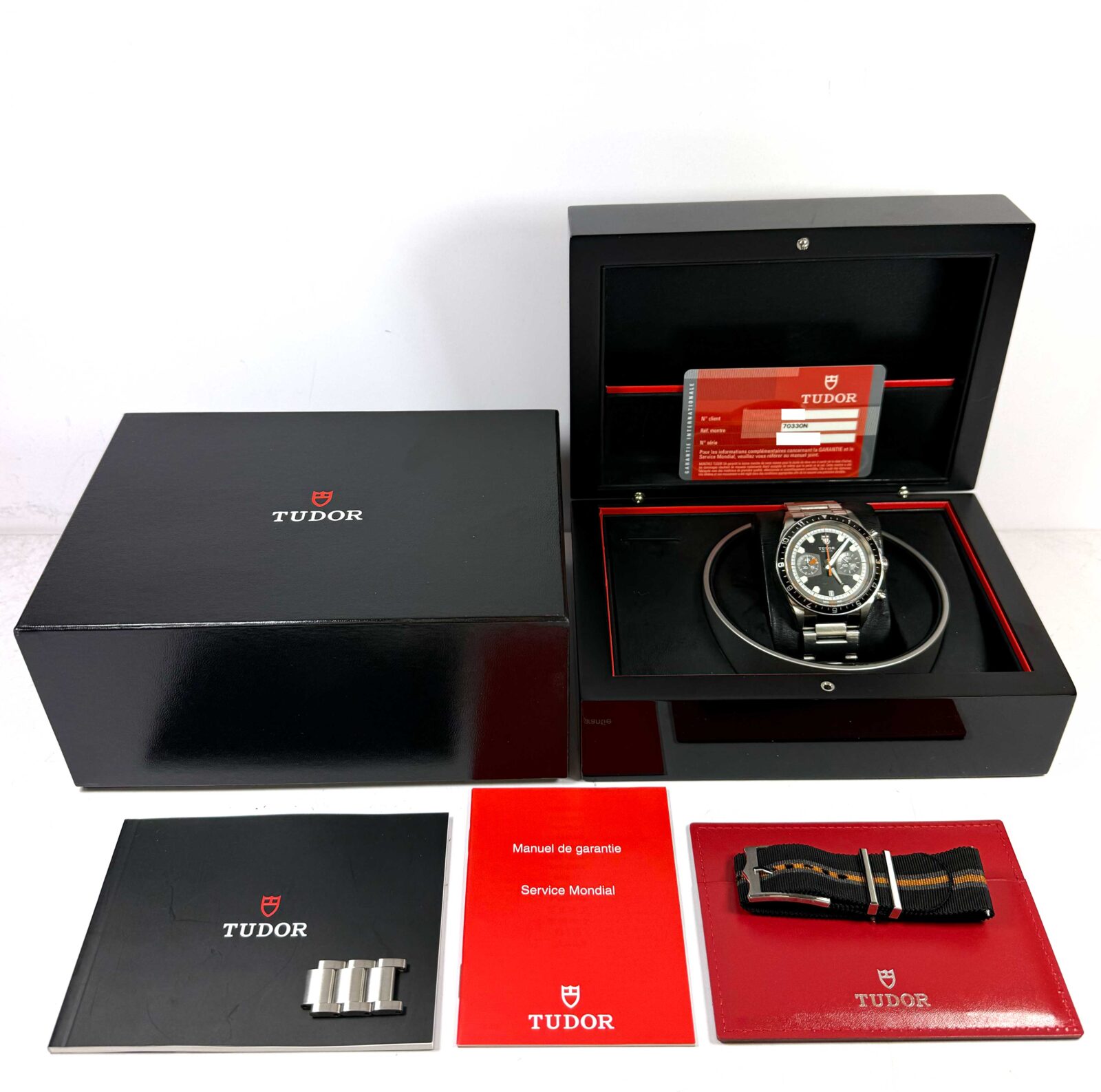 this tudor watch is in good overall condition showing signs of surface wear consistent with preowned watches. This comes with its box, booklets, spare links, one additional nato strap, and warranty card dated february 15th, 2011 as shown in the pictures attached. This watch is in stock and available to ship immediately!