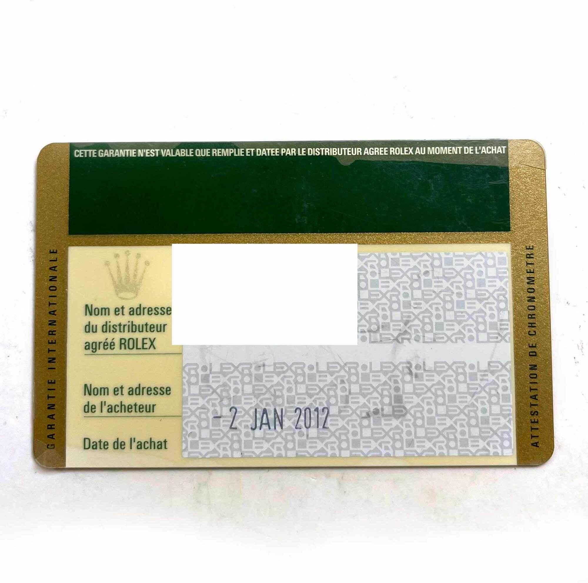 THIS ROLEX IS IN GOOD OVERALL CONDITION SHOWING SOME MINOR SIGNS OF SURFACE WEAR CONSISTENT WITH PREOWNED WATCHES. THIS COMES WITH ITS BOX, BOOKLETS, AND WARRANTY CARD DATED JANUARY 2ND, 2012 AS SHOWN IN THE PICTURES ATTACHED. THE WARRANTY CARD FOR THIS WAT...