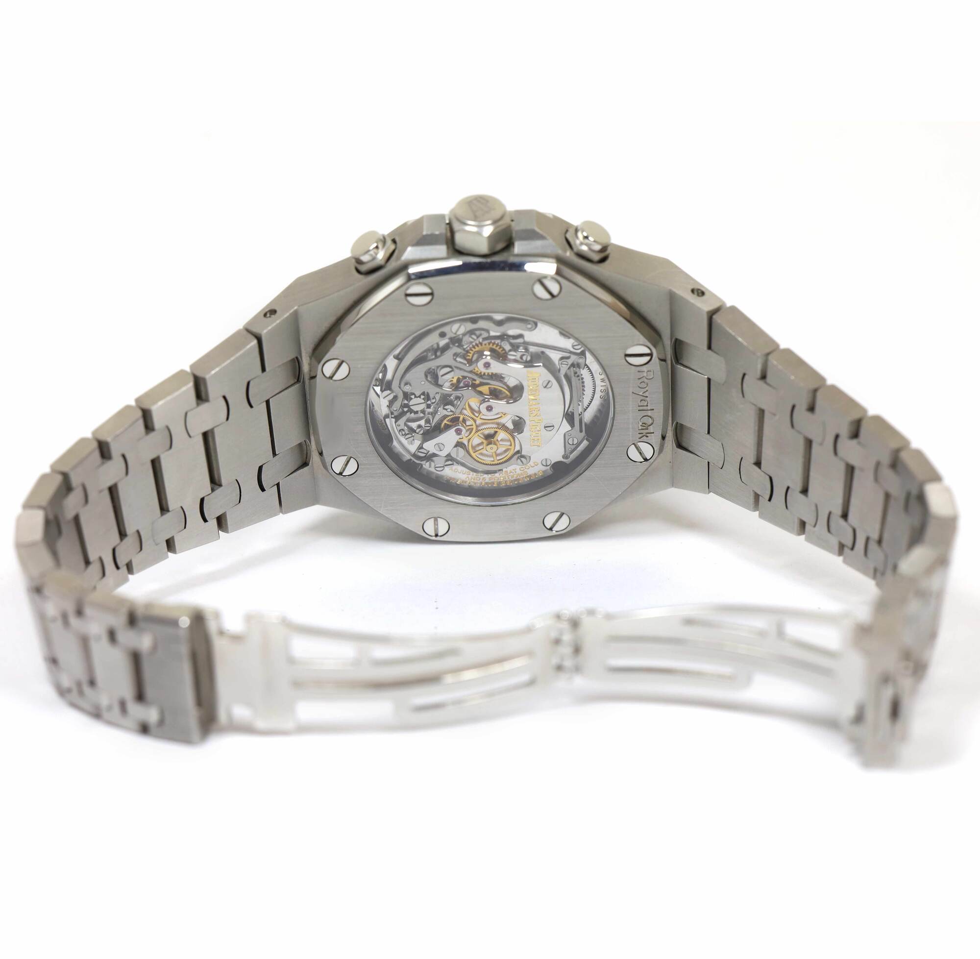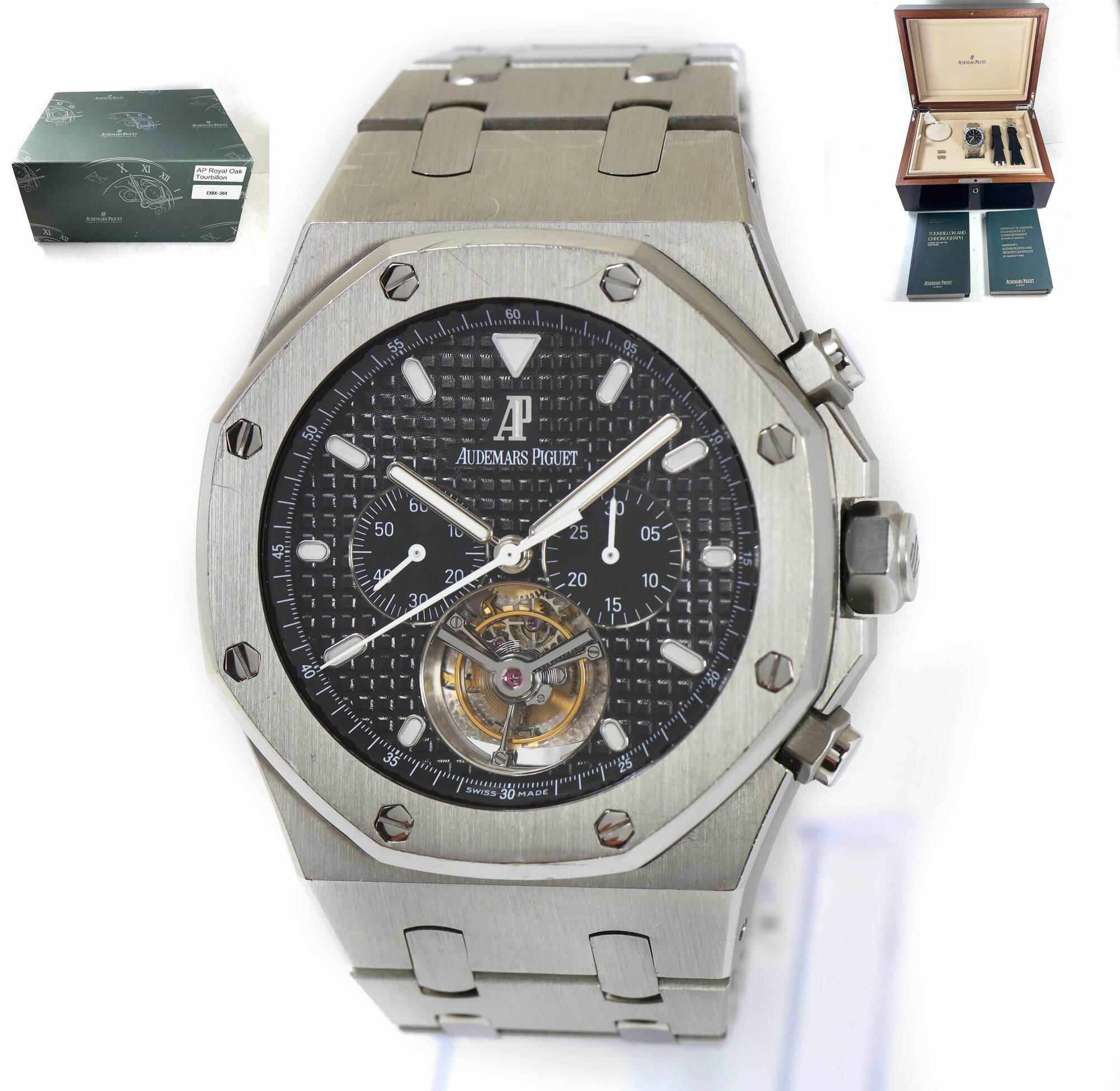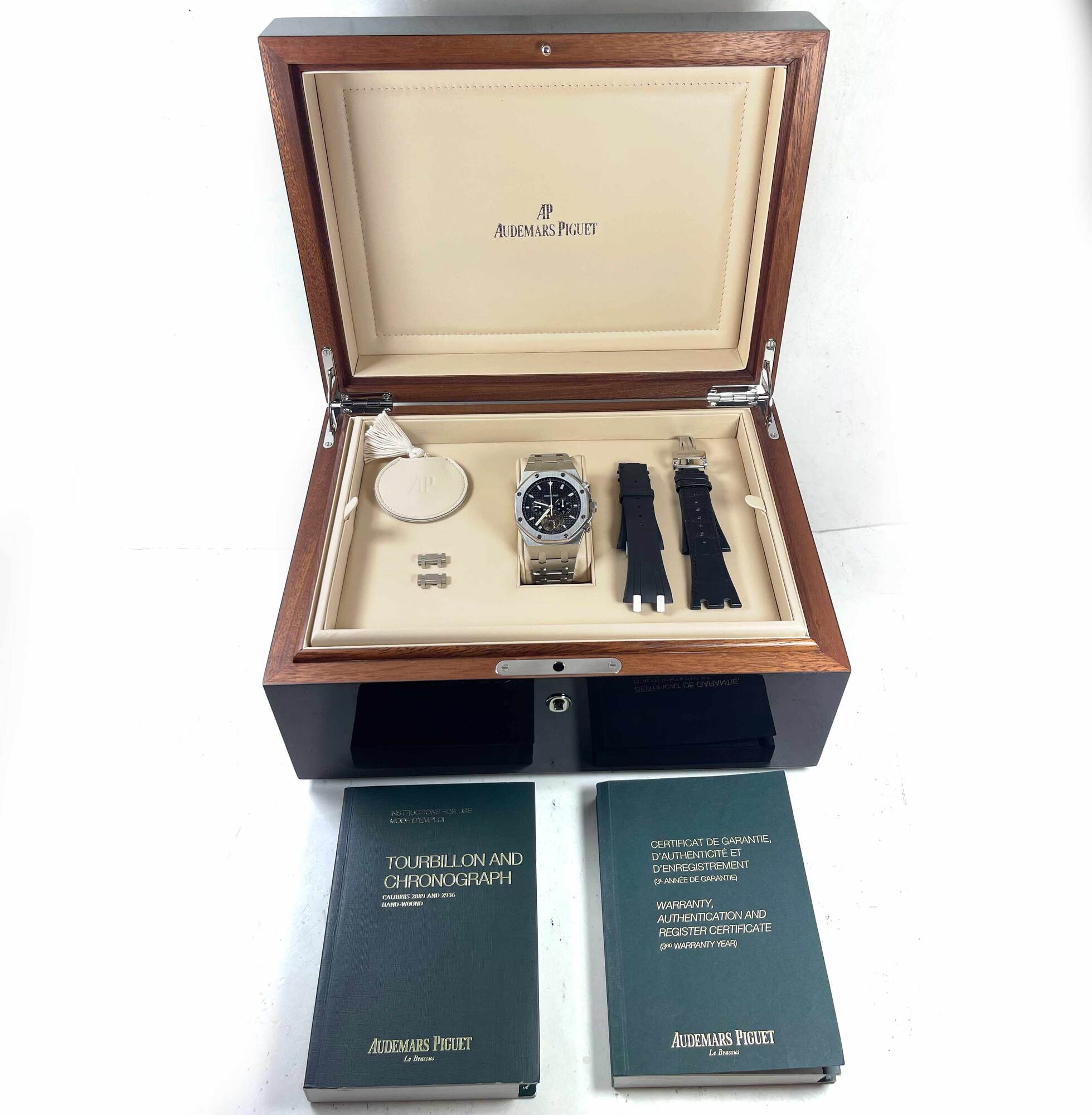THIS AUDEMARS PIGUET IS IN GREAT CONDITION SHOWING SOME NORMAL SIGNS OF WEAR ON THE CASE AND BRACELET CONSISTENT WITH PREOWNED WATCHES. THIS COMES WITH ITS BOX, BOOKLETS, SPARE LINKS, TWO ADDITIONAL STRAP, AND WARRANTY PAPER DATED OCTOBER 6TH, 2013 AS SHOWN...