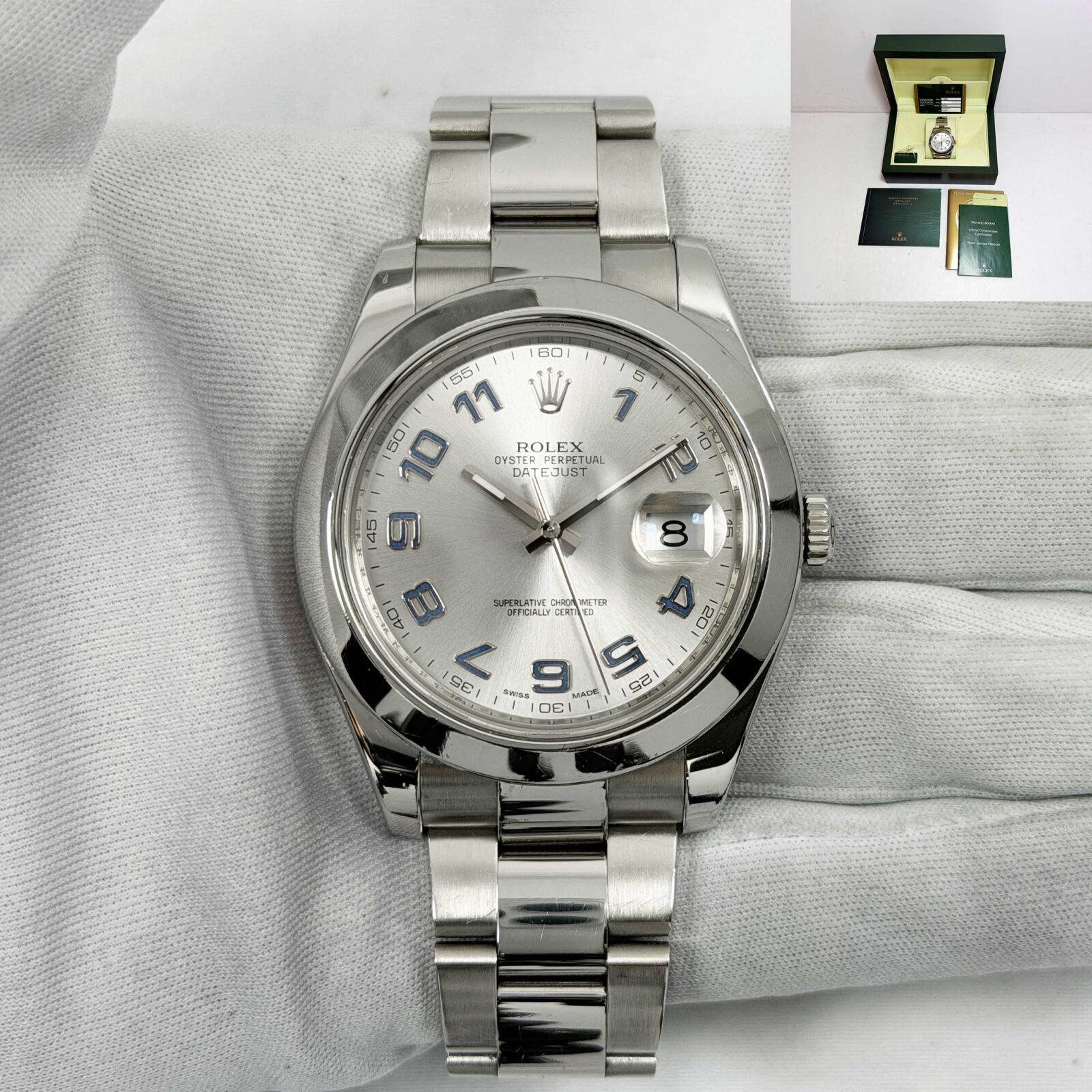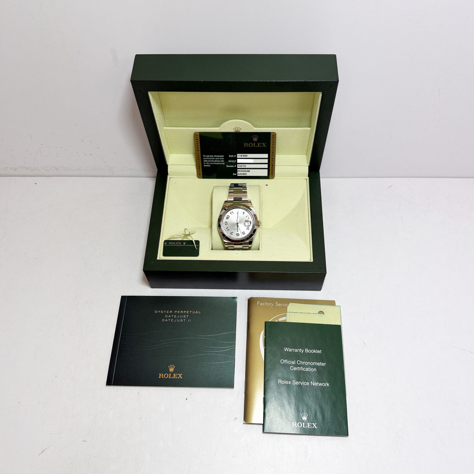 this rolex datejust ii watch comes with its box, booklets, service paper, hangtag, and warranty card dated november, 2013. The photos shown are of the exact watch being sold and accurately represent its condition. This watch is in stock and ready to ship immediately!