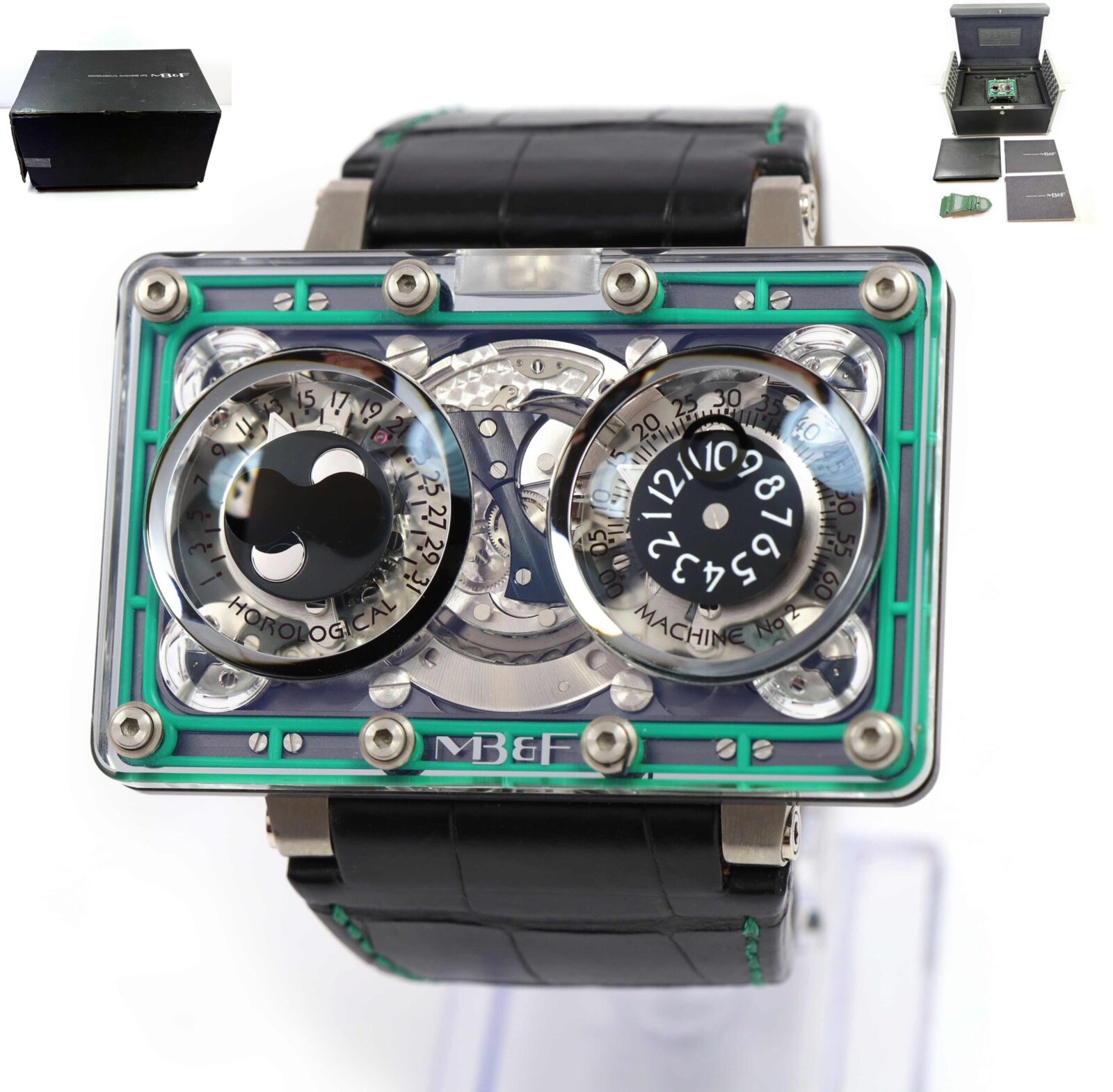 this mb&f watch is in excellent condition and comes with its box, booklets, one additional strap, and warranty paper dated january, 2015 as shown in the pictures attached. This watch is in stock and available to ship immediately!