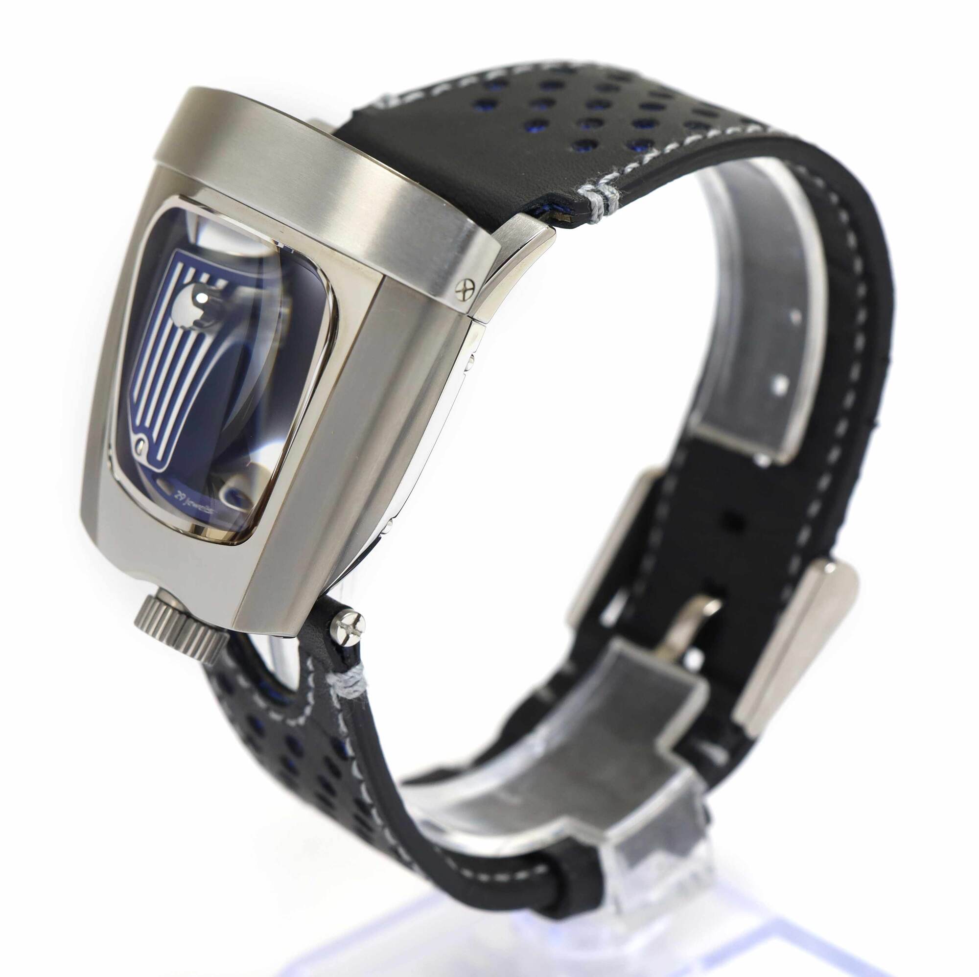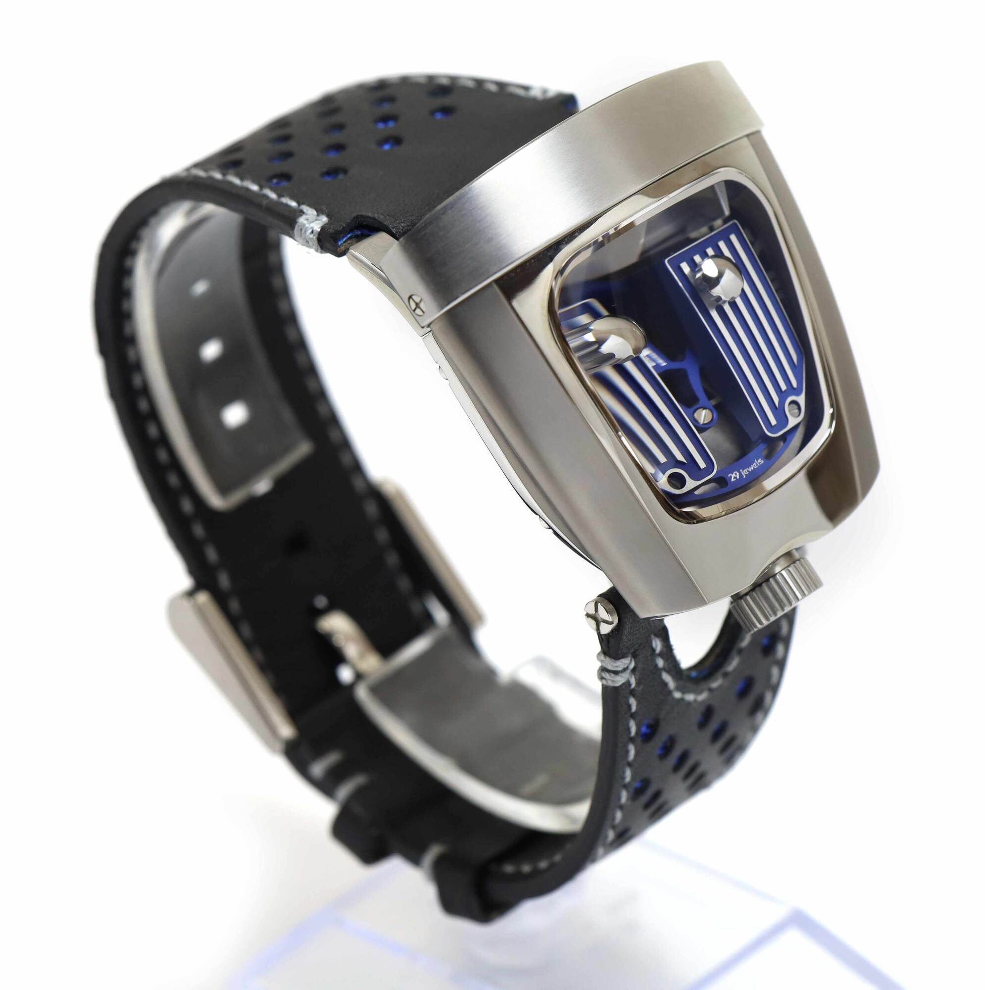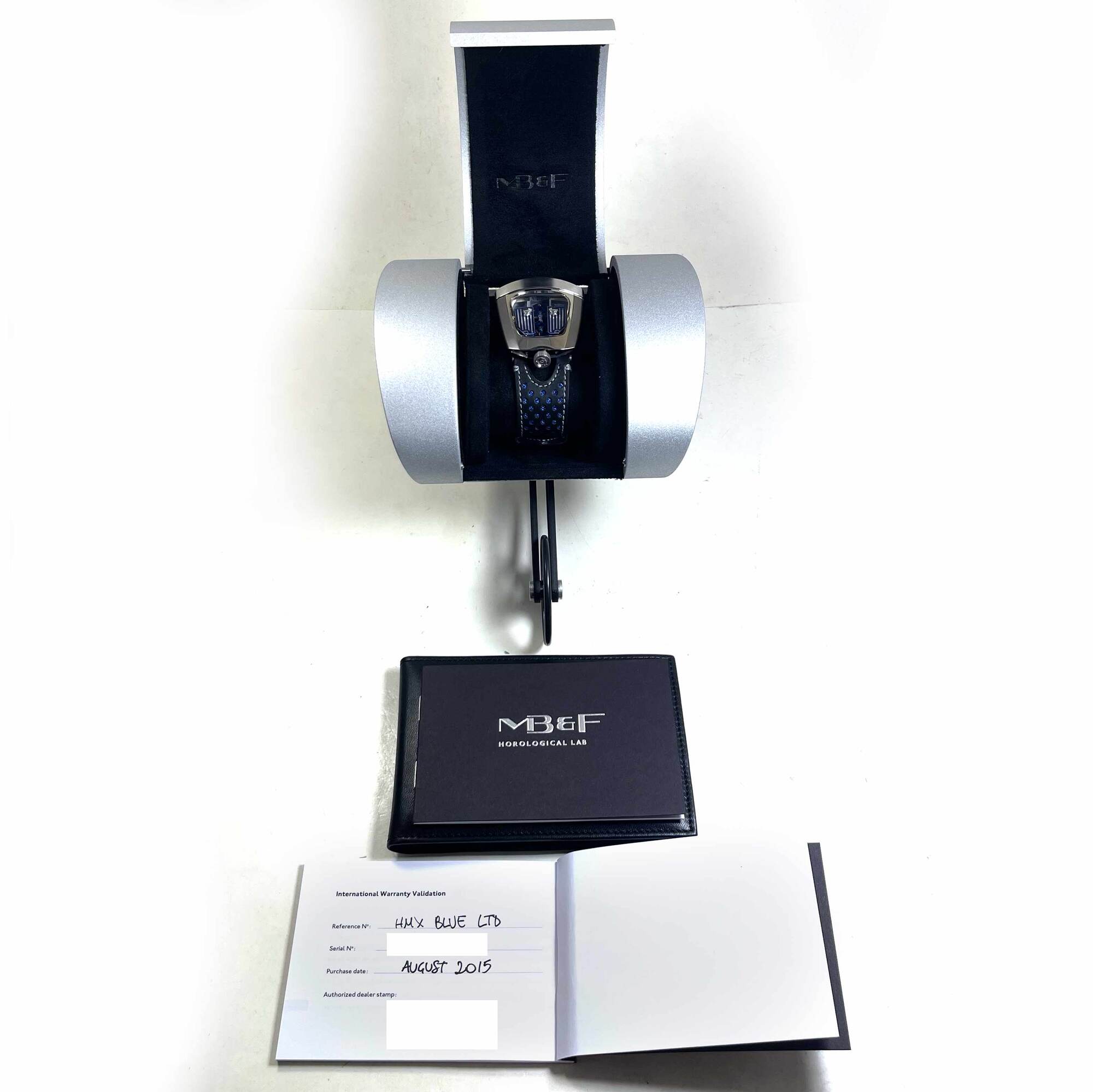 THIS MB&F WATCH IS NEW OLD STOCK AND COMES WITH ITS BOX, BOOKLETS, AND WARRANTY CARD DATED AUGUST, 2015 AS SHOWN IN THE PICTURES ATTACHED. THE HMX IS PART OF A LIMITED EDITION OF ONLY 20 PIECES IN GRADE 5 TITANIUM AND STAINLESS STEEL WITH THE BLUE DIAL....