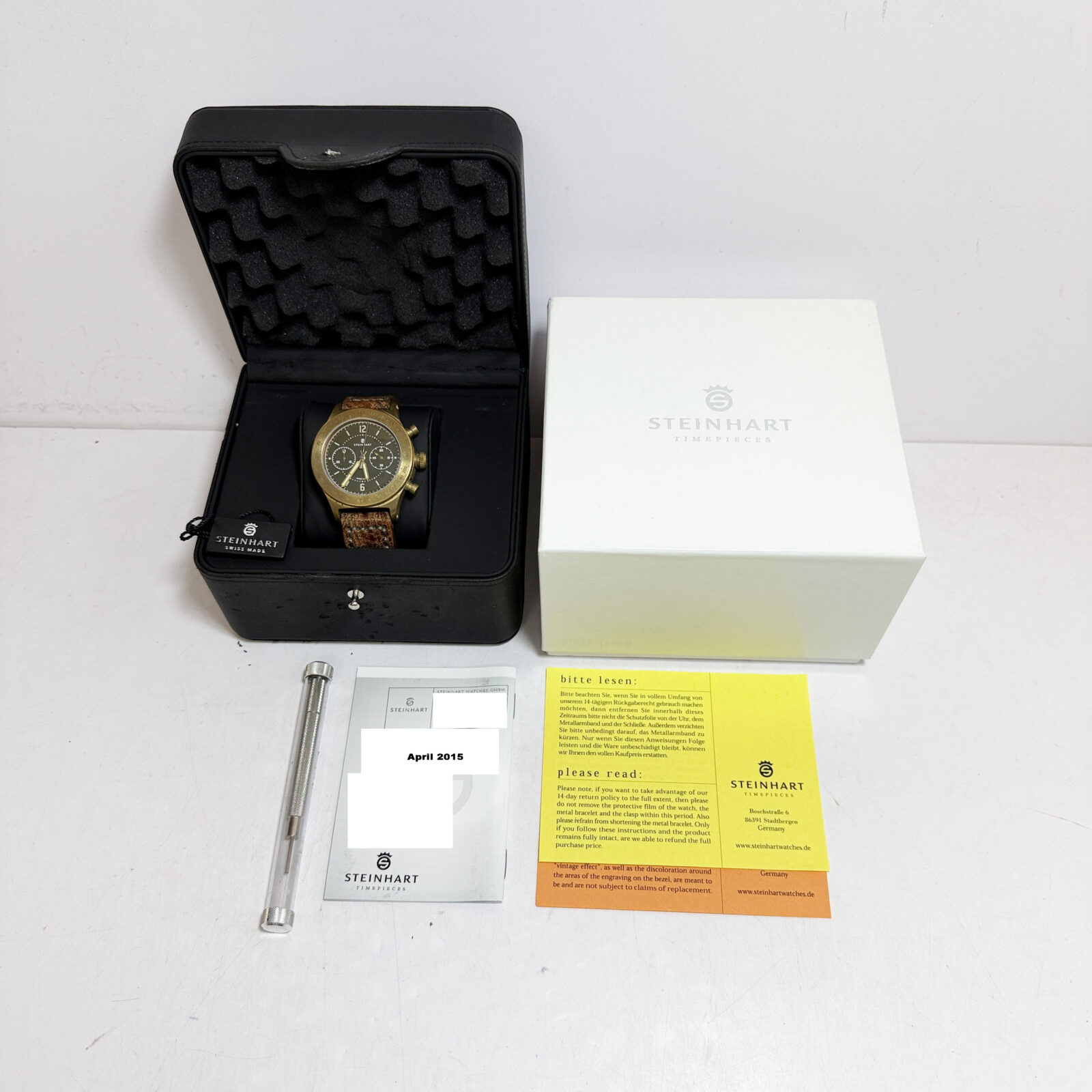 This Steinhart watch comes with its box, hangtag, pusher tool, papers, and warranty booklet dated April, 2015. The photos shown are of the exact watch being sold and accurately represent its condition. This watch is in stock and ready to ship immediately!