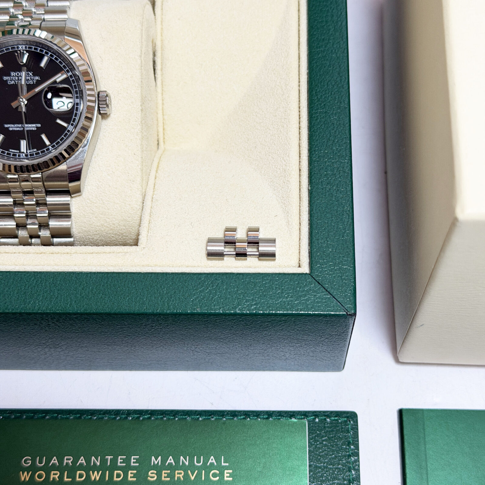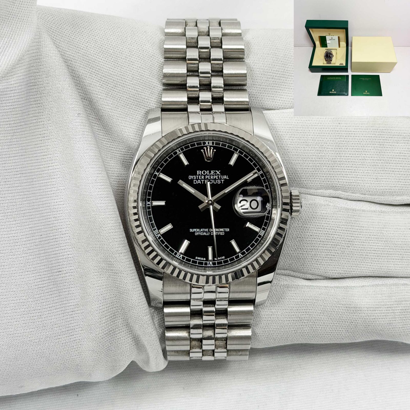 this rolex datejust watch comes with its box, booklets, hangtags, and warranty card dated december, 2016. The photos shown are of the exact watch being sold and accurately represent its condition. This watch is in stock and ready to ship immediately!