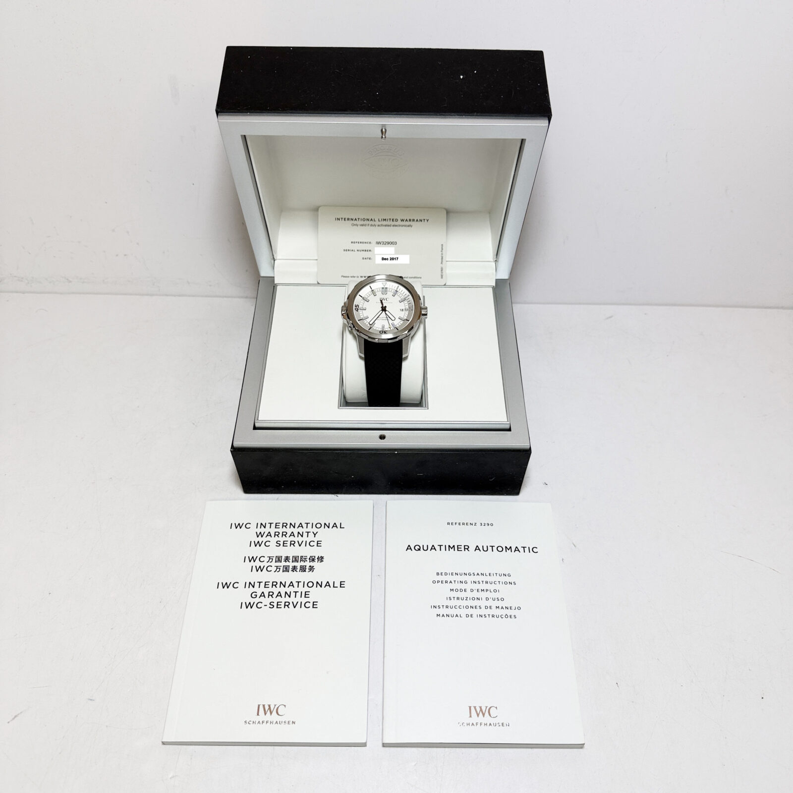This IWC watch comes with its box, booklets, and warranty card dated December, 2017. The photos shown are of the exact watch being sold and accurately represent its condition. This watch is in stock and ready to ship immediately!