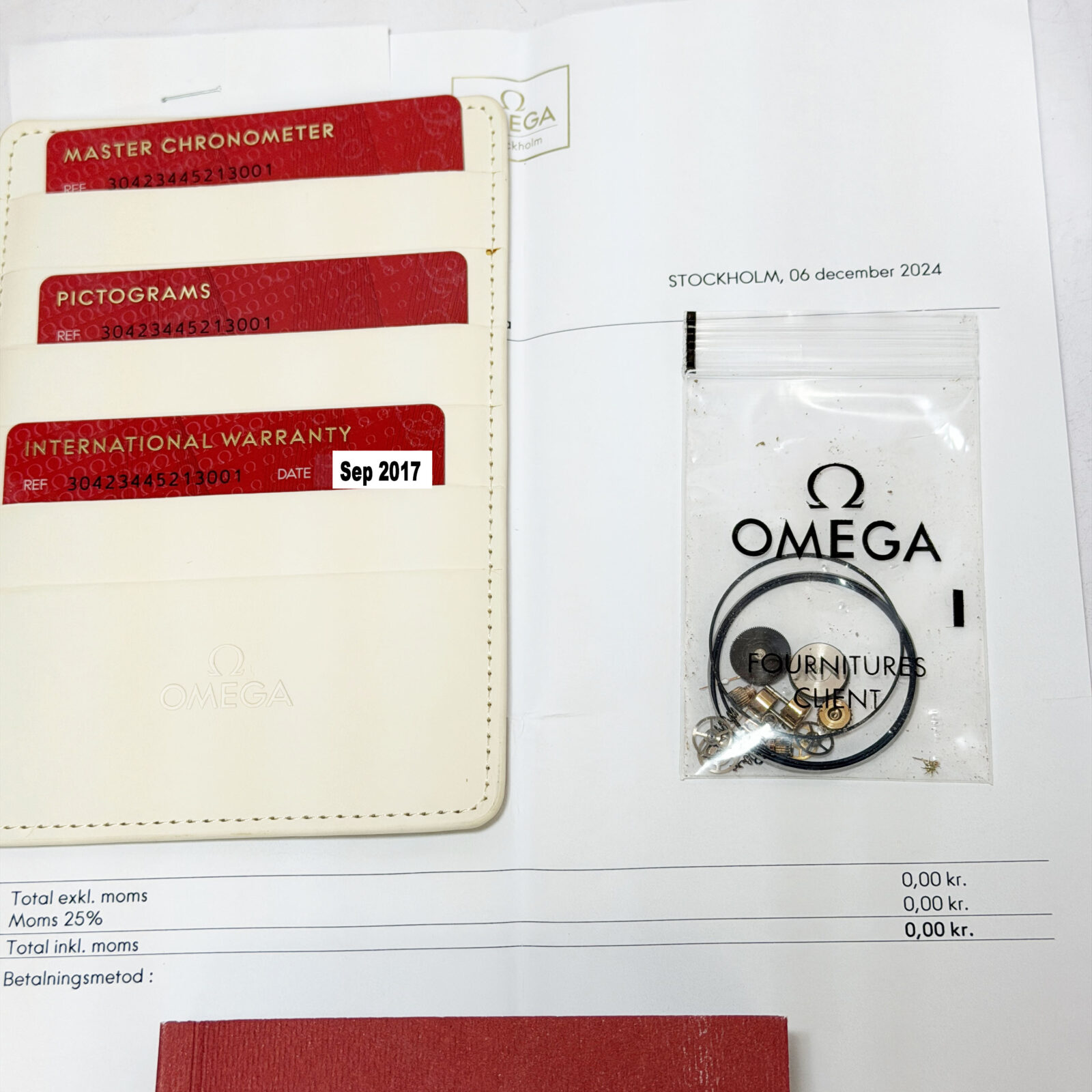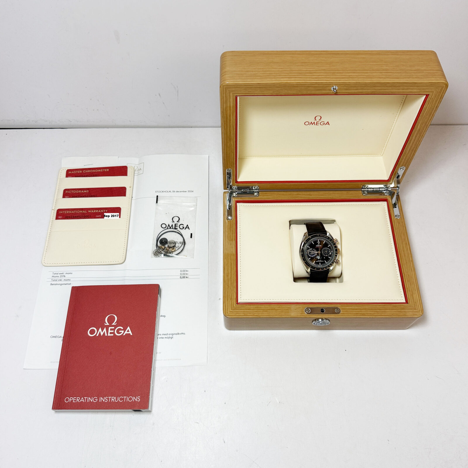 this omega speedmaster watch comes with its box, booklet, service paper, parts, and warranty card dated september, 2017. This watch was fully serviced on december 2024. The photos shown are of the exact watch being sold and accurately represent its condition. This watch is in stock and ready to ship immediately!