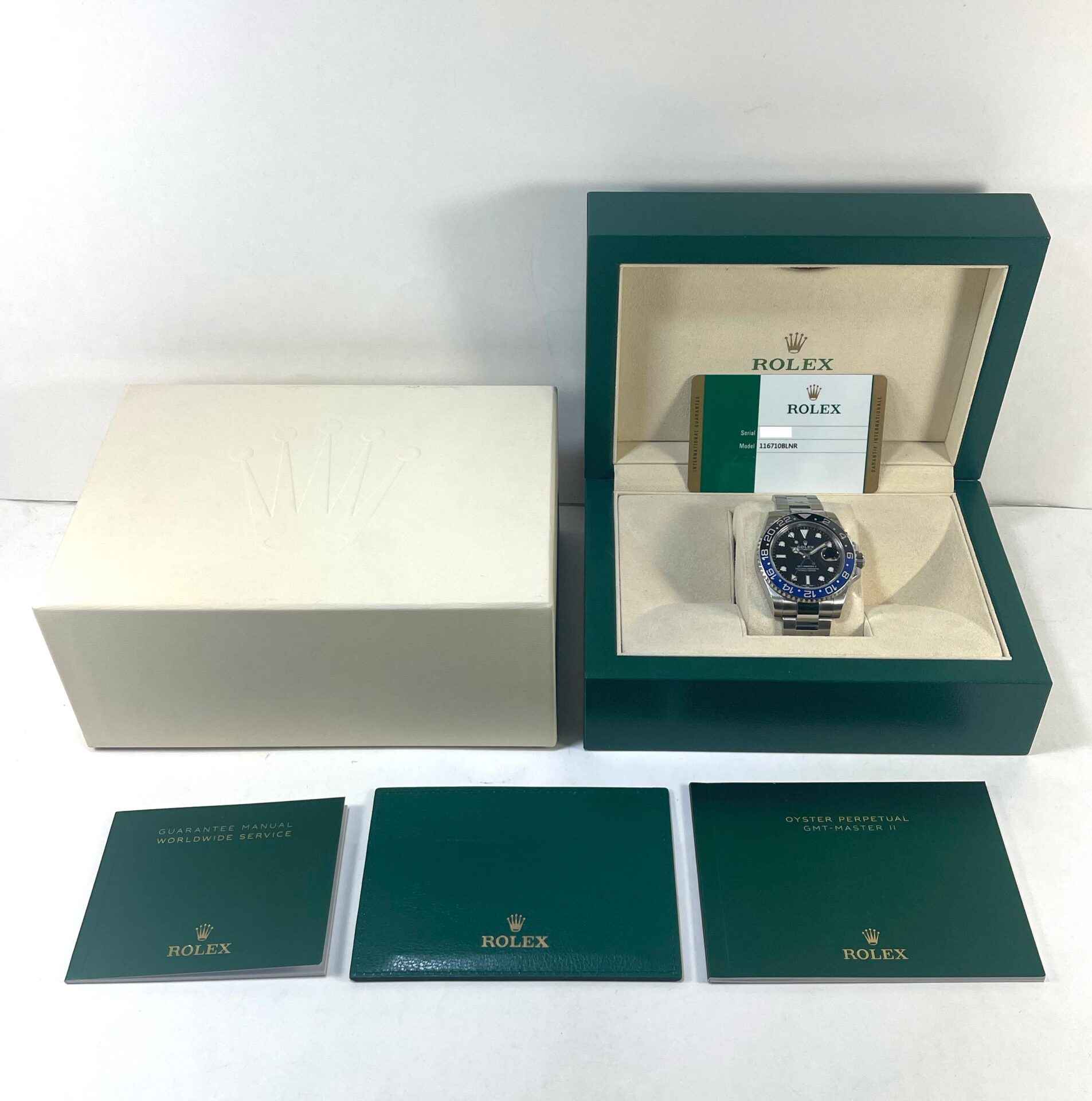 This Rolex Batman is in excellent condition and comes with box, papers, and warranty card dated April 6th, 2017. This watch is in stock and available to ship immediately!