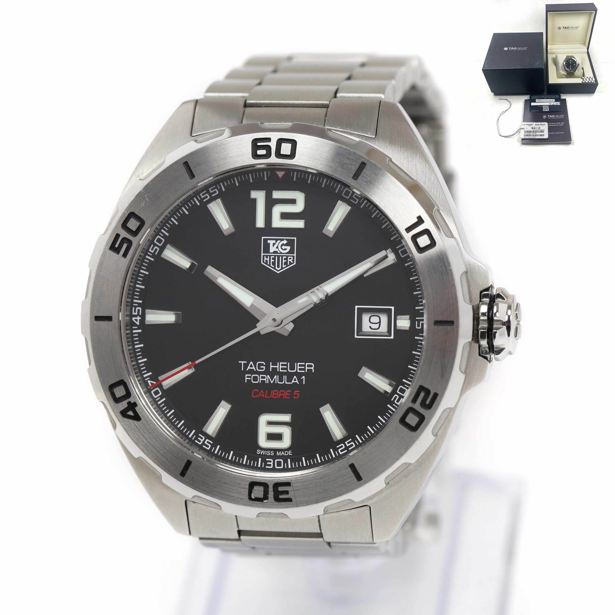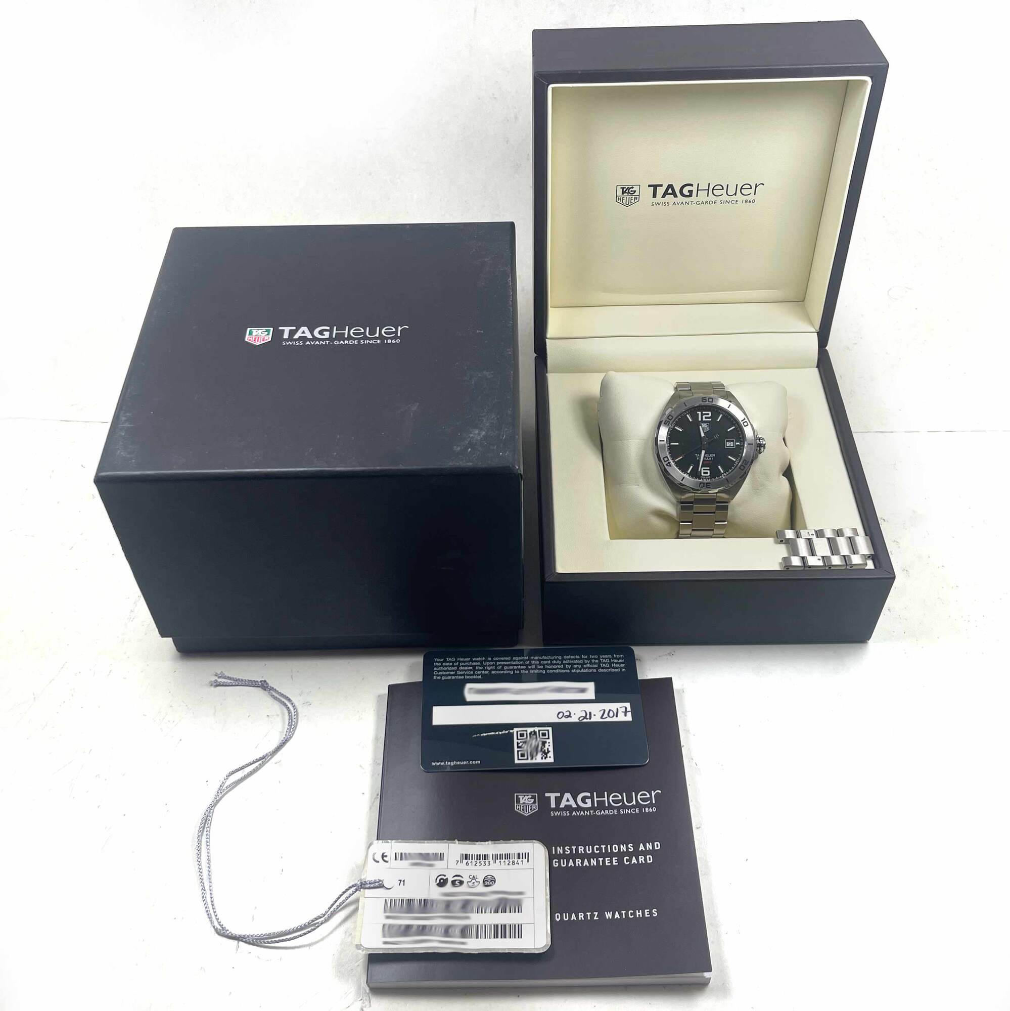 Read Morethis tag heuer watch is in great overall condition showing some signs of wear on the case and bracelet consistent with preowned watches. This comes with its box, booklet, hang tag, spare links, and warranty card dated february 21st, 2017. This watch is in stock and available to ship immediately!