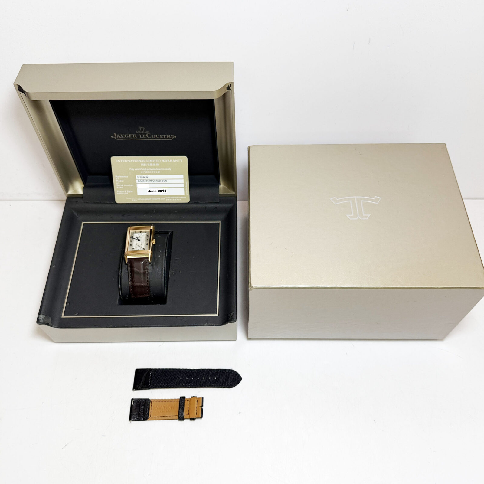 This Jaeger-LeCoultre watch comes with its box, extra straps, and warranty card dated June, 2018. The photos shown are of the exact watch being sold and accurately represent its condition. This watch is in stock and ready to ship immediately!