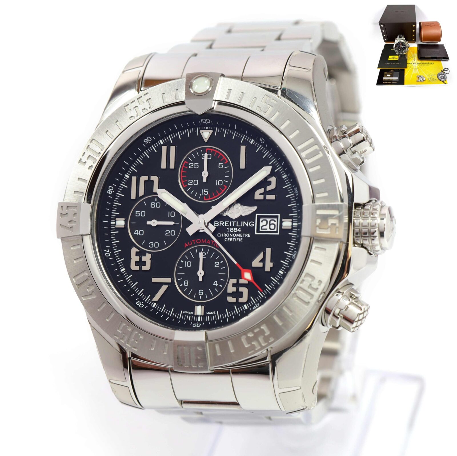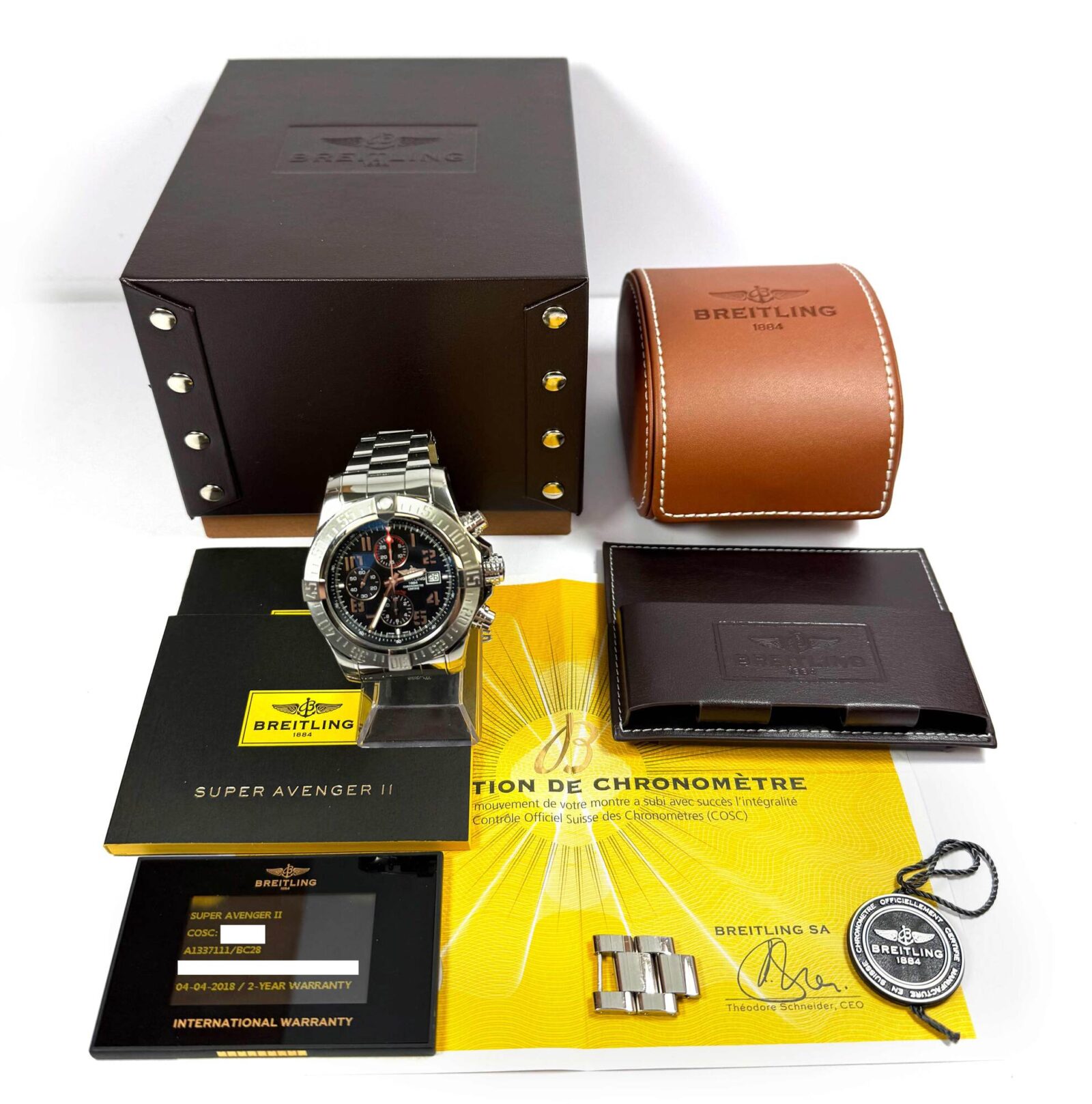 THIS BREITLING WATCH IS IN MINT, UNPOLISHED CONDITION AND COMES WITH ITS ORIGINAL BOX, BOOKLETS, HANG TAG, SPARE LINKS, AND WARRANTY CARD DATED APRIL 4TH, 2018, AS SHOWN IN THE ATTACHED PICTURES. WE PURCHASED THE WATCH FROM THE ORIGINAL OWNER, WHO NEVER REM...
