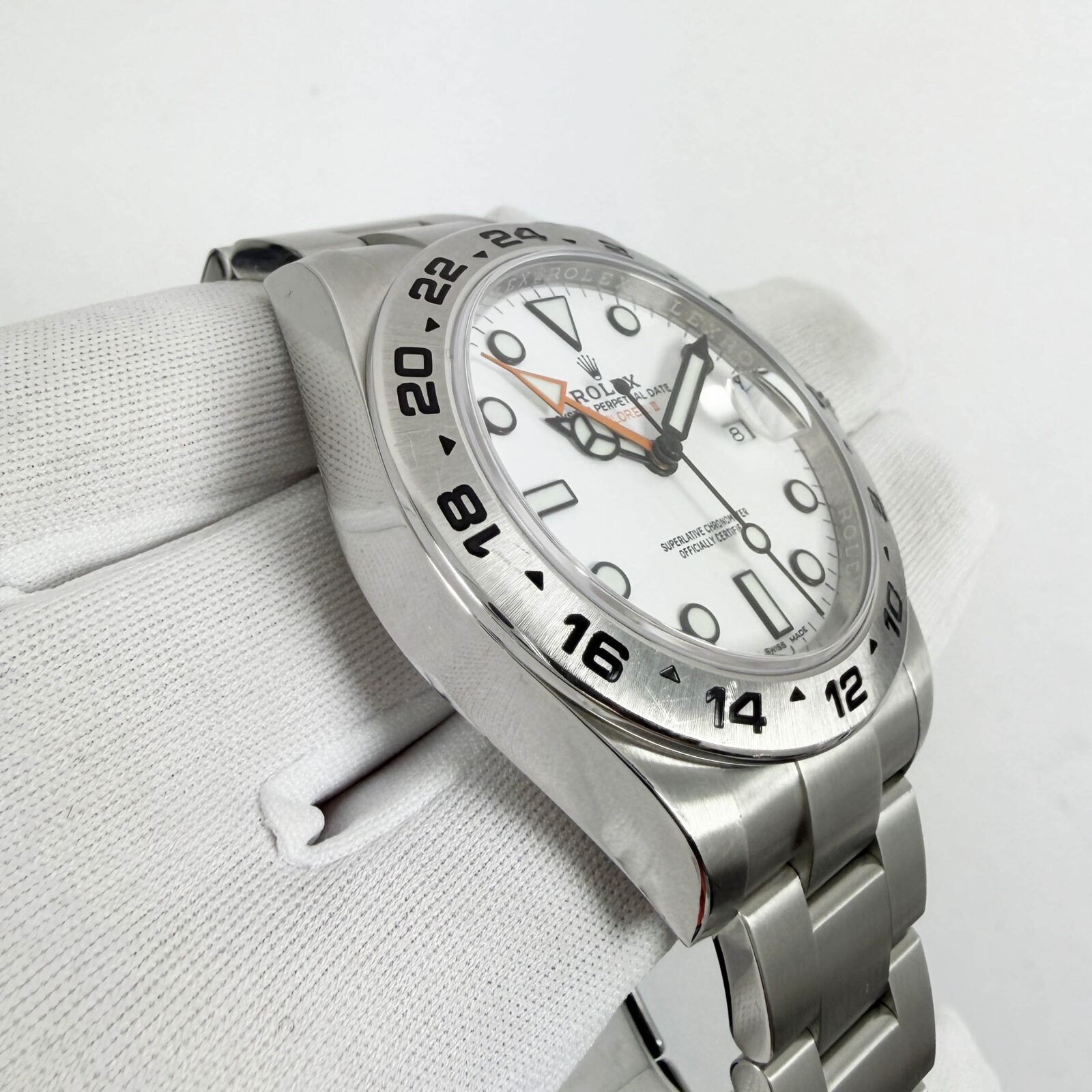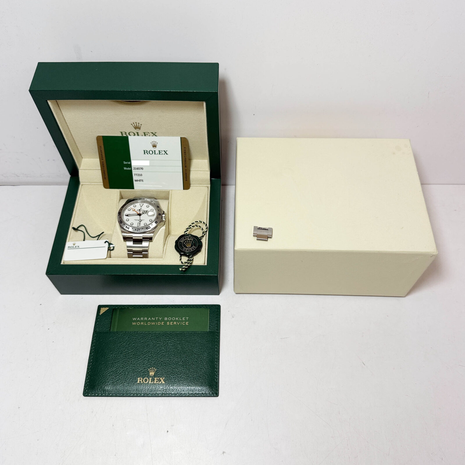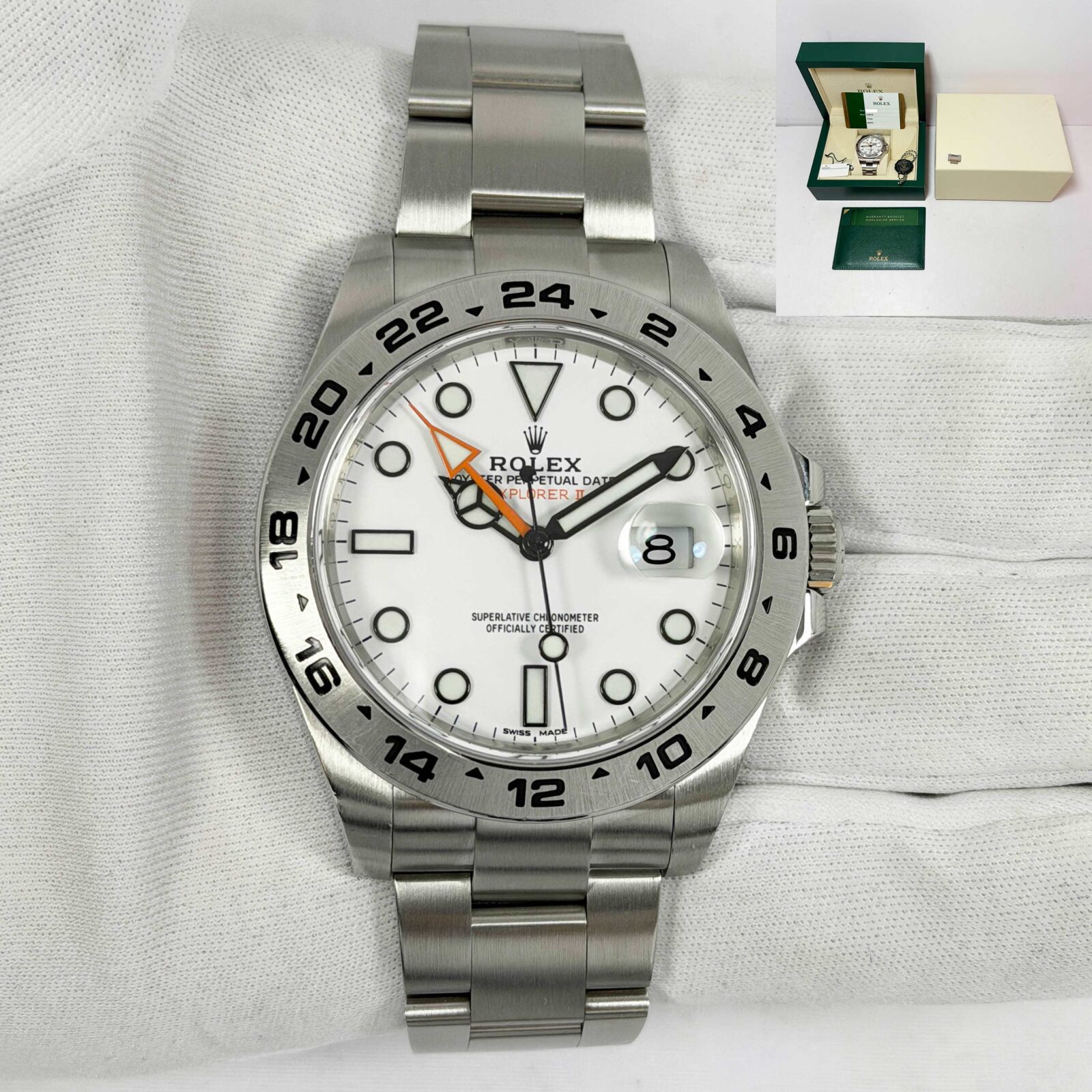 this rolex explorer ii watch comes with its box, hangtags, extra link, booklet, and warranty card dated april 18th, 2018. The photos shown are of the exact watch being sold and accurately represent its condition. This watch is in stock and ready to ship immediately!