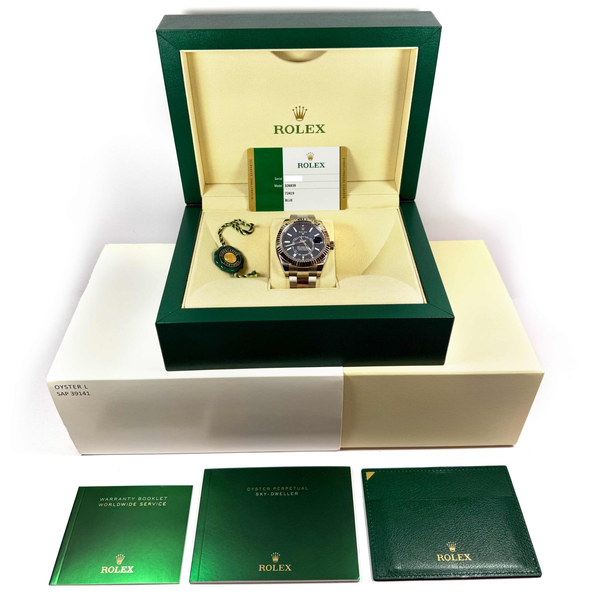 Read Morethis is possibly the rarest sky-dweller in existence. At first glance, it may appear to be a typical stainless steel version with a blue dial. However, this is actually a full white gold version, featuring a blue dial that is original to the watch, which can be verified by the warranty card reading “blue”. If you are viewing this listing, this will likely be the only time you’ll ever see this watch for sale in youir lifetime.