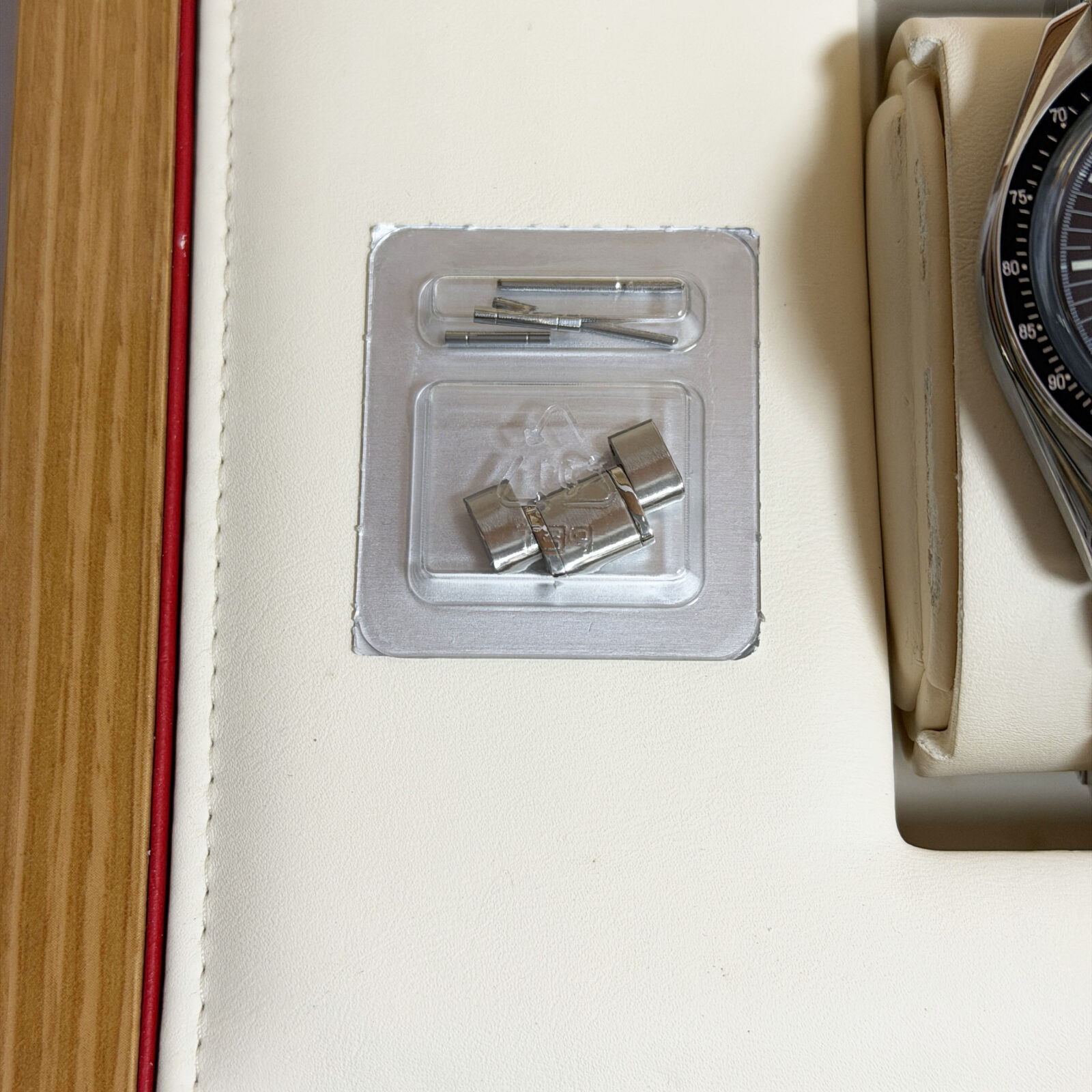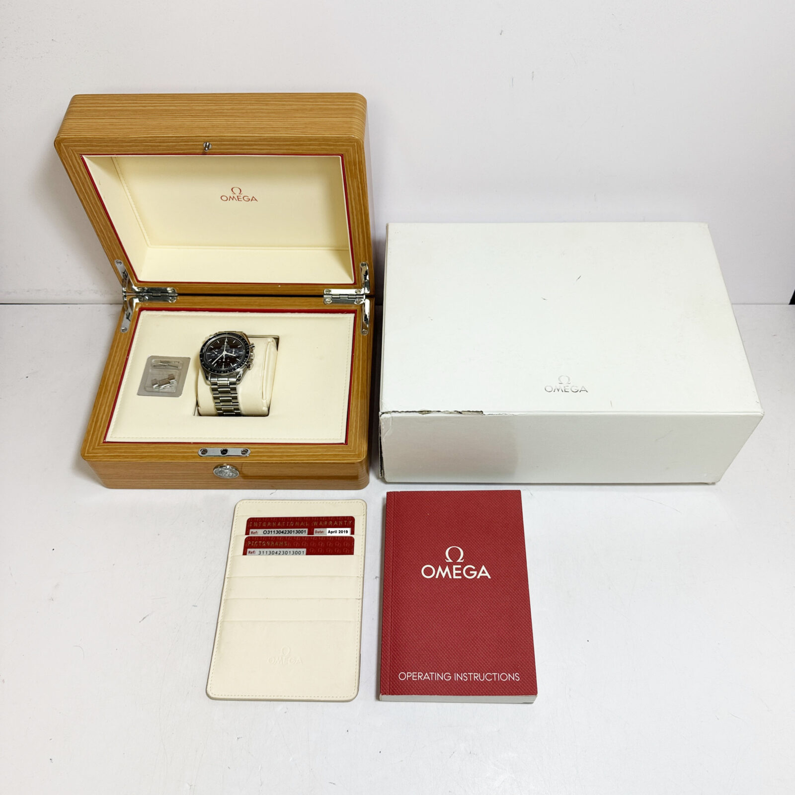 this omega speedmaster watch comes with its box, booklets, extra links, and warranty cards dated april 2019. The photos shown are of the exact watch being sold and accurately represent its condition. This watch is in stock and ready to ship immediately!