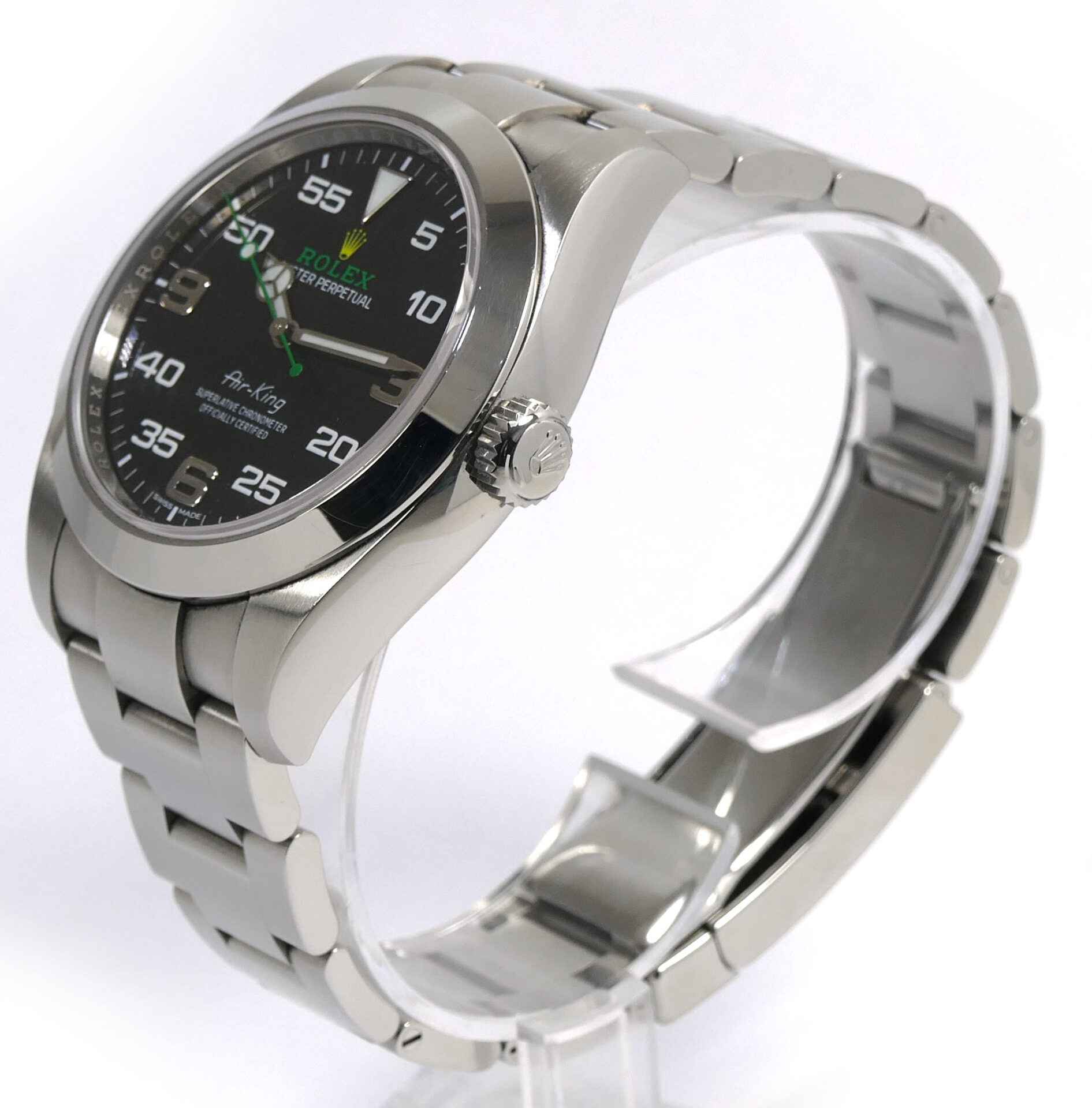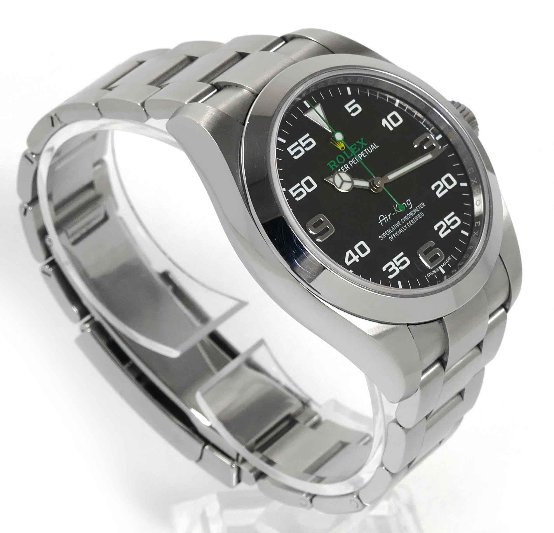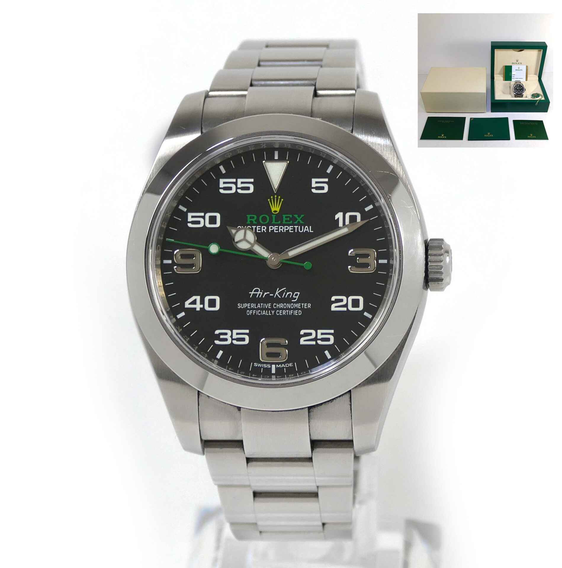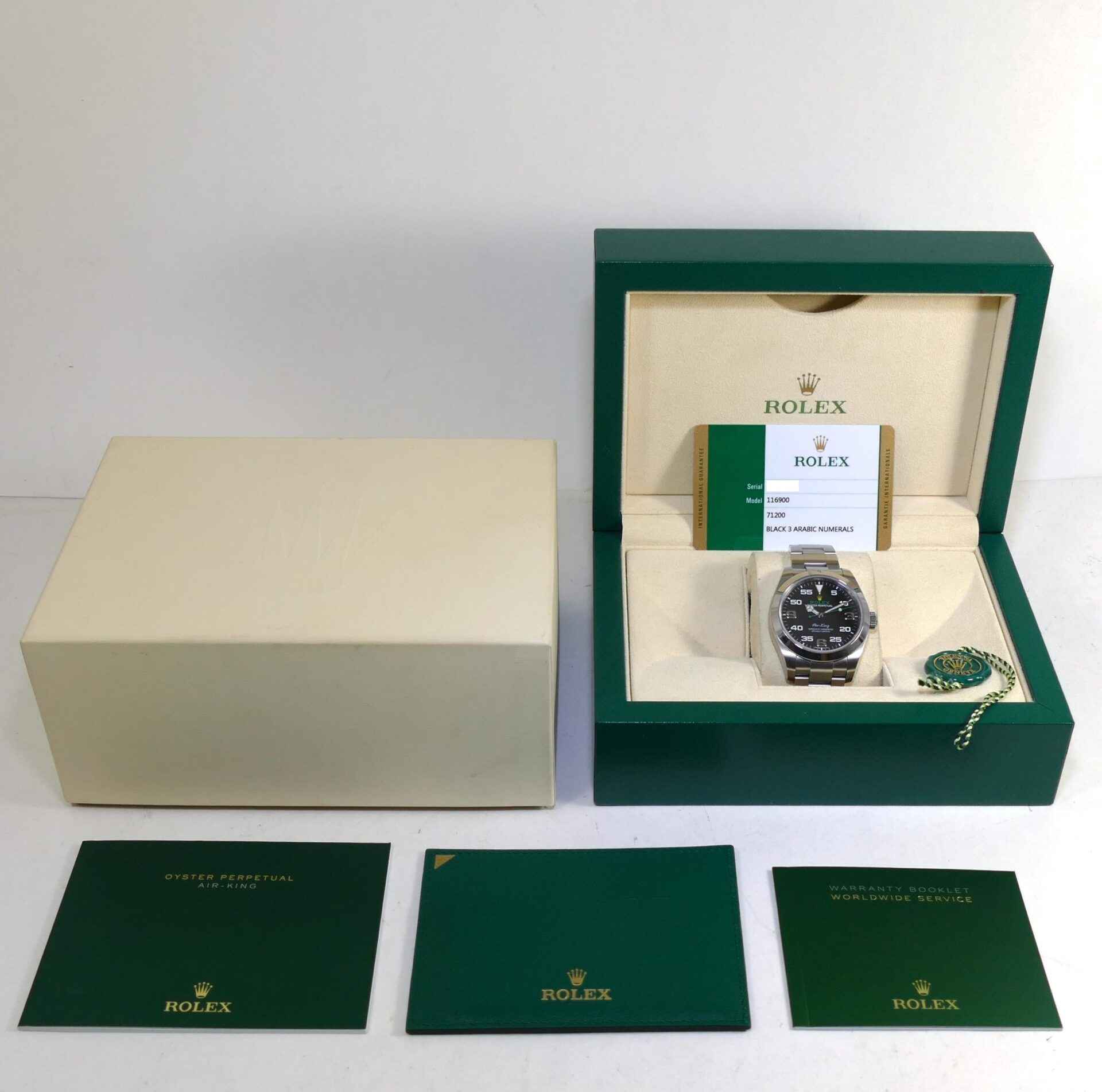 Read Morethis rolex air-king is excellent condition and comes with its complete set of box, papers, hang tag, and warranty card dated april 18th, 2019. The black arabic dial is original to the watch as indicated on the warranty certificate shown in the image attached. This watch is in stock and available to ship immediately!