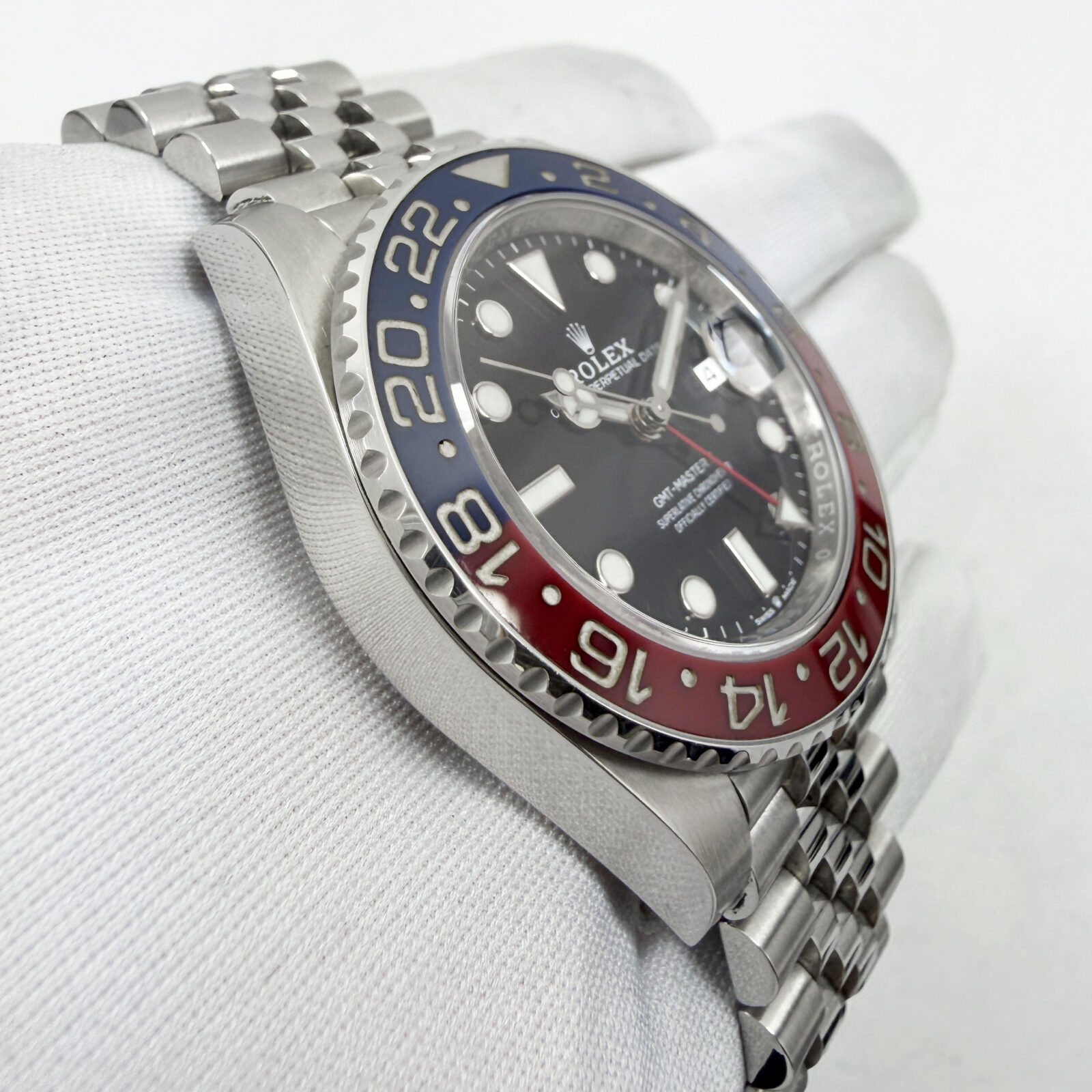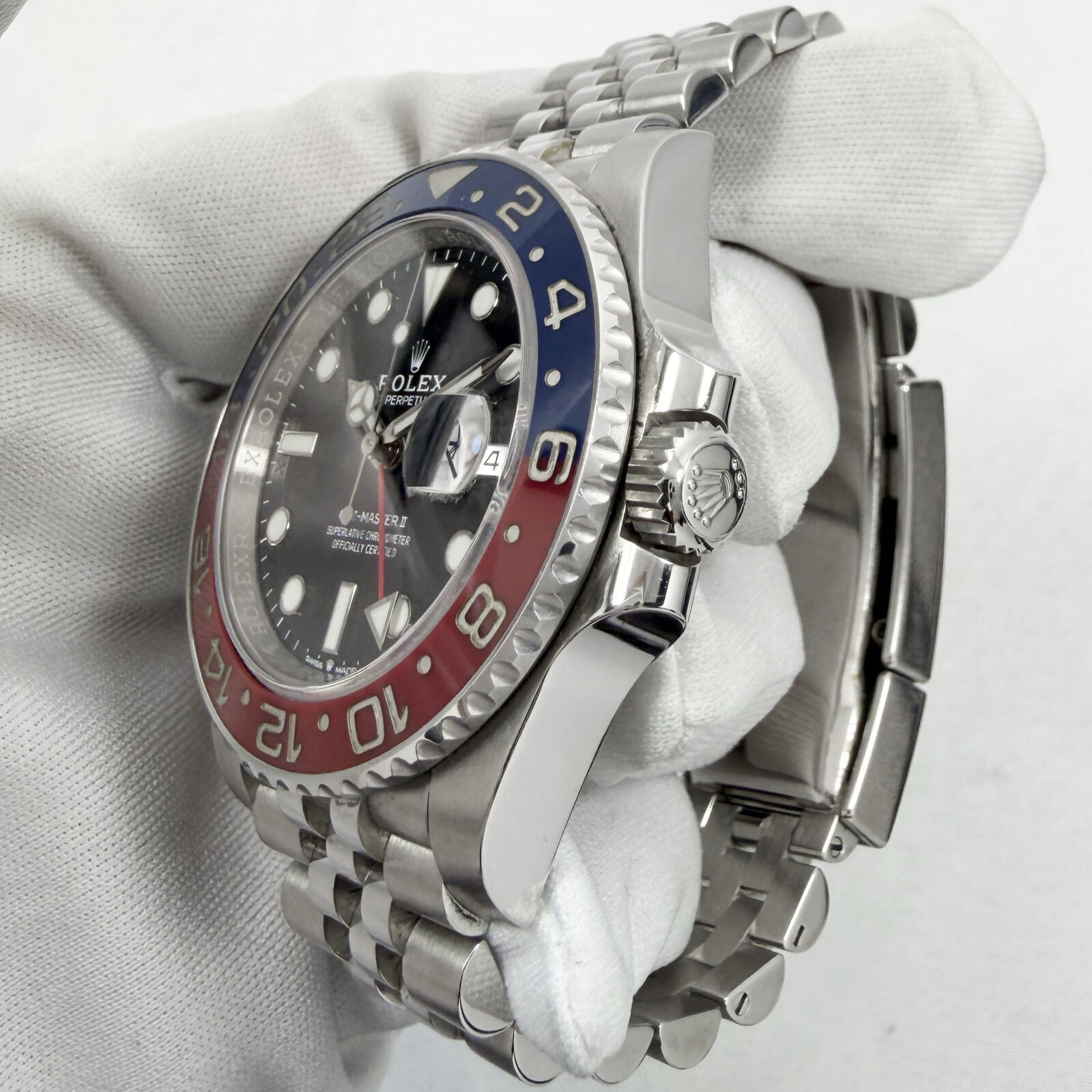 This Rolex GMT-Master II watch comes with its box, booklets, hangtags, extra links, and warranty card dated October, 2019. The photos shown are of the exact watch being sold and accurately represent its condition. This watch is in stock and ready to ship immed...
