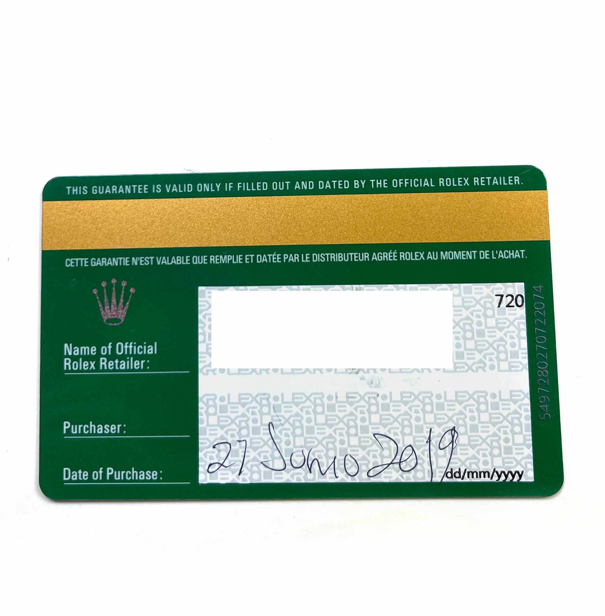 this rolex is in excellent condition and comes with its box, booklets, and warranty card dated june 27th, 2019 as shown in the pictures attached. This watch is in stock and available to ship immediately!